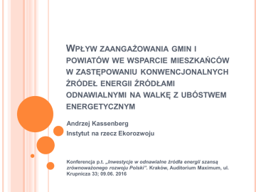 WPŁYW ZAANGAŻOWANIA GMIN I POWIATÓW WE WSPARCIE MIESZKAŃCÓW W ZASTĘPOWANIU KONWENCJONALNYCH ŹRÓDEŁ ENERGII ŹRÓDŁAMI ODNAWIALNYMI NA WALKĘ Z UBÓSTWEM ENERGETYCZNYM Andrzej Kassenberg Instytut na rzecz Ekorozwoju Konferencja p.t. „Inwestycje w odnawialne źródła energii szansą zrównoważonego rozwoju Polski”. Kraków, Auditorium Maximum, ul. Krupnicza 33; 09.06. 2016 CO TO JEST UBÓSTWO ENERGETYCZNE ? Trudność w utrzymaniu komfortowej temperatury i w spełnieniu innych podstawowych potrzeb energetycznych w domu/mieszkaniu za rozsądną cenę. Ubóstwo energetyczne występuje wtedy, gdy: nie ma środków, by opłacić rachunki zwłaszcza za ogrzewanie, rodziny nie stać na naprawę niedziałającego poprawnie system grzewczego lub zainstalować nowy; w domu czy mieszkaniu jest ciągle zimno i wilgotno, a mieszkańcy często z tego powodu chorują. ograniczone są możliwości podgrzania wody czy oświetlenia. ograniczone są możliwości korzystania z urządzeń domowych, takich jak: lodówka, pralka, kuchenka gazowa lub elektryczna, radio, telewizor, komputer i internet. A. Stępniak, A. Tomaszewska, Ubóstwo energetyczne a efektywność energetyczna. Analiza problemu i rekomendacje, Instytut na rzecz Ekorozwoju, Warszawa 2014. w interesie przyszłych pokoleń KIEDY GOSPODARSTWO DOMOWE JEST UBOGIE ENERGETYCZNIE WG W. BRYTANII Aby uznać gospodarstwo domowe za ubogie energetycznie muszą zostać spełnione dwa warunki: dochody gospodarstwa domowego (pomniejszone o konieczne wydatki na cele mieszkaniowe) poniżej progu ubóstwa (60% mediany dochodów rozporządzalnych w kraju); modelowe wydatki energetyczne powyżej mediany w kraju. D. Owczarek, A. Miazga. Ubóstwo energetyczne w Polsce – definicja i charakterystyka społeczna grupy. Instytuty na rzecz Ekorozwoju. Warszawa 2015. w interesie przyszłych pokoleń UBÓSTWO ENERGETYCZNE WG TYPU BIOLOGICZNEGO GOSPODARSTWA DOMOWEGO [%] Skala ogólna to - 17,9% tj. 6 735 415 osób samotny rodzic z dziećmi 16,6 rodzice, dzieci i inne osoby 22,0 9,8 małżeństwo z 2 i więcej dzieci jednoosobowe 20,9 12,9 14,8 20,0 małżeństwo z 1 dzieckiem małżeństwo bez dzieci pozostałe D. Owczarek, A. Miazga. Ubóstwo energetyczne w Polsce – definicja i charakterystyka społeczna grupy. Instytuty na rzecz Ekorozwoju. Warszawa 2015. w interesie przyszłych pokoleń UBÓSTWO ENERGETYCZNE WG GRUP SPOŁECZNO- EKONOMICZNYCH [%] Skala ogólna to - 17,9% tj. 6 735 415 osób Utrzymujący się ze świadczeń społecznych 14,5 Renciści 7,2 36,7 Utrzymujący się z pozostałych niezarobkowych źródeł 19,5 Pracownicy na stanowiskach robotniczych 20,8 31,7 Rolnicy i utrzymujący się z samozatrudnienia 24,3 Emeryci Pracownicy na stanowiskach nierobotniczych D. Owczarek, A. Miazga. Ubóstwo energetyczne w Polsce – definicja i charakterystyka społeczna grupy. Instytuty na rzecz Ekorozwoju. Warszawa 2015. w interesie przyszłych pokoleń POZIOM UBÓSTWA ENERGETYCZNEGO W WG WOJEWÓDZTW W 2013 ROKU [%] 30 25 20 15 10 5 0 D. Owczarek, A. Miazga. Ubóstwo energetyczne w Polsce – definicja i charakterystyka społeczna grupy. Instytuty na rzecz Ekorozwoju. Warszawa 2015. w interesie przyszłych pokoleń PL KIERUNKI DZIAŁAŃ OGRANICZAJĄCYCH SKALE UBÓSTWA ENERGETYCZNEGO działania nakierowane na rozwiązanie problemu technicznego – termomodernizacja budynków, wymiana urządzeń energochłonnych, zmiana nośnika energii itp.; działania nakierowane na rozwiązanie problemu ekonomicznego – pomoc gospodarstwom zagrożonym ubóstwem energetycznym w radzeniu sobie z aktualnymi wydatkami na cele energetyczne; działania nakierowane na rozwiązanie problemu postaw wobec efektywnego wykorzystania energii - edukacyjne podnoszące poziom wiedzy i umiejętności obsługi urządzeń zasilanych energią, dostarczanie informacji potrzebnych przy wyborze i zakupie sprzętów efektywnych energetycznie, przy modernizacji i obsłudze systemu grzewczego. A. Węglarz, G. Kubalski, D. Owczarek, „Propozycje mechanizmów wsparcia procesu przeciwdziałania zjawisku ubóstwa energetycznego w Polsce”, Instytut na rzecz Ekorozwoju, Warszawa 2014. w interesie przyszłych pokoleń INSTRUMENTY SŁUŻĄCE PRZECIWDZIAŁANIU UBÓSTWU ENERGETYCZNYM NA POZIOMIE KRAJOWYM - PROPOZYCJE wykorzystanie mechanizmu białych certyfikatów modyfikacja premii termomodernizacyjnej wprowadzenie grantów przeznaczonych na poprawę efektywności energetycznej budynków mieszkalnych wprowadzenie mechanizmu gwarancji finansowych dla ubogich podmiotów finansowanie inwestycji w efektywność energetyczną i OZE za pośrednictwem organizacji pozarządowych. weryfikacja funkcjonowania mechanizmu dodatku energetycznego. mechanizm wsparcia procesu wychodzenia z ubóstwa energetycznego dla bezrobotnych A. Węglarz, G. Kubalski, D. Owczarek, „Propozycje mechanizmów wsparcia procesu przeciwdziałania zjawisku ubóstwa energetycznego w Polsce”, Instytut na rzecz Ekorozwoju, Warszawa 2014. w interesie przyszłych pokoleń ROZPOZNANIE ZJAWISKA NA POZIOMIE LOKALNYM Z niespełna 2500 gmin polskich na ankietę odpowiedziało około 35%, a w większości formularzy wiele pytań pominięto – średnie rozpoznanie jest na poziomie 9,24%. Zakładając, że brak odpowiedzi z 65% gmin oznacza brak wiedzy na ten temat, szacuje się, że jedynie 2,8% gmin posiada wstępną wiedzę w zakresie odpowiedniej diagnozy problemu na swoim terenie. M. Pyka, S. Liszka, J. Czajkowski, M. Kukla, Ubóstwo energetyczne. Wyniki badania ankietowego oraz propozycje dotyczące pomocy osobom ubogim energetycznie, Fundacja na rzecz Efektywnego Wykorzystania Energii i Instytut na rzecz Ekorozwoju, Katowice-Warszawa 2014 w interesie przyszłych pokoleń MOŻLIWOŚCI WYKORZYSTANIA OZE NA POZIOMIE LOKALNYM DO PRZECIWDZIAŁANIA UBÓSTWU ENERGETYCZNEMU udzielania wsparcia finansowego w skali większej niż standardowo (do 100%); skierowanie doradztwa w pierwszej kolejności do rodzin ubogich energetycznie i z rodzin ubogich 