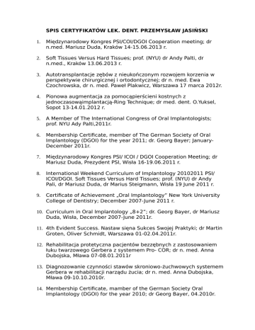SPIS CERTYFIKATÓW LEK. DENT. PRZEMYSŁAW JASIŃSKI 1. Międzynarodowy Kongres PSI/COI/DGOI Cooperation meeting; dr n.med. Mariusz Duda, Kraków 14-15.06.2013 r. 2. Soft Tissues Versus Hard Tissues; prof. (NYU) dr Andy Palti, dr n.med., Kraków 13.06.2013 r. 3. Autotransplantacje zębów z nieukończonym rozwojem korzenia w perspektywie chirurgicznej i ortodontycznej; dr n. med. Ewa Czochrowska, dr n. med. Paweł Plakwicz, Warszawa 17 marca 2012r. 4. Pionowa augmentacja za pomocąpierścieni kostnych z jednoczasowąimplantacją-Ring Technique; dr med. dent. O.Yuksel, Sopot 13-14.01.2012 r. 5. A Member of The International Congress of Oral Implantologists; prof. NYU Ady Palti,2011r. 6. Membership Certificate, member of The German Society of Oral Implantology (DGOI) for the year 2011; dr. Georg Bayer; JanuaryDecember 2011r. 7. Międzynarodowy Kongres PSI/ ICOI / DGOI Cooperation Meeting; dr Mariusz Duda, Prezydent PSI, Wisła 16-19.06.2011 r. 8. International Weekend Curriculum of Implantology 20102011 PSI/ ICOI/DGOI. Soft Tissues Versus Hard Tissues; prof. (NYU) dr Andy Pali, dr Mariusz Duda, dr Marius Steigmann, Wisła 19 June 2011 r. 9. Certificate of Achievement „Oral Implantology” New York University College of Dentistry; December 2007-June 2011 r. 10. Curriculum in Oral Implantology „8+2”; dr. Georg Bayer, dr Mariusz Duda, Wisła, December 2007-June 2011r. 11. 4th Evident Success. Nastaw sięna Sukces Swojej Praktyki; dr Martin Groten, Oliver Schmidt, Warszawa 01-02.04.2011r. 12. Rehabilitacja protetyczna pacjentów bezzębnych z zastosowaniem łuku twarzowego Gerbera z systemem Pro- COR; dr n. med. Anna Dubojska, Mława 07-08.01.2011r 13. Diagnozowanie czynności stawów skroniowo-żuchwowych systemem Gerbera w rehabilitacji narządu żucia; dr n. med. Anna Dubojska, Mława 09-10.10.2010r. 14. Membership Certificate, mamber of the German Society Oral Implantology (DGOI) for the year 2010; dr Georg Bayer, 04.2010r. 15. Member of The International Congres of Oral Implantologists; prof. NYU Ady Palti, 2010r. 16. Curriculum in Oral Implantology „8+2”,November 2007-December 2009r. 17. Intensivtraining und Live OP mit dem Implantatsystem prowital; Ruediger Meyer,Piotr Górski, dr Maciej Miczek, Sopot 04-05.12.2009r. 18. Międzynarodowy Kongres PolskiegoTowarzystwa Implantologicznego PSI/ICOI/DGOI Cooperation Meeting; prof. dr Andy Pali, prof. de Hubertus Nentwig, Wisła 15-16.05.2009r. 19. Fellow of the German Society of Oral Implantology; prof. NYU Andy Palti, prof. dr dr Joachim Zoller, dr Georg Bayer, Wisła 14.05.2009r. 20. Fellow of the International Congress of Oral Implantologists; prof. NYU Andy Palti, Wisła 14.05.2009r. 21. Expert in Oral Implantology of the German Society of Oral implantology (DGOI); prof. NYU Ady Palti, prof. dr dr Joachim Zoller, dr Geprg Bayer, Wisła 14.05.2009r. 22. The International Congress of Oral Implantologists; Wisła 14.05.2009r. 23. Certyfikat Umiejętności Implantologicznej PSI, uzyskanie tytułu lekarza implantologa, eksperta ds. implantologii stomatologicznej; prof. dr hab. n. med. T. Cieślik, prof. dr hab. n. med. M. Romanowicz, lek. med. W. Majewski, dr n. med. M. Duda, Wisła 14.05.2009r. 24. Augmentacja wyrostka zębodołowego na szerokośći wysokośćw implantologii stomatologicznej; prof. dr NYU Ady Palti, Wisła 14.05.2009r. 25. Obciążenie natychmiastowe czy poszerzona diagnostyka funkcjonalna; dr Thomas Schindler, Wisła 14.05.2009r. 26. Osteointegration Implants Modality for oral and maxillofacial rehabilitation, The International Research & Development Institute Of Alpha-Bio,2009r. 27. Ochrona radiologiczna pacjenta; Pruszcz Gdański 07-15.03.2009r. 28. Curriculum Implantologii Polskiego Stowarzyszenia Implantologicznego 2008/2009. 29. Kotwienie w ortodoncji przy użyciu mini śrub; prof. Stefano Velo, Warszawa 13.09.2008r. 30. Sesja Naukowa V Międzynarodowego Kongresu polskiego Stowarzyszenia Implantologicznego; prof. dr hab. Piotr Arkuszewski, prof. dr hab. Maciej Romanowicz, Bronisławów 26-27.10.2007r. 31. Kurs protetyczny z systemu Ankylos; MDT Thomas Schussler, Warszawa 07.07.2007r. 32. Evident Success Congress Warsaw; dr G. Bayer, dr D. Weng, MDT B. Roland, prof. dr M.Lorenzoni, dr K.Chmielewski, Warszawa 21.04.2007r. 33. Implanty – udokumentowany sukces; doc. dr hab. n. med. L. Wagner, Warszawa 21.04.2007r. 34. Membership Certificate, member of the German Society of Oral Implantology (DGOI) for the year 2007; Kraichtal, 04.2007r. 35. Esthetics and function current concepts of the Friadent Implant System XIVE; dr Peter Gehrke, dr Jorg Nonhoff, Mannheim 16-18.02.2007r. 36. Certyfikat uczestnictwa w zaawansowanym kursie chirurgicznym w charakterze obserwatora; dr Piotr Majewski, Kraków 25.11.2006r. 37. Jednodniowy kurs implantologii zaawansowanej; dr n. med. Piotr Majewski, Kraków .11.2006r. 38. II Sympozjum Środkowoeuropejskiego Ośrodka Implantologii Dentystycznej (CEIA); Kraków 24.11.2006r. 39. Concept, Indication and Handling of the Ankylos Implant System; dr Nigel Saynor, Hanau/Melsungen, 18-19.09.2006r. 40. International Expert Program. The Time Is Now For Implant Aesthetics; dr Ueli Grunder, London 31.03-01.04.2006r. 41. Koncepcja Platform Switching z wykorzystaniem Implantów Prevail; dr n. med. Maciej Dijakiewicz, Warszawa 12.11.2005r. 42. Implanty; dr n. med. Maciej Dijakiewicz, doc. dr hab. Andrzej Wojtowicz, Warszawa 11-13.11.2005r. 43. Tytani-implantologia dziśi jutro; prof. AM dr hab. med. Jerzy Sokalski, Poznań30.09-02.10.2005r. 44. Członek Polskiego Stowarzyszenia Implantologicznego ; prof. dr hab. n. med. Piotr Arkuszewski, 28.04.2006r. 45. Pierwsze spotkanie mikroskopowiczów; Warszawa 23.04.2005r. 46. Krajowa Konferencja Biomateriały i Mechanika w Stomatologii; prof. dr hab. inż. Wiesław Chladek, UstrońJaszowiec 21-24.10.2004r. 47. Licówki porcelanowe na zęby górne i dolne; dr n. med. Jacek Ciesielski, Warszawa 02.10.2004r. 48. Odbudowa stratyfikacyjna zębów-podstawowe zagadn