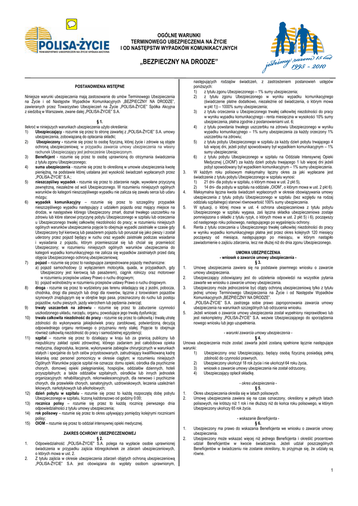 OGÓLNE WARUNKI TERMINOWEGO UBEZPIECZENIA NA ŻYCIE I OD NASTĘPSTW WYPADKÓW KOMUNIKACYJNYCH „BEZPIECZNY NA DRODZE” POSTANOWIENIA WSTĘPNE Niniejsze warunki ubezpieczenia mają zastosowanie do umów Terminowego Ubezpieczenia na Życie i od Następstw Wypadków Komunikacyjnych „BEZPIECZNY NA DRODZE”, zawieranych przez Towarzystwo Ubezpieczeń na Życie „POLISA-ŻYCIE” Spółka Akcyjna z siedzibą w Warszawie, zwane dalej „POLISA-ŻYCIE” S.A. § 1. Ilekroć w niniejszych warunkach ubezpieczenia użyto określenia: 1) Ubezpieczający - rozumie się przez to stronę zawartej z „POLISA-ŻYCIE” S.A. umowy ubezpieczenia, zobowiązaną do opłacania składki; 2) Ubezpieczony - rozumie się przez to osobę fizyczną, której życie i zdrowie są objęte ochroną ubezpieczeniową; w przypadku zawarcia umowy ubezpieczenia na własny rachunek Ubezpieczający jest jednocześnie Ubezpieczonym. 3) Beneficjent - rozumie się przez to osobę uprawnioną do otrzymania świadczenia z tytułu zgonu Ubezpieczonego; 4) suma ubezpieczenia - rozumie się przez to określoną w umowie ubezpieczenia kwotę pieniężną, na podstawie której ustalana jest wysokość świadczeń wypłacanych przez „POLISA-ŻYCIE” S.A.; 5) nieszczęśliwy wypadek - rozumie się przez to zdarzenie nagłe, wywołane przyczyną zewnętrzną, niezależne od woli Ubezpieczonego. W rozumieniu niniejszych ogólnych warunków do kategorii nieszczęśliwego wypadku nie zalicza się zawału serca lub udaru mózgu; 6) wypadek komunikacyjny – rozumie się przez to szczególny przypadek nieszczęśliwego wypadku następujący z udziałem pojazdu oraz mający miejsce na drodze, w następstwie którego Ubezpieczony zmarł, doznał trwałego uszczerbku na zdrowiu lub które stanowi przyczynę pobytu Ubezpieczonego w szpitalu lub orzeczenia u Ubezpieczonego trwałej całkowitej niezdolności do pracy; w rozumieniu niniejszych ogólnych warunków ubezpieczenia pojęcie to obejmuje wypadki zaistniałe w czasie gdy Ubezpieczony był kierowcą lub pasażerem pojazdu lub poruszał się jako pieszy i został uderzony przez pojazd będący w ruchu oraz wypadki zaistniałe podczas wsiadania i wysiadania z pojazdu, którym przemieszczał się lub chciał się przemieścić Ubezpieczony; w rozumieniu niniejszych ogólnych warunków ubezpieczenia do kategorii wypadku komunikacyjnego nie zalicza się wypadków zaistniałych przed datą objęcia Ubezpieczonego ochroną ubezpieczeniową; 7) pojazd – rozumie się przez to następujące zarejestrowane pojazdy mechaniczne: a) pojazd samochodowy (z wyłączeniem motocykla, quada, w przypadkach, gdy Ubezpieczony jest kierowcą lub pasażerem), ciągnik rolniczy oraz motorower w rozumieniu przepisów ustawy Prawo o ruchu drogowym; b) pojazd wolnobieżny w rozumieniu przepisów ustawy Prawo o ruchu drogowym. 8) droga - rozumie się przez to wydzielony pas terenu składający się z jezdni, pobocza, chodnika, drogi dla pieszych lub drogi dla rowerów, łącznie z torowiskiem pojazdów szynowych znajdującym się w obrębie tego pasa, przeznaczony do ruchu lub postoju pojazdów, ruchu pieszych, jazdy wierzchem lub pędzenia zwierząt; 9) trwały uszczerbek na zdrowiu - rozumie się przez to zaburzenie czynności uszkodzonego układu, narządu, organu, powodujące jego trwałą dysfunkcję; 10) trwała całkowita niezdolność do pracy - rozumie się przez to całkowitą i trwałą utratę zdolności do wykonywania jakiejkolwiek pracy zarobkowej, potwierdzoną decyzją odpowiedniego organu rentowego o przyznaniu renty stałej. Pojęcie to obejmuje również całkowitą niezdolność do pracy i samodzielnej egzystencji; 11) szpital – rozumie się przez to działający w kraju lub za granicą publiczny lub niepubliczny zakład opieki zdrowotnej, którego zadaniem jest całodobowa opieka medyczna, diagnostyka, leczenie, wykonywanie zabiegów chirurgicznych w warunkach stałych i specjalnie do tych celów przystosowanych, zatrudniający kwalifikowaną kadrę lekarską oraz personel pomocniczy w okresie ciągłym; w rozumieniu niniejszych Ogólnych Warunków pojęcie szpital nie oznacza: domu opieki, ośrodka dla psychicznie chorych, domowej opieki pielęgniarskiej, hospicjów, oddziałów dziennych, hoteli przyszpitalnych; a także oddziałów szpitalnych, ośrodków lub innych jednostek organizacyjnych: rehabilitacyjnych, rekonwalescencyjnych, dla nerwowo i psychicznie chorych, dla przewlekle chorych, sanatoryjnych, uzdrowiskowych, leczenia uzależnień lekowych, narkotykowych lub alkoholowych; 12) dzień pobytu w szpitalu - rozumie się przez to każdą rozpoczętą dobę pobytu Ubezpieczonego w szpitalu, liczoną każdorazowo od godziny 0:00; 13) rocznica polisy – rozumie się przez to każdą rocznicę pierwszego dnia odpowiedzialności z tytułu umowy ubezpieczenia; 14) rok polisowy – rozumie się przez to okres upływający pomiędzy kolejnymi rocznicami polisy; 15) OIOM – rozumie się przez to oddział intensywnej opieki medycznej. 3. 4. 5. 6. 1. 2. 3. 4. 5. 1. 2. UMOWA UBEZPIECZENIA - wniosek o zawarcie umowy ubezpieczenia § 3. Umowę ubezpieczenia zawiera się na podstawie pisemnego wniosku o zawarcie umowy ubezpieczenia. Ubezpieczający zobowiązany jest do udzielenia odpowiedzi na wszystkie pytania zawarte we wniosku o zawarcie umowy ubezpieczenia. Ubezpieczony może jednocześnie być objęty ochroną ubezpieczeniową tylko z tytułu jednej umowy Terminowego Ubezpieczenia na Życie i od Następstw Wypadków Komunikacyjnych „BEZPIECZNY NA DRODZE”. „POLISA-ŻYCIE” S.A. zastrzega sobie prawo zaproponowania zawarcia umowy ubezpieczenia na warunkach szczególnych lub odrzucenia wniosku. Jeżeli wniosek o zawarcie umowy ubezpieczenia został wypełniony nieprawidłowo lub jest niekompletny „POLISA-ŻYCIE” S.A. wezwie Ubezpieczającego do sporządzenia nowego wniosku lub jego uzupełnienia. - warunki zawarcia umowy ubezpieczenia § 4. Umowa ubezpieczenia może zostać zawa