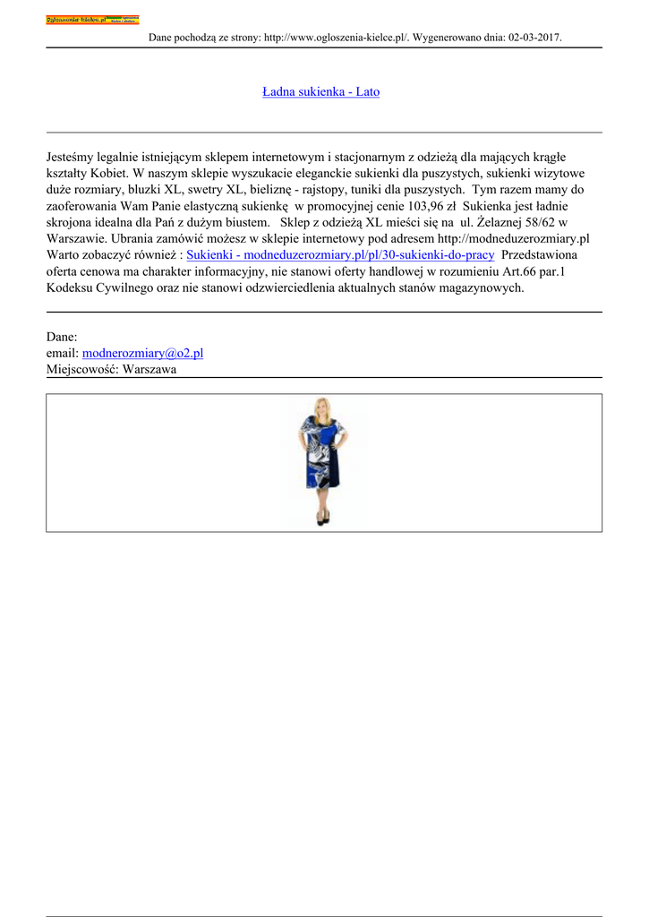 Dane pochodzą ze strony: http://www.ogloszenia-kielce.pl/. Wygenerowano dnia: 02-03-2017. Ładna sukienka - Lato Jesteśmy legalnie istniejącym sklepem internetowym i stacjonarnym z odzieżą dla mających krągłe kształty Kobiet. W naszym sklepie wyszukacie eleganckie sukienki dla puszystych, sukienki wizytowe duże rozmiary, bluzki XL, swetry XL, bieliznę - rajstopy, tuniki dla puszystych. Tym razem mamy do zaoferowania Wam Panie elastyczną sukienkę w promocyjnej cenie 103,96 zł Sukienka jest ładnie skrojona idealna dla Pań z dużym biustem. Sklep z odzieżą XL mieści się na ul. Żelaznej 58/62 w Warszawie. Ubrania zamówić możesz w sklepie internetowy pod adresem http://modneduzerozmiary.pl Warto zobaczyć również : Sukienki - modneduzerozmiary.pl/pl/30-sukienki-do-pracy Przedstawiona oferta cenowa ma charakter informacyjny, nie stanowi oferty handlowej w rozumieniu Art.66 par.1 Kodeksu Cywilnego oraz nie stanowi odzwierciedlenia aktualnych stanów magazynowych. Dane: email: [email protected] Miejscowość: Warszawa