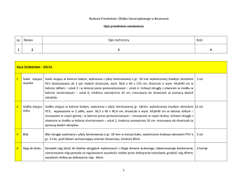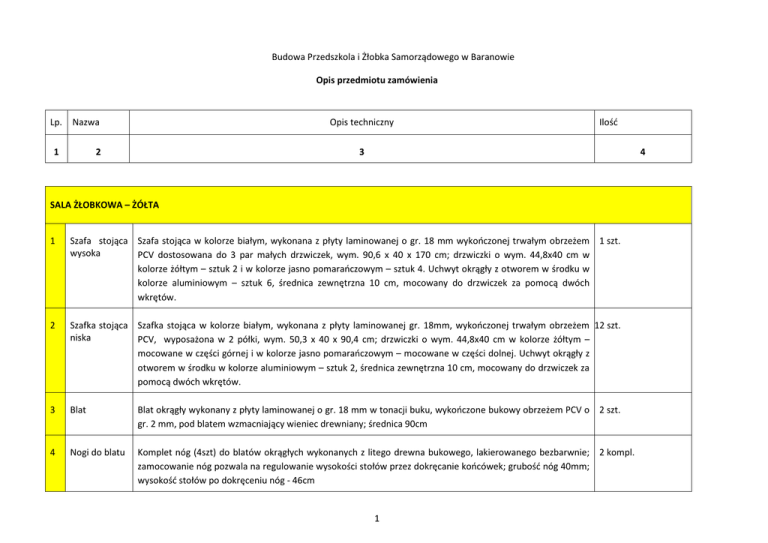 Budowa Przedszkola i Żłobka Samorządowego w Baranowie Opis przedmiotu zamówienia Lp. Nazwa 1 Opis techniczny 2 Ilość 3 4 SALA ŻŁOBKOWA – ŻÓŁTA 1 Szafa stojąca Szafa stojąca w kolorze białym, wykonana z płyty laminowanej o gr. 18 mm wykończonej trwałym obrzeżem 1 szt. wysoka PCV dostosowana do 3 par małych drzwiczek, wym. 90,6 x 40 x 170 cm; drzwiczki o wym. 44,8x40 cm w kolorze żółtym – sztuk 2 i w kolorze jasno pomarańczowym – sztuk 4. Uchwyt okrągły z otworem w środku w kolorze aluminiowym – sztuk 6, średnica zewnętrzna 10 cm, mocowany do drzwiczek za pomocą dwóch wkrętów. 2 Szafka stojąca Szafka stojąca w kolorze białym, wykonana z płyty laminowanej gr. 18mm, wykończonej trwałym obrzeżem 12 szt. niska PCV, wyposażona w 2 półki, wym. 50,3 x 40 x 90,4 cm; drzwiczki o wym. 44,8x40 cm w kolorze żółtym – mocowane w części górnej i w kolorze jasno pomarańczowym – mocowane w części dolnej. Uchwyt okrągły z otworem w środku w kolorze aluminiowym – sztuk 2, średnica zewnętrzna 10 cm, mocowany do drzwiczek za pomocą dwóch wkrętów. 3 Blat Blat okrągły wykonany z płyty laminowanej o gr. 18 mm w tonacji buku, wykończone bukowy obrzeżem PCV o 2 szt. gr. 2 mm, pod blatem wzmacniający wieniec drewniany; średnica 90cm 4 Nogi do blatu Komplet nóg (4szt) do blatów okrągłych wykonanych z litego drewna bukowego, lakierowanego bezbarwnie; 2 kompl. zamocowanie nóg pozwala na regulowanie wysokości stołów przez dokręcanie końcówek; grubość nóg 40mm; wysokość stołów po dokręceniu nóg - 46cm 1 5 Krzesełko Krzesełko wykonane z tworzywa sztucznego, stelaż w kolorze srebrnym wykonany z rury okrągłej o śr. 18 mm. 10 szt. Krzesełko odporne na zabrudzenia i wilgoć, powierzchnia siedziska moletowana, odporna na zarysowania, antypoślizgowa. Stelaż wyposażony w zatyczki z tworzywa chroniące podłogę przed zarysowaniem. Krzesełka z otworem w oparciu z możliwością stawiania jednego na drugim.; wysokość siedziska 26cm, krzesełko dla dzieci o wzroście od 93 cm do 116cm, kolor żółty 6 Fotel hamakowy Fotel hamakowy dla dzieci w kolorze żółtym. Hamak w kształcie tzw. „bocianiego gniazda”. W środku gruba, 2 szt. miękka poducha, a cały fotel wykonany w 100% z nieprzetwarzanej bawełny, barwionej naturalnymi, trwałymi barwnikami; wymiary: wysokość całkowita: 150cm; średnica: 70 cm; dopuszczalna waga: 80 kg. Fotel wraz z zestawem montażowym. 7 Poducha miękka poducha wypełniona granulatem silikonowym; średnica 100cm; kolor do uzgodnienia 8 Poduszka do duża poducha do siedzenia, o wymiarach 170x140x40cm, kolor pomarańczowy siedzenia 9 Leżaczek przedszkolny 10 Wózek łóżeczka 1szt. 1 szt. Łóżeczko ze stalową konstrukcją i tkaniną przepuszczającą powietrze. Narożniki z tworzywa sztucznego 14 szt. stanowiące nóżki łóżeczka; konstrukcja pozwala na układanie łóżeczek jedno na drugim; wym. 132 x 60 x 12,5 cm; kolor żółty na Konstrukcja metalowa, wyposażony w 4 kółka, pozwala na przemieszczanie min. 14 łóżeczek jednocześnie; 1szt. dostosowany do łóżeczek o wymiarach 132x56x15cm 11 Komplet W skład kompletu wchodzi poduszka i kołderka wraz z prześcieradłem z gumką, z możliwością prania w pralce; 24 szt. pościeli z wym. kołderki 80 x 120 cm; wym. poduszki 35 x 50 cm; 24szt. w kolorze żółtym ze wzorem dziecięcym wypełnieniem 12 Regał zabudowany Zabudowany regał wnękowy do przechowywania łóżeczek oraz pościeli; szerokość wnęki 215 cm, głębokość 75 1 szt. cm; wys. 250cm; w środku podział na część przeznaczoną do składowania łóżeczek -zamykana dwoma frontami przesuwnymi oraz część przechowywania pościeli z 24 półkami zamykana dwoma skrzydłami. Regał z płyty MDF w kolorze klonu; . 2 13 Dywan Dywan o wymiarach 4m x 5m, obszyty na krawędziach, o właściwościach antystatycznych i antyalergicznych, 1 szt. odporny na zabrudzenia; kolor jednolity do uzgodnienia po przedstawieniu próbnika 14 Panel na Panel w kształcie żabki, wykonany ze sklejki lakierowanej bezbarwnie, do zamontowania na ścianie; 1szt. informacje wyfrezowane oczy, usta i nos żaby; w panelu są otwory, w które można wkładać zwinięte w ruloniki kartki, pod otworami należy umieścić plakietki z imionami dzieci; wymiary 43,3x48,7x15cm (10 otworów) 15 Panel na Panel w kształcie kwiatka, wykonany ze sklejki lakierowanej bezbarwnie, do zamontowania na ścianie; w 1szt. informacje panelu są otwory, w które można wkładać zwinięte w ruloniki kartki, pod otworami należy umieścić plakietki z imionami dzieci; wymiary 53,3x52x15cm (20 otworów) 16 Biurko Biurko wykonane z płyty laminowanej o gr. 18mm w kolorze białym wykończonej trwałym obrzeżem PCV w 1szt. tym samym kolorze, przeznaczone na 3 wąskie szuflady; wymiary biurka 110x70x72,6cm; fronty szuflad wykonane z tej samej płyty w kolorze żółtym, wyposażone w metalowe prowadnice; uchwyty okrągłe w kolorze aluminiowym, z otworem w środku, mocowany na 2 wkręty – śr. zewn. 10cm. 17 Krzesło dla Stelaż wykonany z rury stalowej o śr. 18 mm w kolorze aluminiowym, siedzisko i oparcie połączone w jedną 1szt nauczyciela całość, wykonane z tworzywa sztucznego w kolorze żółtym; odporne na zabrudzenia i wilgoć; krzesło wyposażone w plastikowe ślizgacze chroniące podłogę przed zarysowaniami, wysokość siedziska 46cm, przystosowane dla wzrostu od 159cm do 188cm; kolor żółty 3 SALA ŻŁOBKOWA - NIEBIESK0 - POMARAŃCZOWA 18 Szafa stojąca Szafa stojąca w kolorze białym, wykonana z płyty laminowanej o gr. 18 mm wykończonej trwałym obrzeżem 1 szt. wysoka PCV dostosowana do 3 par małych drzwiczek, wym. 90,6 x 40 x 170 cm; drzwiczki o wym. 44,8x40 cm w kolorze pomarańczowym – sztuk 2 i w kolorze granatowym – sztuk 4. Uchwyt okrągły z otworem w środku w kolorze aluminiowym – sztuk 6, średnica zewnętrzna 10 cm, mocowany do drzwiczek za pomocą dwóch wkrętów.