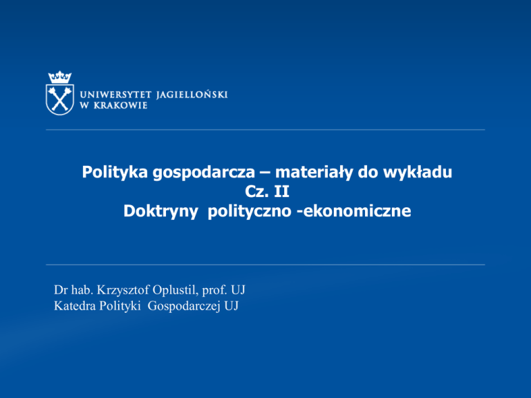 Polityka gospodarcza – materiały do wykładu Cz. II Doktryny polityczno -ekonomiczne Dr hab. Krzysztof Oplustil, prof. UJ Katedra Polityki Gospodarczej UJ Merkantylizm XV/XVI w., Hiszpania, Francja, Anglia, Włochy Ideologia tworzącej się burżuazji (mieszczaństwa, kupców, bankierów, przemysłowców) w okresie akumulacji kapitału – kapitalizm kupiecki (lac. mercari – handlować) wytwór myśli mężów stanu, urzędników, kupców oraz finansowych i gospodarczych przywódców owych czasów Tło historyczne: wzrost znaczenia i wpływów politycznych klasy kupieckiej, rozwój miast kupieckich w Europie Zachodniej, Reformacja – rozwój etyki protestanckiej Odkrycia geograficzne i napływ kruszców Rozwój absolutyzmu Merkantylizm Założenia doktryny o bogactwie człowieka i całych narodów decyduje wielkość zgromadzonych zasobów kruszcowych (złota, srebra) – bullionizm Prawo Kopernika-Greshama: zły pieniądz wypiera z obrotu pieniądz lepszy (zawierający więcej kruszcu) , M. Kopernik – Zasady bicia monety, 1526 Napływ kruszcu prowadził do inflacji (zob. później w XX w. ilościowa teoria pieniądza, prekursor w XVI w. – J. Bodin) Merkantylizm Założenia doktryny Dodatni bilans obrotów z zagranicą – przewaga eksportu nad importem w stosunkach z każdym państwem, Modyfikacja: Tomasz Mun (1571-1641) – dopuszczał import tanich surowców Zasada autarkii (samowystarczalności) gospodarczej Protekcjonistyczna polityka handlowa (cła), negatywne nastawienie do wolnej konkurencji Interwencjonizm państwowy (m.in. rozwój manufaktur, infrastruktury, gwarantowanie niskich cen żywności, przyznawanie monopoli na handel z określonymi obszarami) Merkantylizm Przedstawiciele i krytycy : Thomas Mun (XV/XVI w.) – „Bogactwo Anglii w handlu zagranicznym” (1621), postulat ograniczenia konsumpcji towarów zagranicznych Jean Bodin (XVI w.) – politolog i uczony, zauważył związek pomiędzy ilością pieniądza w gospodarce a rosnącymi cenami dóbr A. de Montchretien (zabójcza zagraniczna konkurencja), J.B. Colbert Krytycy – D. Hume (XVIII w. – ciągłe utrzymywanie dodatniego bilansu w handlu z zagranicą jest niemożliwe), A. Smith Późniejsi zwolennicy – niemiecka szkoła historyczna (XIX w.) J.M. Keynes (XX w.) Fizjokratyzm • Miejsce i czas: Francja (także Polska) XVIII/pocz. XIX w. • Przedstawiciele: F. Quesnay („Tablice Ekonomiczne”), R.J. Turgot w Polsce – S. Staszic, H. Kołłątaj • Tło historyczne – liczebność i znaczenie klasy ziemiańskiej • Założenia doktryny: • Koncepcja porządku naturalnego, którego podstawami są: wolność osobista, własność prywatna i wolność gospodarcza (leseferyzm, fr. Laissez faire, laissez passer ) • Koncepcja produktu czystego (produit net) – dochodem czystym jest suma dóbr wytworzonych w ciągu roku w rolnictwie, wszystkie inny dziedziny handlu i przemysłu są nieprodukcyjne • Fizjokratyczna struktura społeczna – klasa produkcyjna i „jałowa” • Koncepcja jednego podatku od ziemi Liberalizm i ekonomia klasyczna • Założenia liberalizmu jak nurtu doktrynalnego: – Indywidualizm (w aspekcie etycznym, socjologicznym, ekonomicznym) – Egalitaryzm (jednakowy system wartości społecznych oraz ten sam system normatywny; równość szans dla wszystkich) – Uniwersalizm (istnieją niezmienne i uniwersalne prawa natury, także ekonomiczne) – Melioryzm (instytucje społeczne i gospodarcze są samoregulujące się, samonaprawiające się, nie wymagają ingerencji człowieka, sterowania) • Prekursorzy: T. Hobbes, D. Hume, J. Locke (liberalizm polityczny) Liberalizm i ekonomia klasyczna • Szkoła klasyczna w ekonomii: – gospodarka w długim okresie, jeżeli nic nie będzie zakłócać jej funkcjonowania, rozwija się w sposób zrównoważony – nierównowaga na rynku wywoływana jest przez przejściowo działające czynniki zewnętrzne – działanie „niewidzialnej ręki rynku” – motyw realizacji własnego interesu przez jednostki prowadzi do samoregulacji procesów gospodarczych – wolność polityczna i gospodarcza to nierozdzielnie ze sobą związane, komplementarne elementy – postulat uelastycznienia stawek płac, zniesienia ograniczeń prawnych – pieniądz ma charakter neutralny, wzrost jego podaży prowadzi do wzrostu inflacji Szkoła ekonomii klasycznej • Adam Smith - „Badania nad naturą i przyczynami bogactwa narodów” (1776 r.) – Indywidualizm, człowiek jako homo oeconomicus, niewidzialna ręka rynku , zasadnicza harmonia interesu indywid. i społ. „Człowiek kieruje wytwórczością tak, aby jej produkt posiadał możliwie najwyższą wartość, myśli tylko o swym własnym zarobku, a jednak w tym, jak i w wielu innych przypadkach, jakaś niewidzialna ręka kieruje nim tak, aby zdążał do celu, którego wcale nie zamierzał osiągnąć. Mając na celu swój własny interes człowiek popiera interesy społeczeństwa znacznie lepiej niż wtedy, gdy zamierza służyć im rzeczywiście.” „Nie od przychylności rzeźnika, piwowara czy piekarza oczekujemy naszego obiadu, lecz od ich dbałości o własny interes. Zwracamy się nie do ich humanitarności, lecz do egoizmu i nie mówimy im o naszych własnych potrzebach, lecz o ich korzyściach.” Szkoła ekonomii klasycznej • Adam Smith: – Znaczenie wolnej konkurencji jako instrumentu przeciwdziałającemu nadużywaniu wolności gospodarczej – Praca jako źródło bogactwa jednostki i narodów , teoria wartości opartej na pracy (wartość użytkowa i wartość wymienna, określona przez ilość pracy potrzebnej do wytworzenia i koszt utrzymania pracownika ) – Znaczenie przedsiębiorców w akumulacji kapitału produkcyjnego – Leseferyzm w handlu wewnętrznym i zewnętrznym ( z wyjątkami) – Państwo „jako stróż nocny”, zadanie państwa – ochrona własności prywatnej, bezpieczeństwa, wolnej konkurencji, zapewnienie edukacji powszechnej, infrastruktury publicznej 