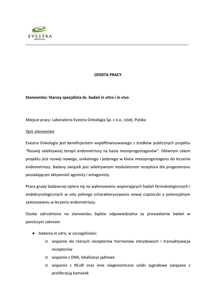 __________________________________________________________________________________ OFERTAPRACY Stanowisko:Starszyspecjalistads.badańinvitroiinvivo Miejscepracy:LaboratoriaEvestraOnkologiaSp.zo.o.,Łódź,Polska Opisstanowiska Evestra Onkologia jest beneficjentem współfinansowanego z środków publicznych projektu "Rozwój selektywnej terapii endometriozy na bazie mesoprogestagenów". Głównym celem projektujestrozwójnowego,unikalnegoijedynegowklasiemesoprogestagenudoleczenia endometriozy.Badanyzwiązekjestselektywnymmodulatoremreceptoradlaprogesteronu posiadającymaktywnośćagonistyiantagonisty. Pracagrupybadawczejopierasięnawykonywaniuwspierającychbadańfarmakologicznychi endokrynologicznych w celu pełnego scharakteryzowania nowej cząsteczki o potencjalnym zastosowaniuwleczeniuendometriozy. Osoba zatrudniona na stanowisku będzie odpowiedzialna za prowadzenie badań w poniższymzakresie: ● badaniainvitro,wszczególności: o wiązanie do różnych receptorów hormonów sterydowych i transaktywacja receptorów o wiązaniezDNA,lokalizacjajądrowa o wiązanie z NCoR oraz inne niegenomiczne szlaki sygnałowe związane z proliferacjąkomórek __________________________________________________________________________________ ● badaniainvivo,wszczególności: o zwierzęce modele endometriozy opierające się na ksenograftach, badania endokrynologicznewmodeluszczurzymikróliczym Gwarantujemy możliwość pracy w innowacyjnym środowisku w intensywnie rozwijającym sięzespole. Pożądanedoświadczenieiumiejętności Poszukujemy ambitnych, utalentowanych i zmotywowanych badaczy, których celem jest rozwójswoichumiejętnościwśrodowiskunaukowymomiędzynarodowejrenomie. Kandydatnastanowiskostarszegospecjalistyds.badańinvitroiinvivopowinienposiadaćstopień naukowy doktora w zakresie biologii, biochemii, biomedycyny lub farmakologii i przynajmniej 3 letniedoświadczeniewzakresieendokrynologii,nowotworóworazbiologiimolekularnej.Pożądane jest posiadanie doświadczenia w zakresie badań na zwierzętach (w tym zabiegi chirurgiczne i towarzysząceimeksperymenty).Kandydatnaprzedmiotowestanowiskowiniendysponowaćwiedzą wzakresiemetodbiologiikomórkowejimolekularnej,wtymhodowlikomórkowych,qPCR,Western blot, transfekcji oraz cytometrii przepływowej. Kandydat powinien być silnie zmotywowany do samodzielnejpracyorazbiegleposługiwaćsięjęzykiemangielskimwmowieiwpiśmie. Opispracodawcy EvestraOnkologiaSp.Zo.ojestpolskimstart-upemuruchomionymprzezgrupęspecjalistów posiadających znakomite doświadczenie w rozwoju i komercjalizacji innowacyjnych produktów onkologicznych stosowanych w innych schorzeniach proliferacyjnych. Siedziba spółkiEvestraOnkologiaznajdujesięwNowymDworzeMazowieckim,natomiastlaboratoria wŁodzi. Misją Evestra Onkologia jest rozwój i komercjalizacja produktów onkologicznych w Polsce, jak i w UE. W celu realizacji tej misji spółka nawiązuje owocne współprace z czołowymi __________________________________________________________________________________ polskimi instytucjami badawczymi w dziedzinie onkologii i ginekologii, oraz firmami CRO w Polsce w celu zwiększenia możliwości rozwoju i komercjalizacji naszych innowacyjnych aktywów. Kontakt Zainteresowani kandydaci powinni wysłać swoje CV (w języku angielskim), listę publikacji oraz ewentualne certyfikaty wraz z dwoma listami polecającymi do dnia 15.10.2016 na adres:[email protected]