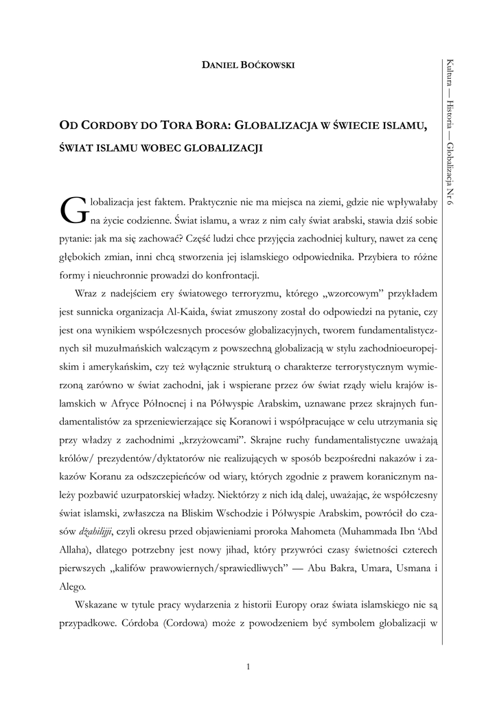 OD CORDOBY DO TORA BORA: GLOBALIZACJA W ŚWIECIE ISLAMU, ŚWIAT ISLAMU WOBEC GLOBALIZACJI G lobalizacja jest faktem. Praktycznie nie ma miejsca na ziemi, gdzie nie wpływałaby na życie codzienne. Świat islamu, a wraz z nim cały świat arabski, stawia dziś sobie pytanie: jak ma się zachować? Część ludzi chce przyjęcia zachodniej kultury, nawet za cenę głębokich zmian, inni chcą stworzenia jej islamskiego odpowiednika. Przybiera to różne formy i nieuchronnie prowadzi do konfrontacji. Wraz z nadejściem ery światowego terroryzmu, którego „wzorcowym” przykładem jest sunnicka organizacja Al-Kaida, świat zmuszony został do odpowiedzi na pytanie, czy jest ona wynikiem współczesnych procesów globalizacyjnych, tworem fundamentalistycznych sił muzułmańskich walczącym z powszechną globalizacją w stylu zachodnioeuropejskim i amerykańskim, czy też wyłącznie strukturą o charakterze terrorystycznym wymierzoną zarówno w świat zachodni, jak i wspierane przez ów świat rządy wielu krajów islamskich w Afryce Północnej i na Półwyspie Arabskim, uznawane przez skrajnych fundamentalistów za sprzeniewierzające się Koranowi i współpracujące w celu utrzymania się przy władzy z zachodnimi „krzyżowcami”. Skrajne ruchy fundamentalistyczne uważają królów/ prezydentów/dyktatorów nie realizujących w sposób bezpośredni nakazów i zakazów Koranu za odszczepieńców od wiary, których zgodnie z prawem koranicznym należy pozbawić uzurpatorskiej władzy. Niektórzy z nich idą dalej, uważając, że współczesny świat islamski, zwłaszcza na Bliskim Wschodzie i Półwyspie Arabskim, powrócił do czasów dżahilijji, czyli okresu przed objawieniami proroka Mahometa (Muhammada Ibn ‘Abd Allaha), dlatego potrzebny jest nowy jihad, który przywróci czasy świetności czterech pierwszych „kalifów prawowiernych/sprawiedliwych” — Abu Bakra, Umara, Usmana i Alego. Wskazane w tytule pracy wydarzenia z historii Europy oraz świata islamskiego nie są przypadkowe. Córdoba (Cordowa) może z powodzeniem być symbolem globalizacji w 1 Kultura — Historia — Globalizacja Nr 6 DANIEL BOĆKOWSKI Daniel Boćkowski, Od Cordoby do Tora Bora… wydaniu arabskim/islamskim jako stolica niezależnego emiratu utworzonego przez Abd ar-Rahmana I, ostatniego potomka Omajjadów, który w roku 929 ogłosił mauretańską część Hiszpanii Al-Andalus niezależnym od Bagdadu kalifatem. To także symbol schyłku pierwszego etapu islamskiej/arabskiej globalizacji. Upadek Cordowy w 1236 roku oraz zajęcie miasta przez rycerzy chrześcijańskich pod wodzą Ferdynanda III Kastylijskiego to symboliczny moment upadku owej idei (choć początków można by się doszukiwać już w wydarzeniach z początku XII wieku, kiedy władza w mieście przypadła Almohadom). Z kolei groty Tora Bora (w języku paszto, czarny pył) znajdujące się w masywie górskim Gór Białych (Safed Koh), w pobliżu Przełęczy Chajberskiej, w południowo-wschodnim Afganistanie, niedaleko Jalalabadu, to symboliczne miejsce pierwszego dużego starcia sił USA z Al-Kaidą Usamy ibn Ladina w grudniu 2001 roku. To także symbol starcia świata zachodniego z zupełnie inną wizją globalizacji, którą możemy umownie określić światowym kalifatem, będącą odpowiedzią na procesy globalizacyjne zachodzące pod wpływem Europy i USA w całym świecie islamskim. To symboliczne starcie pomiędzy zwolennikami stworzenia dar al-islam („domu islamu”) na ziemiach dar al-harb („domu wojny”), przez które rozumiemy cały świat niemuzułmański. To wreszcie starcie pomiędzy dwiema wizjami przyszłego świata: globalizacją i al-kaunijja (Mrozek-Dumanowska, 2005, 13). Co ciekawe, w dobie coraz liczniejszej migracji muzułmanów do Europy pojęcia dar al-islam i dar al-harb powoli zmieniają swe pierwotne znaczenie. Do niedawna był to w praktyce podział na dwa światy, z których tylko jeden jest właściwy muzułmaninowi — tylko w nim powinien przebywać. Muzułmanie przebywający w świecie niemuzułmańskim powinni dążyć do tego, aby jak najszybciej powrócić do „domu islamu”, gdyż świat niewiernych może wpływać na świadome bądź nieświadome odstąpienie do zasad wiary. Dla wielu uczonych muzułmańskich główne zagrożenie wynikające z globalizacji wiąże się właśnie z owym konfliktem sumienia muzułmanów w dar al-harb. Zglobalizowany świat zachodni nie stanowi sam w sobie zagrożenia dla wiary muzułmańskiej, jest natomiast dar al-kufr („domem pogaństwa”) — czynnikiem, który dzięki swej atrakcyjności jest w stanie wpływać na decyzje muzułmanów o ewentualnym nieprzestrzeganiu zasad Koranu (Muren, 2002, 123). Najtrafniej problem ten oddaje Brayan Turner, który pisze, że prawdziwym zagrożeniem dla islamu nie jest Jezus, a Madonna (Górak-Sosnowska, 2007, 94; Turner, 1997, 15). 2 przypadku muzułmanów zamieszkujących Azję Południowo-Wschodnią czynnik ekonomiczny i wynikające z niego pokusy nie stanowią zagrożenia. Kraje takie jak Malezja czy Indonezja z powodzeniem łączą bowiem stosunkowo wysoki poziom życia wynikający ze swobodnego przepływu towarów i usług z zasadami wiary. Z kolei jeden z najbardziej znanych intelektualistów muzułmańskich mieszkający na stałe w Szwajcarii, Tarik Ramadan, zwolennik tezy, że islam jest religią europejską, uważa, że to właśnie Zachód stwarza znacznie korzystniejsze warunki dla swobodnego rozwoju muzułmańskiej myśli religijnej, gdyż swoboda, z jaką można tu realizować swoje przekonania, w wielu krajach muzułmańskich, zwłaszcza Afryki Północnej i Bliskiego Wschodu, byłaby niemożliwa. Dlatego też postuluje on, aby poddany procesom globalizacyjnym świat Zachodu uważać za dar asz-szahada („dom dawania świadectwa wiary”) lub alam alszachada („świat dawania świadectwa”) (Ramadan, 2004, 77). Jest to zbliżone do idei głoszących, że misją świata islamu w zglobalizowanym 