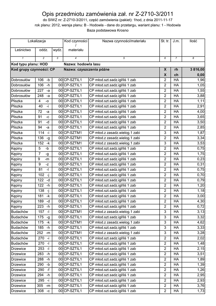 Opis przedmiotu zamówienia zał. nr Z-2710-3/2011 do SIWZ nr: Z-2710-3/2011, część zamówienia (pakiet): 1hod, z dnia 2011-11-17 rok planu: 2012, wersja planu: B - Hodowla - dane do przetargu, wariant planu: 1 - Hodowla Baza podstawowa Krosno Lokalizacja Leśnictwo oddz. 1 2 Kod czynności / wydz. materiału 3 106 -b 106 -h 227 -a 248 -a 4 -o 40 -i 72 -a 91 -c 91 -d 94 -a 114 -i 136 -g 152 -k 5 -b 7 -g 9 -m 9 -z 81 -l 102 -j 122 -d 122 -h 138 -j 181 -k 189 -d 223 -h 157 -l 175 -g 175 -k 185 -h 252 -m 270 -i 270 -l 253 -l 283 -h 288 -h 290 -b 290 -f 294 -h 295 -i 305 -m 308 -c 5 4 Kod typu planu: HOD Kod grupy czynności: CP Dobrosułów Dobrosułów Dobrosułów Dobrosułów Pliszka Pliszka Pliszka Pliszka Pliszka Pliszka Pliszka Pliszka Pliszka Kępiny Kępiny Kępiny Kępiny Kępiny Kępiny Kępiny Kępiny Kępiny Kępiny Kępiny Kępiny Budachów Budachów Budachów Budachów Budachów Budachów Budachów Drzewice Drzewice Drzewice Drzewice Drzewice Drzewice Drzewice Drzewice Drzewice Nazwa czynności/materiału Nazwa: hodowla lasu Nazwa: czyszczenia późne 00 00 00 00 00 00 00 00 00 00 00 00 00 00 00 00 00 00 00 00 00 00 00 00 00 00 00 00 00 00 00 00 00 00 00 00 00 00 00 00 00 CP-SZTIL1 CP-SZTIL1 CP-SZTIL1 CP-SZTIL1 CP-SZTIL1 CP-SZTIL1 CP-SZTIL1 CP-SZTIL1 CP-SZTIL1 CP-SZTIL1 CP-SZTM1 CP-SZTM1 CP-SZTM1 CP-SZTIL1 CP-SZTIL1 CP-SZTIL1 CP-SZTIL1 CP-SZTIL1 CP-SZTIL1 CP-SZTIL1 CP-SZTIL1 CP-SZTIL1 CP-SZTIL1 CP-SZTIL1 CP-SZTIL1 CP-SZTM1 CP-SZTIL1 CP-SZTM1 CP-SZTIL1 CP-SZTM1 CP-SZTIL1 CP-SZTIL1 CP-SZTIL1 CP-SZTIL1 CP-SZTIL1 CP-SZTIL1 CP-SZTIL1 CP-SZTIL1 CP-SZTIL1 CP-SZTIL1 CP-SZTIL1 CP młod.szt.sadz.igl/liś 1 zab CP młod.szt.sadz.igl/liś 1 zab CP młod.szt.sadz.igl/liś 1 zab CP młod.szt.sadz.igl/liś 1 zab CP młod.szt.sadz.igl/liś 1 zab CP młod.szt.sadz.igl/liś 1 zab CP młod.szt.sadz.igl/liś 1 zab CP młod.szt.sadz.igl/liś 1 zab CP młod.szt.sadz.igl/liś 1 zab CP młod.szt.sadz.igl/liś 1 zab CP młod.z zasadz.wielog.1 zabi CP młod.z zasadz.wielog.1 zabi CP młod.z zasadz.wielog.1 zabi CP młod.szt.sadz.igl/liś 1 zab CP młod.szt.sadz.igl/liś 1 zab CP młod.szt.sadz.igl/liś 1 zab CP młod.szt.sadz.igl/liś 1 zab CP młod.szt.sadz.igl/liś 1 zab CP młod.szt.sadz.igl/liś 1 zab CP młod.szt.sadz.igl/liś 1 zab CP młod.szt.sadz.igl/liś 1 zab CP młod.szt.sadz.igl/liś 1 zab CP młod.szt.sadz.igl/liś 1 zab CP młod.szt.sadz.igl/liś 1 zab CP młod.szt.sadz.igl/liś 1 zab CP młod.z zasadz.wielog.1 zabi CP młod.szt.sadz.igl/liś 1 zab CP młod.z zasadz.wielog.1 zabi CP młod.szt.sadz.igl/liś 1 zab CP młod.z zasadz.wielog.1 zabi CP młod.szt.sadz.igl/liś 1 zab CP młod.szt.sadz.igl/liś 1 zab CP młod.szt.sadz.igl/liś 1 zab CP młod.szt.sadz.igl/liś 1 zab CP młod.szt.sadz.igl/liś 1 zab CP młod.szt.sadz.igl/liś 1 zab CP młod.szt.sadz.igl/liś 1 zab CP młod.szt.sadz.igl/liś 1 zab CP młod.szt.sadz.igl/liś 1 zab CP młod.szt.sadz.igl/liś 1 zab CP młod.szt.sadz.igl/liś 1 zab St. tr. J.m. 6 7 X X 2 2 2 2 2 2 2 2 2 2 3 2 3 2 2 2 2 2 2 2 2 2 2 2 2 3 3 3 3 3 2 2 2 2 2 2 2 2 2 2 2 rh ch HA HA HA HA HA HA HA HA HA HA HA HA HA HA HA HA HA HA HA HA HA HA HA HA HA HA HA HA HA HA HA HA HA HA HA HA HA HA HA HA HA Ilość 8 3 816,00 0,00 1,96 1,05 1,55 3,88 1,11 2,91 4,00 3,65 3,50 2,85 1,87 3,34 3,53 0,75 1,75 0,23 0,31 0,75 0,70 0,79 1,20 1,18 3,00 4,30 0,72 3,13 3,32 4,62 3,33 3,28 2,02 1,48 2,15 3,51 1,89 1,39 1,26 2,95 2,93 3,76 1,73 308 -d Drzewice 310 -g Drzewice 312 -c Drzewice 313 -f Drzewice 313 -h Drzewice Kod grupy czynności: CW Dobrosułów Dobrosułów Dobrosułów Dobrosułów Pliszka Pliszka 10 -c 106B -g 224 -g 250 -a 1 -d 2 -k -m 00 00 00 00 00 CP młod.szt.sadz.igl/liś 1 zab CP-SZTIL1 CP młod.szt.sadz.igl/liś 1 zab CP-SZTIL1 CP młod.szt.sadz.igl/liś 1 zab CP-SZTIL1 CP młod.szt.sadz.igl/liś 1 zab CP-SZTIL1 CP młod.szt.sadz.igl/liś 1 zab CP-SZTIL1 Nazwa: czyszczenia wczesne 2 2 2 2 2 X X 2 2 2 2 3 1 HA HA HA HA HA rh ch HA HA HA HA HA HA 1,61 1,22 5,00 0,44 1,03 2 211,57 0,00 0,90 2,20 3,07 2,45 0,58 0,50 00 00 00 00 00 00 CW-SZTIL CW-SZTIL CW-SZTIL CW-SZTIL CW-SZTIL WYC ODROS 00 WYC ODROS Wycinanie odrośli 1 HA 1,00 CW z sadz/siew sztucz igl/lis CW z sadz/siew sztucz igl/lis CW z sadz/siew sztucz igl/lis CW z sadz/siew sztucz igl/lis CW z sadz/siew sztucz igl/lis Wycinanie odrośli Pliszka 4 Pliszka Pliszka 92 -j 166 -h CW z sadz/siew sztucz igl/lis 00 CW-SZTIL 00 WYC ODROS Wycinanie odrośli 1 1 HA HA 3,73 1,25 Pliszka 166 -m 00 WYC ODROS Wycinanie odrośli 1 HA 0,98 HA HA HA HA HA HA HA HA HA HA HA HA HA HA HA HA HA HA HA HA HA HA HA HA HA rh ch HA HA 2,41 1,12 3,50 1,55 1,88 1,74 2,43 1,03 3,65 4,24 1,90 0,24 3,33 3,00 1,08 3,95 0,20 2,60 2,30 3,55 0,81 0,93 3,64 1,03 0,55 392,21 0,00 0,50 0,50 5 -h Kępiny 7 -d Kępiny 7 -h Kępiny 9 -r Kępiny 25 -f Kępiny 25 -m Kępiny 30 -j Kępiny 50 -h Kępiny 54 -b Kępiny 76 -d Kępiny 81 -f Kępiny 81 -m Kępiny 122 -c Kępiny 168 -d Kępiny 170 -c Kępiny 180 -c Kępiny 257 -p Budachów 260 -g Budachów 267 -f Drzewice 283 -k Drzewice 290 -g Drzewice 291 -k Drzewice 299 -f Drzewice 300 -s Drzewice 304 -o Drzewice Kod grupy czynności: MAPORZ 00 00 00 00 00 00 00 00 00 00 00 00 00 00 00 00 00 00 00 00 00 00 00 00 00 Dobrosułów Dobrosułów 231 -c 231 -c 00 PORZ>100 00 OPR-PSPAL oczysz.zręb/hal.pokr.pow.100% oprysk opryskiwacz plecak.spal 2 2 2 2 2 2 2 2 2 2 2 2 2 2 2 2 3 2 1 1 1 1 1 1 1 X X 2 2 Dobrosułów Dobrosułów 232 -h 232 -h 00 PORZ>100 00 OPR-PSPAL oczysz.zręb/hal.pokr.pow.100% oprysk opryskiwacz plecak.spal 2 2 HA HA 2,00 2,00 Pliszka 24 00 WPOD-63N Wyc.z.u.31-60%pokr.podsz.>2m.n 3 HA 0,25 -k CW z sadz/siew sztucz igl/lis CW-SZTIL CW z sadz/siew sztucz igl/lis CW-SZTIL CW z sadz/siew sztucz igl/lis CW-SZTIL CW z sadz/siew sztucz igl/lis CW-SZTIL CW z sadz/siew sztucz igl/lis CW-SZTIL CW z sadz/siew sztucz igl/lis CW-SZTIL CW z sadz/siew sztucz igl/lis CW-SZTIL CW z sadz/siew sztucz igl/lis CW-SZTIL CW z sadz/siew sztucz igl/lis CW-SZTIL CW z sadz/siew sztucz igl/lis CW-SZTIL CW z sa