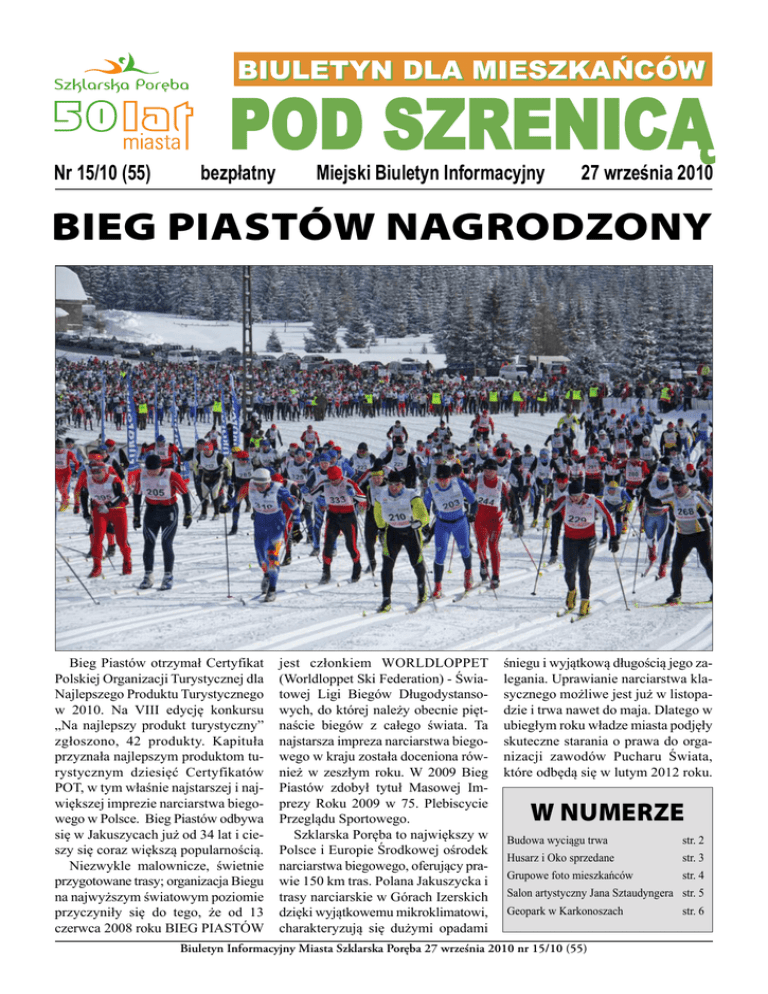 BIULETYN DLA MIESZKAŃCÓW Nr 15/10 (55) POD SZRENICą bezpłatny Miejski Biuletyn Informacyjny 27 września 2010 Bieg Piastów nagrodzony Bieg Piastów otrzymał Certyfikat Polskiej Organizacji Turystycznej dla Najlepszego Produktu Turystycznego w 2010. Na VIII edycję konkursu „Na najlepszy produkt turystyczny” zgłoszono, 42 produkty. Kapituła przyznała najlepszym produktom turystycznym dziesięć Certyfikatów POT, w tym właśnie najstarszej i największej imprezie narciarstwa biegowego w Polsce. Bieg Piastów odbywa się w Jakuszycach już od 34 lat i cieszy się coraz większą popularnością. Niezwykle malownicze, świetnie przygotowane trasy; organizacja Biegu na najwyższym światowym poziomie przyczyniły się do tego, że od 13 czerwca 2008 roku BIEG PIASTÓW jest członkiem WORLDLOPPET (Worldloppet Ski Federation) - Światowej Ligi Biegów Długodystansowych, do której należy obecnie piętnaście biegów z całego świata. Ta najstarsza impreza narciarstwa biegowego w kraju została doceniona również w zeszłym roku. W 2009 Bieg Piastów zdobył tytuł Masowej Imprezy Roku 2009 w 75. Plebiscycie Przeglądu Sportowego. Szklarska Poręba to największy w Polsce i Europie Środkowej ośrodek narciarstwa biegowego, oferujący prawie 150 km tras. Polana Jakuszycka i trasy narciarskie w Górach Izerskich dzięki wyjątkowemu mikroklimatowi, charakteryzują się dużymi opadami śniegu i wyjątkową długością jego zalegania. Uprawianie narciarstwa klasycznego możliwe jest już w listopadzie i trwa nawet do maja. Dlatego w ubiegłym roku władze miasta podjęły skuteczne starania o prawa do organizacji zawodów Pucharu Świata, które odbędą się w lutym 2012 roku. w numerze Budowa wyciągu trwa str. 2 Husarz i Oko sprzedane str. 3 Grupowe foto mieszkańców str. 4 Salon artystyczny Jana Sztaudyngera str. 5 Geopark w Karkonoszach Biuletyn Informacyjny Miasta Szklarska Poręba 27 września 2010 nr 15/10 (55) str. 6 BUDOWA WYCIąGU TRWA Niepokój wśród mieszkańców Szklarskiej Poręby wywołały ostatnie publikacje prasowe dotyczące protestu i apelu „ekologów” w sprawie budowy nowego wyciągu na Szrenicy. Pracownia na Rzecz Wszystkich Istot, zaapelowała, aby wstrzymać budowę wyciągu. Ich apel ma związek z wcześniejszym wystąpieniem (na ich wniosek), Generalnego Dyrektora Ochrony Środowiska, który chce unieważnienia tzw. decyzji środowiskowej. Dokument wydany w 2006 roku otwierał drogę do uzyskania niezbędnych pozwoleń budowlanych. „Ekolodzy” są przekonani, że decyzja jest wydana z rażącym naruszeniem prawa i jak zostanie uchylona to budowa zostanie wstrzymana. Stąd apel o wstrzymanie prac budowlanych. Apel nie poskutkował i prace budowlane są kontynuowane. Postawiono już prawie połowę podpór, a do końca miesiąca słupy powinny stać na całej trasie wyciągu. Powstaje dolna i górna stacja. Prace są bardzo zaawansowane. Można zadać pytanie, dlaczego „ekolodzy” nie bili na alarm, gdy wycinany był las pod wyciąg, gdy stawiano wyciąg roboczy oraz gdy rozpoczynano w lipcu prace ziemne. Dlaczego wówczas nie apelowano o to, aby nie rozpoczynać prac budowlanych do czasu wyjaśnienia kwestii prawnych? Dlaczego Pracownia nie wnosiła protestów do pozwolenia na budowę i nie zajmowali wówczas stanowiska, choć mieli takie prawo? I dlaczego generalny Dyrektor Ochrony Środowiska dopiero teraz wystąpił o unieważnienie decyzji, czym wprawił w osłupienie chyba niemal całe Ministerstwo Środowiska? W tym miejscu warto zacytować obszerne fragmenty pisma dyrektora Karkonoskiego Parku Narodowego, skierowanego do Ministra Środowiska, które jest odpowiedzią na zarzuty stawiane przez Generalnego Dyrektora Ochrony Środowiska. Zdaniem KPN, rozbudowa Skiarena Szrenica w zakresie objętym decyzją „nie powoduje zniszczenia siedlisk wymienionych w załączniku I Dyrektywy Siedliskowej 92/43/EWG, w szczególności kwaśnych buczyn oraz kwaśnych świerczyn górskich i wysokogórskich”, ponieważ w tym rejonie nie występują te gatunki roślin! 2 jest fakt, że w wyniku jej realizacji nie doszło do zniszczenia żadnego fragmentu siedliska bądź stanowiska gatunku objętego ochroną w ramach obszaru Natura 2000.” O co więc chodzi „ekologom”? Jeśli odpowiedzialni za ochronę Parku Narodowego sami stwierdzają, że inwestycja nie wpłynie negatywnie na chronioną i cenną przyrodę? Co więcej, w piśmie dyrektor KPN zwraca uwagę, że prowadzona inwestycja jest wynikiem zawartego kompromisu, albowiem inwestor wcześniej posiadał zgody na inwestycje wysoko w górach na terenach, gdzie są cenne gatunki roślin i zwierząt z czego zrezygnował. Protestowanie w sprawie rozpoczętej inwestycji i zaawansowanej w 70% budowie jest spektakularne i odbiło się szerokim echem w mediach. I może właśnie o to chodziło? „Z postępowania ocenowego przeprowadzonego przez Dyrektora KPN wynika jednoznacznie, że w wyniku realizacji przedmiotowego przedsięwzięcia nie zostaną zniszczone lub uszkodzone żadne siedliska objęte ochroną w ramach obszaru natura 2000. Realizacja przedsięwzięcia nie wpłynie również znacząco negatywnie na stan populacji gatunków roślin i zwierząt objętych ochroną prawną oraz na gatunki roślin i zwierząt chronionych w ramach obszaru Natura 2000. „Cytowane fragmenty w piśmie do ministra są wytłuszczone. Pełną treść wystąpienia dyrektora KPN prezentujemy na stronie internetowej miasta w zakładce „Sprawy Miejskie – Dokumenty urzędowe – Wyciąg na Szrenicę”. „Ekolodzy” są pewni swoich racji i uważają, że „decyzja środowiskowa” została wydana z naruszeniem prawa. Ich opinii nie podziela KPN. Dyrektor parku tak podsumowuje swoje wystąpienie: „można ze znaczną dozą pewności stwierdzić, że realizacja przedmiotowego przedsięwzięcia nie narusza obowiązującego prawa krajowego oraz wspólnotowego i nie naraża Polski na zarzuty Komisji Europejskiej (