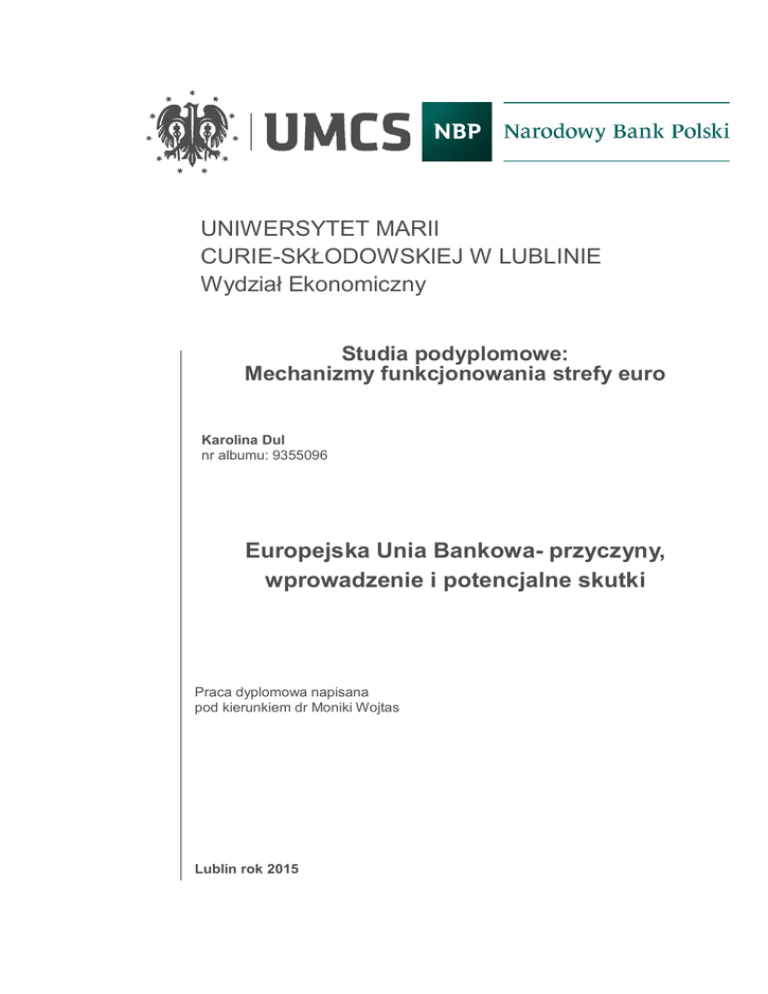 UNIWERSYTET MARII CURIE-SKŁODOWSKIEJ W LUBLINIE Wydział Ekonomiczny Studia podyplomowe: Mechanizmy funkcjonowania strefy euro Karolina Dul nr albumu: 9355096 Europejska Unia Bankowa- przyczyny, wprowadzenie i potencjalne skutki nr albumu: …. Imię i nazwisko Praca dyplomowa napisana pod kierunkiem dr Moniki Wojtas Lublin rok 2015 Spis treści Wstęp .................................................................................................................. 3 1. Historia i przyczyny powstania unii bankowej ............................................. 5 2. Działanie unii bankowej ............................................................................... 11 3. Skutki wprowadzenia unii bankowej w krajach Unii Europejskiej ze szczególnym naciskiem na Polskę .................................................................... 18 Zakończenie...................................................................................................... 25 Bibliografia....................................................................................................... 27 Spis rysunków .................................................................................................. 29 Spis tabel .......................................................................................................... 29 2 Wstęp Kryzysy finansowe związane są z systemami gospodarczymi od zarania kapitalizmu w XVII wieku. Są to najbardziej spektakularne zdarzenia XX i początku XXI wieku. Ich skutki potrafią być ogromne: bezrobocie, ubóstwo ludności, upadki banków i innych instytucji finansowych. Kryzys może zaprowadzić nawet do upadku rządów czy wybuchu wojny1. Najnowszy kryzys finansowy, który rozpoczął się w 2007 roku pokazuje, że aktualnie priorytetem rządów światowych i Unii Europejskiej powinno być podjęcie takich działań, które będą mogły w przyszłości zapobiec kryzysom, a ich ewentualne skutki obniżyć do jak najmniejszego poziomu. Kryzys finansowy, który dotknął kraje Unii Europejskiej wywołał ogromną liczbę głosów, debat i pomysłów na to jak zabezpieczyć się na przyszłość przed kolejnym wstrząsem. Głównym zabezpieczeniem ma być wprowadzenie unii bankowej. Zadaniami unii bankowej powinno być przede wszystkim zobligowanie banków do większej dyscypliny finansowo- kredytowej oraz zobowiązanie państw członkowskich do większej dyscypliny fiskalnej. Dotychczasowa liberalizacja prawa oraz rozczłonkowanie nadzorów pod jakimi znajdowały się poszczególne filie banków doprowadziły do upadków największych banków Europy. Unia bankowa powinna być w przyszłości ostoją bezpieczeństwa dla rynków finansowych i sektora bankowego, a przede wszystkim zapewnić bezpieczeństwo i spokój klientom korzystającym z usług instytucji finansowych. Założenia unii bankowej to wprowadzenie jednolitych regulacji dotyczących mechanizmów nadzorczych, mechanizmu restrukturyzacji i uporządkowanej likwidacji oraz europejskiego systemu gwarantowania depozytów. Celem niniejszej pracy jest odpowiedź na pytanie czym będzie unia bankowa oraz czy jest możliwe jej wprowadzenie na ustalonych zasadach w założonym terminie. Czy gospodarki krajów Unii Europejskiej są gotowe na zmiany. 1 http://www.psz.pl/118-gospodarka/kryzysy-finansowe-xx-wieku (28.05.2015). 3 W punkcie pierwszym omówiono genezę i przyczyny powstania unii bankowej oraz harmonogram wprowadzania poszczególnych etapów. Punkt drugi przedstawia działanie poszczególnych założeń unii bankowej i współzależność poszczególnych modułów. W punkcie trzecim skupiono się na możliwych pozytywnych i negatywnych skutkach wprowadzenia unii bankowej w krajach Unii Europejskiej. Głównie omówiony został problem przystąpienia Polski do unii bankowej. Dla potrzeb napisania pracy posłużono się dostępną literaturą, krytyczną analizą źródeł internetowych a także sprawozdaniami i zarządzeniami organów europejskich. 4 1. Historia i przyczyny powstania unii bankowej Od 2007 roku globalne rynki finansowe i bankowe zostały dotknięte kryzysem gospodarczym, którego początków należy dopatrywać się w Stanach Zjednoczonych Ameryki. Do powstania kryzysu przyczyniły się kredyty subprime i mortgage czyli takie, które były przyznawane osobom o zbyt niskiej zdolności kredytowej ( zła historia kredytowa czy brak dochodów) w zamian za wysokie oprocentowanie mające wynagrodzić bankom ryzyko braku spłaty2. Kryzys, który dotknął rynki finansowe i bankowe USA rozprzestrzenił się w szybkim tempie na pozostałe rynki światowe w tym na rynki krajów Unii Europejskiej. W latach 2007- 2011 wiele państw UE borykało się z problemami finansowymi na rynku hipotecznym, bankowym oraz ze zbyt wysokim zadłużeniem państwowym. Zadłużenie takich krajów jak Włochy, Grecja, Hiszpania i Portugalia 3 czy przymus ratowania instytucji bankowych przez władze państwowe wywołały debatę na temat efektów działania instytucji nadzorczych. W związku z tym, że przyczyną kryzysu w strefie euro był zbyt wysoki poziom zadłużenia państw to wspólne działania powinny dążyć do zwiększenia dyscypliny fiskalnej oraz dotyczyć rozwiązań całościowych systemu bankowego4. publicznym rozumianym jako % PKB Zmiany w długu pokazuje tabela 1. Tabela 1. Dług publiczny wybranych państw Unii Europejskiej rozumiany jako % Produktu Krajowego Brutto w latach 2007- 2011 Kraj/Rok 2007 208 2009 2010 2011 Cypr 58,3 48,3 58 61,3 71,1 Francja 63,9 67,7 78,3 82,4 85,8 Grecja 105,4 110,7 127,1 148,3 170,3 Hiszpania 36,1 39,8 53,3 61,5 69,3 Irlandia 25,0 44,4 65,6 92,1 106,4 Niemcy 64,9 66,3 73,5 82,4 80,4 2 http://www.consumerfinance.gov/askcfpb/110/what-is-a-subprime-mortgage.html (8.02.2015). M. Zaleska, Unia bankowa, Wyd. Difin, Warszawa 2013, s. 30. 4 M. Zaleska, Unia, op. cit., s. 30. 3 5 Polska 45 47,1 50,9 54,8 56,2 Portugalia 68,3 71,6 83 94 108,3 Węgry 66,1 72,3 78,4 81,8 81,4 Włochy 10