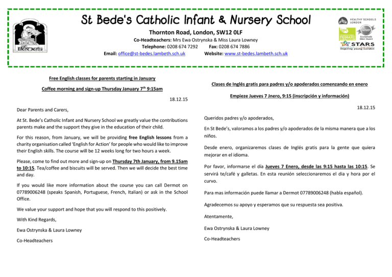 Thornton Road, London, SW12 0LF Co-Headteachers: Mrs Ewa Ostrynska & Miss Laura Lowney Telephone: 0208 674 7292 Fax: 0208 674 7886 Email: [email protected] Website: www.st-bedes.lambeth.sch.uk Free English classes for parents starting in January Clases de Inglés gratis para padres y/o apoderados comenzando en enero Coffee morning and sign-up Thursday January 7th 9:15am 18.12.15 Empieze Jueves 7 Jnero, 9:15 (inscripción y información) 18.12.15 Dear Parents and Carers, At St. Bede’s Catholic Infant and Nursery School we greatly value the contributions parents make and the support they give in the education of their child. For this reason, from January, we will be providing free English lessons from a charity organisation called ‘English for Action’ for people who would like to improve their English skills. The course will be 12 weeks long for two hours a week. Please, come to find out more and sign-up on Thursday 7th January, from 9.15am to 10:15. Tea/coffee and biscuits will be served. Then we will decide the best time and day. If you would like more information about the course you can call Dermot on 07789006248 (speaks Spanish, Portuguese, French, Italian) or ask in the School Office. We value your support and hope that you will respond to this positively. With Kind Regards, Queridos padres y/o apoderados, En St Bede’s, valoramos a los padres y/o apoderados de la misma manera que a los niños. Desde enero, organizaremos clases de Inglés gratis para la gente que quiera mejorar en el idioma. Por favor, informarse el día Jueves 7 Enero, desde las 9:15 hasta las 10:15. Se servirá te/café y galletas. En esta reunión seleccionaremos el dia y hora por el curvo. Para mas información puede llamar a Dermot 07789006248 (habla español). Agradecemos su apoyo y esperamos que su respuesta sea positiva. Atentamente, Ewa Ostrynska & Laura Lowney Ewa Ostrynska & Laura Lowney Co-Headteachers Co-Headteachers Aulas gratuitas de inglês para os pais, a partir de Janeiro Darmowa nauka angielskiego dla Rodzicòw od stycznia Dia de informação e inscrição Spotkanie i zapisy w czwartek 7mego stycznia, o 9.15 rano 18.12.15 18.12.15 Queridos país/encarregados de educação, Na Escola St Bede’s nós valorizamos os pais bem como as crianças que frequentam a nossa escola. A partir de Janeiro, oferecemos aulas gratuitas de inglês para todos aqueles que desejam melhorar e ou aprender o inglés. O curso tem a duração de 12 semanas. As aulas serão mais ou menos 2h por semana. Por favor, compareça Quinta-Feira 7 de Janeiro, entre 09:15 – 10:15. Chá / café e biscoitos serão servidos. Nesta reunião vamos escolher o dia e a hora, para que estas aulas aconteçam, por isso compareça e dê a sua opinião. Para mais informações ligue para o número 07969876564 (falo português) Nós valorizamos o seu apoio e esperamos que você compareça e apoie esta iniciativa, podendo assim ajudar-se e ao seu filho/a na escola. Atenciosamente, Ewa Ostrynska & Laura Lowney Co-Headteachers Drodzy Rodzice, W naszej szkole, St Bede’s, szczegòlnie cenimy wkĨad i wszelką pomoc Rodzicòw w nauczaniu swoich dzieci. Dlatego też, od stycznia, szkoĨa oferuje darmowe lekcje angielskiego, ktòre bedą prowadzone przez akcję charatatywną ‘English for Action’. Zajęcia przewidziane są dla tych,ktòrzy chcieliby polepszyć znajomość języka angielskiego. Kurs będzie trwaĨ 12 tygodni ,po dwie godziny tygodniowo. Dalsze szczegòĨy będą przekazane na naszym spotkaniu 7-go stycznia, od 9.15 10.15, przy herbatce i ciastku. Podczas zebrania ustalimy dalsze daty spotkań. Więcej informacji o kursie mogą Państwo ròwnież zasięgnąć, dzwoniąc pod numer 07969876564 (pan Dermot), lub też w szkolnej recepcji. Mamy nadzieję, że nasza propozycja będzie dla Państwa atrakcyjna i że na nasze pierwsze spotkanie zgĨosi sie wielu chętnych Rodzicòw. Z poważaniem, Ewa Ostrynska & Laura Lowney