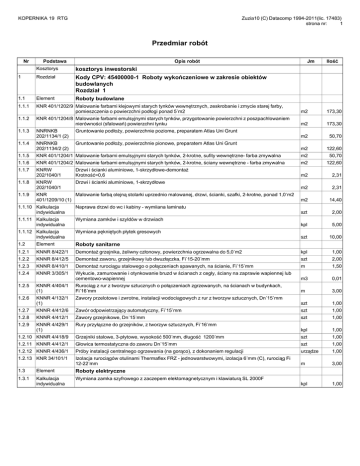 KOPERNIKA 19 RTG Zuzia10 (C) Datacomp 1994-2011(lic. 17483) strona nr: 1 Przedmiar robót Nr Podstawa <!--TAG#PRZDM#PODST--!> Opis robót Jm Ilość Kosztorys kosztorys inwestorski 1 Rozdział Kody CPV: 45400000-1 Roboty wykończeniowe w zakresie obiektów budowlanych Rozdział 1 1.1 Element Roboty budowlane 1.1.1 KNR 401/1202/9 Malowanie farbami klejowymi starych tynków wewnętrznych, zeskrobanie i zmycie starej farby, pomieszczenia o powierzchni podłogi ponad 5˙m2 m2 173,30 KNR 401/1204/8 Malowanie farbami emulsyjnymi starych tynków, przygotowanie powierzchni z poszpachlowaniem nierówności (sfalowań) powierzchni tynku m2 173,30 NNRNKB 202/1134/1 (2) Gruntowanie podłoży, powierzchnie poziome, preparatem Atlas Uni Grunt m2 50,70 NNRNKB 202/1134/2 (2) Gruntowanie podłoży, powierzchnie pionowe, preparatem Atlas Uni Grunt m2 122,60 1.1.2 1.1.3 1.1.4 1.1.5 KNR 401/1204/1 Malowanie farbami emulsyjnymi starych tynków, 2-krotne, sufity wewnętrzne- farba zmywalna m2 50,70 1.1.6 KNR 401/1204/2 Malowanie farbami emulsyjnymi starych tynków, 2-krotne, ściany wewnętrzne - farba zmywalna m2 122,60 1.1.7 KNRW 202/1040/1 Drzwi i ścianki aluminiowe, 1-skrzydłowe-demontaż Krotność=0,6 m2 2,31 KNRW 202/1040/1 Drzwi i ścianki aluminiowe, 1-skrzydłowe m2 2,31 m2 14,40 szt 2,00 kpl 5,00 szt 10,00 1.1.8 1.1.9 KNR Malowanie farbą olejną stolarki uprzednio malowanej, drzwi, ścianki, szafki, 2-krotne, ponad 1,0˙m2 401/1209/10 (1) 1.1.10 Kalkulacja indywidualna Naprawa drzwi do wc i kabiny - wymiiana laminatu 1.1.11 Kalkulacja indywidualna Wymiana zamków i szyldów w drzwiach 1.1.12 Kalkulacja indywidualna Wymiana pękniętych płytek gresowych 1.2 Element Roboty sanitarne 1.2.1 KNNR 8/422/1 Demontaż grzejnika, żeliwny członowy, powierzchnia ogrzewalna do 5,0˙m2 kpl 1,00 1.2.2 KNNR 8/412/5 Demontaż zaworu, grzejnikowy lub dwuzłączka, Fi˙15-20˙mm szt 2,00 1.2.3 KNNR 8/410/1 Demontaż rurociągu stalowego o połączeniach spawanych, na ścianie, Fi˙15˙mm m 1,50 1.2.4 KNNR 3/305/1 Wykucie, zamurowanie i otynkowanie bruzd w ścianach z cegły, ściany na zaprawie wapiennej lub cementowo-wapiennej m3 0,01 KNNR 4/404/1 (1) Rurociąg z rur z tworzyw sztucznych o połączeniach zgrzewanych, na ścianach w budynkach, Fi˙16˙mm m 3,00 KNNR 4/132/1 (1) Zawory przelotowe i zwrotne, instalacji wodociągowych z rur z tworzyw sztucznych, Dn˙15˙mm szt 1,00 1.2.7 KNNR 4/412/6 Zawór odpowietrzający automatyczny, Fi˙15˙mm szt 1,00 1.2.8 KNNR 4/412/1 Zawory grzejnikowe, Dn˙15˙mm szt 1,00 1.2.9 KNNR 4/429/1 (1) Rury przyłączne do grzejników, z tworzyw sztucznych, Fi˙16˙mm kpl 1,00 1.2.5 1.2.6 1.2.10 KNNR 4/418/9 Grzejniki stalowe, 3-płytowe, wysokość 500˙mm, długość 1200˙mm szt 1,00 1.2.11 KNNR 4/412/1 Głowica termostatyczna do zaworu Dn˙15˙mm szt 1,00 1.2.12 KNNR 4/436/1 Próby instalacji centralnego ogrzewania (na gorąco), z dokonaniem regulacji urządze 1,00 1.2.13 KNR 34/101/1 Izolacja rurociągów otulinami Thermaflex FRZ - jednowarstwowymi, izolacja 6˙mm (C), rurociąg Fi 12-22˙mm m 3,00 kpl 1,00 1.3 Element Roboty elektryczne 1.3.1 Kalkulacja indywidualna Wymiana zamka szyfrowego z zaczepem elektomagnetycznym i klawiaturą SL 2000F