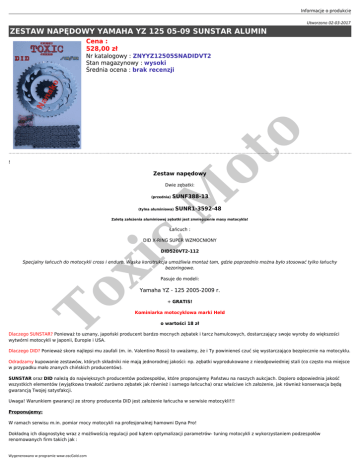 Informacje o produkcie Utworzono 02-03-2017 ZESTAW NAPĘDOWY YAMAHA YZ 125 05-09 SUNSTAR ALUMIN Cena : 528,00 zł ot o Nr katalogowy : ZNYYZ12505SNADIDVT2 Stan magazynowy : wysoki Średnia ocena : brak recenzji ! Zestaw napędowy M Dwie zębatki: (przednia) SUNF388-13 (tylna aluminiowa) SUNR1-3592-48 Zaletą założenia aluminiowej zębatki jest zmniejszenie masy motocykla! c Łańcuch : DID X-RING SUPER WZMOCNIONY xi DID520VT2-112 Specjalny łańcuch do motocykli cross i enduro, Wąska konstrukcja umożliwia montaż tam, gdzie poprzednio można było stosować tylko łańuchy bezoringowe. To Pasuje do modeli: Yamaha YZ - 125 2005-2009 r. + GRATIS! Kominiarka motocyklowa marki Held o wartości 18 zł Dlaczego SUNSTAR? Ponieważ to uznany, japoński producent bardzo mocnych zębatek i tarcz hamulcowych, dostarczający swoje wyroby do większości wytwórni motocykli w Japonii, Europie i USA. Dlaczego DID? Ponieważ skoro najlepsi mu zaufali (m. in. Valentino Rossi) to uważamy, że i Ty powinieneś czuć się wystarczająco bezpiecznie na motocyklu. Odradzamy kupowanie zestawów, których składniki nie mają jednorodnej jakości: np. zębatki wyprodukowane z nieodpowiedniej stali (co często ma miejsce w przypadku mało znanych chińskich producentów). SUNSTAR oraz DID należą do największych producentów podzespołów, które proponujemy Państwu na naszych aukcjach. Dopiero odpowiednia jakość wszystkich elementów (wyjątkowa trwałość zarówno zębatek jak również i samego łańcucha) oraz właściwe ich założenie, jak również konserwacja będą gwarancją Twojej satysfakcji. Uwaga! Warunkiem gwarancji ze strony producenta DID jest założenie łańcucha w serwisie motocykli!!! Proponujemy: W ramach serwisu m.in. pomiar mocy motocykli na profesjonalnej hamowni Dyna Pro! Dokładną ich diagnostykę wraz z możliwością regulacji pod kątem optymalizacji parametrów- tuning motocykli z wykorzystaniem podzespołów renomowanych firm takich jak : Wygenerowano w programie www.oscGold.com Rapid Bike Power Commander Bazzaz To xi c M ot o Jako jedyni w polsce świadczymy usługi chip tuningu oferowane w ramach osiągnięć amerykańskiej firmy ECUnleashed.