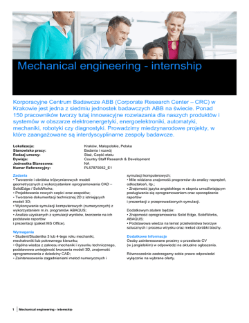 Mechanical engineering - internship Korporacyjne Centrum Badawcze ABB (Corporate Research Center – CRC) w Krakowie jest jedna z siedmiu jednostek badawczych ABB na świecie. Ponad 150 pracowników tworzy tutaj innowacyjne rozwiazania dla naszych produktów i systemów w obszarze elektroenergetyki, energoelektroniki, automatyki, mechaniki, robotyki czy diagnostyki. Prowadzimy miedzynarodowe projekty, w które zaangażowane są interdyscyplinarne zespoły badawcze. Lokalizacja: Stanowisko pracy: Rodzaj umowy: Dywizja: Jednostka Biznesowa: Numer Referencyjny: Kraków, Malopolskie, Polska Badania i rozwój Staż, Część etatu Country Staff Research & Development NA PL57870052_E1 Zadania • Tworzenie i obróbka trójwymiarowych modeli geometrycznych z wykorzystaniem oprogramowania CAD – SolidEdge / SolidWorks; • Projektowanie nowych części oraz zespołów; • Tworzenie dokumentacji technicznej 2D z istniejących modeli 3D; • Wykonywanie symulacji komputerowych (numerycznych) z wykorzystaniem m.in. programów ABAQUS; • Analiza uzyskanych z symulacji wyników, tworzenie na ich podstawie raportów i prezentacji (pakiet MS Office). Wymagania • Student/Studentka 3 lub 4-tego roku mechaniki, mechatroniki lub pokrewnego kierunku; • Ogólna wiedza z zakresu mechaniki i rysunku technicznego, podstawowa umiejętność tworzenia modeli 3D, znajomość oprogramowania z dziedziny CAD; • Zainteresowanie zagadnieniami metod numerycznych i 1 Mechanical engineering - internship symulacji komputerowych; • Mile widziana znajomość programów do analizy naprężeń, odkształceń, itp.; • Znajomość języka angielskiego w stopniu umożliwiającym posługiwanie się oprogramowaniem oraz sporządzenie raportów i prezentacji z przeprowadzonych symulacji. Dodatkowym atutem będzie: • Znajomość oprogramowania Solid Edge, SolidWorks, ABAQUS; • Podstawowa wiedza na temat przetwórstwa tworzyw sztucznych i procesu wtrysku oraz metod obróbki blachy. Dodatkowe Informacje Osoby zainteresowane prosimy o przesłanie CV (w j.angielskim) w odpowiedzi na aktualne ogłoszenia. Równocześnie zastrzegamy sobie prawo odpowiedzi wyłącznie na wybrane oferty. Wszystkie aplikacje powinny zawierać klauzulę: "Wyrażam zgodę na przetwarzanie moich danych osobowych zawartych w ofercie pracy dla potrzeb procesu rekrutacji zgodnie z ustawą z dnia 27.08.1997r. Dz. U. z 2002r., Nr 101, poz. 923 ze zm. dla potrzeb niezbędnych do realizacji procesu rekrutacji". ABB (www.abb.com) jest liderem w technologiach dla energetyki i automatyki, które pozwalają klientom przemysłowym oraz zakładom użyteczności publicznej zwiększyć swoją efektywność, jednocześnie minimalizując oddziaływanie na środowisko naturalne. Grupa ABB zatrudnia około 140 000 pracowników w blisko 100 krajach świata. Our ambition. Your legacy. 2 Mechanical engineering - internship