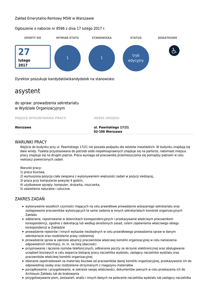 Zakład Emerytalno-Rentowy MSW w Warszawie Ogłoszenie o naborze nr 8596 z dnia 17 lutego 2017 r. OFERTY DO 27 lutego 2017 WYMIAR ETATU STANOWISKA STATUS 1 1 tryb edycyjny DODATKOWE Dyrektor poszukuje kandydatów\kandydatek na stanowisko: asystent do spraw: prowadzenia sekretariatu w Wydziale Organizacyjnym MIEJSCE WYKONYWANIA PRACY: ADRES URZĘDU: Warszawa ul. Pawińskiego 17/21 02-106 Warszawa WARUNKI PRACY Wejście do budynku przy ul. Pawińskiego 17/21 nie posiada podjazdu dla wózków inwalidzkich. W budynku znajdują się dwie windy. Toaleta przystosowana do potrzeb osób niepełnosprawnych znajduje się na parterze, natomiast miejsce pracy znajduje się na drugim piętrze. Praca wymaga od pracownika przemieszczania się pomiędzy piętrami w celu realizacji powierzonych zadań. Warunki pracy: 1) praca biurowa, 2) wymuszona pozycja ciała związana z wykonywaniem większości zadań w pozycji siedzącej, 3) praca przy komputerze powyżej 4 godzin, 4) użytkowane sprzęty: komputer, drukarka, niszczarka, 5) oświetlenie naturalne i sztuczne. ZAKRES ZADAŃ wykonywanie wszelkich czynności mających na celu prawidłowe prowadzenie wskazanego sekretariatu oraz zastępowanie pracowników wykonujących te same zadania w innych sekretariatach komórek organizacyjnych Zakładu odbieranie, rejestrowanie w dziennikach korespondencyjnych i przekazywanie właściwym pracownikom korespondencji, zgodnie z dekretacją lub według określonych zasad, celem zapewnienia właściwego obiegu korespondencji w Zakładzie prowadzenie rejestrów i innych wykazów niezbędnych w celu prawidłowego prowadzenia spraw w danym sekretariacie oraz rozdzielanie prasy codziennej prowadzenie spraw w zakresie absencji pracowników właściwej komórki organizacyjnej w celu naniesienia odpowiednich informacji, m. in. na listę obecności przyjmowanie i łączenie rozmów telefonicznych, odbieranie poczty ze skrzynki elektronicznej oraz obsługiwanie urządzeń biurowych w celu wsparcia bieżącej pracy naczelnika wydziału, zastępcy naczelnika wydziału oraz pracowników właściwej komórki organizacyjnej zbieranie zapotrzebowań na materiały biurowe od pracowników danej komórki organizacyjnej, przekazywanie ich do odpowiedniej osoby oraz rozdzielanie otrzymanych z magazynu materiałów porządkowanie i przygotowanie, w zakresie swojej właściwości, dokumentów jawnych w celu przekazania ich do Archiwum Zakładu lub do brakowania przygotowywanie pism, zestawień, analiz i innych danych na polecenie naczelnika wydziału lub zastępcy naczelnika wydziału w celu wsparcia ich bieżącej pracy WYMAGANIA NIEZBĘDNE Wykształcenie: średnie umiejętność obsługi urządzeń biurowych (faks, komputer, niszczarka, kserokopiarka) oraz poczty elektronicznej) umiejętność organizacji pracy własnej umiejętność współpracy znajomość programów MS Word, MS Excel umiejętność działania w sytuacjach pod presją czasu wysoka kultura osobista Posiadanie obywatelstwa polskiego Korzystanie z pełni praw publicznych Nieskazanie prawomocnym wyrokiem za umyślne przestępstwo lub umyśle przestępstwo skarbowe WYMAGANIA DODATKOWE Wykształcenie: średnie policealne studium sekretarek lub kurs sekretarski doświadczenie zawodowe: na stanowisku sekretarki lub pracownika kancelarii w administracji publicznej posiadanie umiejętności interpersonalnych DOKUMENTY I OŚWIADCZENIA NIEZBĘDNE Życiorys/CV i list motywacyjny Kopie dokumentów potwierdzających spełnienie wymagania niezbędnego w zakresie wykształcenia Oświadczenie o posiadaniu obywatelstwa polskiego albo kopia dokumentu potwierdzającego posiadanie polskiego obywatelstwa Oświadczenie o wyrażeniu zgody na przetwarzanie danych osobowych do celów naboru Oświadczenie o korzystaniu z pełni praw publicznych Oświadczenie o nieskazaniu prawomocnym wyrokiem za umyślne przestępstwo lub umyślne przestępstwo skarbowe DOKUMENTY I OŚWIADCZENIA DODATKOWE kopia dokumentu potwierdzającego niepełnosprawność - w przypadku kandydatek/kandydatów, zamierzających skorzystać z pierwszeństwa w zatrudnieniu w przypadku, gdy znajdą się w gronie najlepszych kandydatek/kandydatów Kopie dokumentów potwierdzających spełnienie wymagania dodatkowego w zakresie wykształcenia Kopie dokumentów potwierdzających spełnienie wymagania dodatkowego w zakresie doświadczenia zawodowego / stażu pracy TERMINY I MIEJSCE SKŁADANIA DOKUMENTÓW Dokumenty należy złożyć do: 27 lutego 2017 r. Decyduje data: wpływu oferty do urzędu Miejsce składania dokumentów: Zakład Emerytalno-Rentowy Ministerstwa Spraw Wewnętrznych ul. Pawińskiego 17/21 02-106 Warszawa INNE INFORMACJE: W miesiącu poprzedzającym datę upublicznienia ogłoszenia wskaźnik zatrudnienia osób niepełnosprawnych w urzędzie, w rozumieniu przepisów o rehabilitacji zawodowej i społecznej oraz zatrudnianiu osób niepełnosprawnych, nie wynosi co najmniej 6%. Na kopercie oraz w liście motywacyjnym należy zamieścić nr ogłoszenia z BIP KPRM lub nazwę stanowiska pracy. Wymagane oświadczenia prosimy składać zgodnie ze wzorem zamieszczonym na stronie BIP ZER w zakładce Praca w ZER MSW > Dokumenty do pobrania http://www.zer.bip.msw.gov.pl/zer/praca-w-zer-msw/dokumenty-do-pobrania/5123,Oswiadczenie-kandydata.html Weryfikacja spełniania przez kandydatów wymagań formalnych dokonana zostanie na podstawie dokumentów wymienionych w części „DOKUMENTY I OŚWIADCZENIA NIEZBĘDNE”. W związku z tym informujemy, że aplikacje kompletne to takie, które zawierają wszystkie wymagane dokumenty i własnoręcznie podpisane oświadczenia. Odrzucone dokumenty aplikacyjne zostaną komisyjne zniszczone. Kandydaci zakwalifikowani do kolejnego etapu weryfikacji zostaną powiadomieni mailowo. Zachęcamy osoby z niepełnosprawnością do przesyłania swoich dokumentów aplikacyjnych (z uwzględnieniem informacji umieszczonych w części "WARUNKI PRACY"). Nasz urząd jest pracodawcą równych szans i wszystkie apli