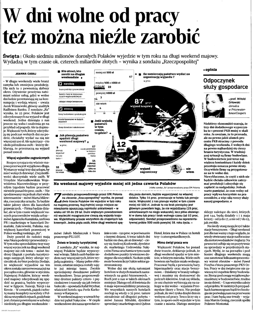 W dni wolne od pracy też można nieźle zarobić Święta l Około siedmiu milionów dorosłych Polaków wyjedzie w tym roku na długi weekend majowy. Wydadzą w tym czasie ok. czterech miliardów złotych - wynika z sondażu „Rzeczpospolitej" JOANNA CABAJ - W długie weekendy wiele branż zamyka lub zmniejsza produkcję. Dla nich to z pewnością słabszy okres. Ożywienie przeżywa natomiast sektor ushig, gdyż w wolne dni ludzie przestawiają się na konsumpcję i wydają więcej - uważa Jacek Wiśniewski, główny analityk Raiffeisen Banku. Z sondażu „Rz" wynika, że 23 proc. Polaków jest zdecydowanych na wyjazd w długi weekend. Jedna dziesiąta z nas jeszcze się waha i uzależnia go na przykład od pogody. Ale ta dopisuje. Większość tych, którzy zdecydują się podczas wolnych dni na podróż, chciałaby wydać na nią nie więcej niż 500 zł. Ale są też tacy - i to około pół miliona osób - którzy deklarują, że przeznaczą na wyjazd ponad 1000 zł. Więcej wyjazdów zagranicznych Rozpoczynająca się właśnie majowa przerwajest wyjątkowo długa. Wystarczy wziąć trzy dni urlopu, by mieć wolnych dziewięć. Z tej możliwości skorzystało wiele osób. W Urzędzie Marszałkowskim Województwa Mazowieckiego w przyszłym tygodniu będzie pracować niewiele ponad 60 proc. osób. - Nie spodziewamy się jednak zbyt wielu interesantów - mówi Marta Milewska, rzeczniczka urzędu. To będzie także jałowy okres dla kancelarii prawniczych. - Firma będzie działać, ale w tym czasie większość naszych pracowników wzięła urlop mówi Agnieszka Kamińska, szefowa PR i marketingu w kancelarii Domański, Zakrzewski, Pałinka, największej kancelarii prawniczej w Polsce według rankingu „Rz". Duży powód do radości mają więc biura podróży i przewoźnicy. W tym roku sprzedaliśmy trzy razy więcej wycieczek na długi weekend majowy niż rok temu - mówi Andrzej Glapiak z portalu turystycznego easygo.pl, który oferuje wycieczki ok 60 biur podróży. Dodaje, że większość wyjazdów na ten okres została zarezerwowana już na początku roku, głównie w styczniu. Najwięcej Polaków, którzy weekend majowy zdecydowali się spędzić za granicą, będzie wypoczywać w Egipcie, Tunezji, Turcji i na Krecie. - W czwartek, piątek i sobotę mamy komplety na wyloty z Polski na wszystkich rejsach, podobnie j est z lotami powrotnymi w sobotę i niedzielę po długim weekendzie - Kto straci, kto zarobi na długim weekendzie t mniej niż SOD zł 67 między 500 a 1000 zł Q zarobią Ile zamierzają państwo wydać na organizację wyjazdu ? w proc. 22 biura podróży i przewoźnicy hotele i bary w miejscowościach wypoczynkowych H stracą firmy budowlane i produkcyjne finny doradcze i szkoleniowe | Jak planują państwo spędzić długi weekend majowy? Odpoczynek służy gospodarce \ sklepy l stacje benzynowe hotele biznesowe w dużych miastach +opinia JeśU wyjadą państwo w tym czasie, to gdzie? w proc. -—- raczej pozostanę * w miejscu zamieszkania wiem Na weekend majowy wyjedzie mniej niż jedna czwarta Polaków źródła: sondaż „Rz" przeprowadzony przez GfK Polonia sondażu przeprowadzonego przez GfK Polonia na zlecenie „Rzeczpospolitej" wynika, że ponad dwie trzecie Polaków nie wyjedzie w tym roku na majową przerwę. Najchętniej swoje miejsce zamieszkania opuszczają najmłodsi ankietowani - w wieku od 18 do 29 lat. Dużo większym powodzeniem niż wycieczki mzagraniczne cieszą się wyjazdy krajowe. Wyjeżdżamy przede wszystkim do znajomych lub krewnych. Jedna piąta osób, które długi weekend spę- Z mówi Jakub Mielniczuk z biura prasowego PLL LOT. Żniwa w branży turystycznej Z sondażu „Rz" wynika, że najwięcej Polaków będzie wypoczywać w kraju. Takich osób będzie siedem razy więcej niż tych, które wyjadązagranicę. - Mamypełne obłożenie, ostatnie miejsca zostały zajęte już miesiąc temu. Zwykle sprzedajemy dwudniowe pakiety weekendowe. Teraz proponowaliśmy droższe pakiety cztero- i pięciodniowe i rozeszły się jak świeże bułeczki - opowiada Rafał Strychar, właściciel hotelu spa Perła Karkonoszy w Karpaczu. W weekend majowy w szwach będzie też pękał Nałęczów. - W ciepłe weekendowe dni nasza sprzedaż ro- dzą poza domem, będzie wypoczywać na własnej działce. Tylko 14 proc. przenocuje w hotelu lub pensjonacie. Większość z nas planuje wydać w tym czasie mniej niż 500 zł. Jednak to nie brak pieniędzy jest głównym powodem tego, że nie wyjeżdżamy (19 proc. ankietowanych na niego wskazało), lecz pilne obowiązki w domu lub pracy i brak wolnego czasu (aż 52 proc. odpowiedzi). Sondaż przeprowadzono na reprezentatywnej próbie 500 osób powyżej 18. roku życia « śnie o 100 -150 proc. w porównaniu z innymi dniami. A teraz takich dni będzie nie dwa, ale aż dziewięć - cieszy się Andrzej Kozłowski, dyrektor ds. marketingu Uzdrowiska Nałęczów. Firma uruchamia w tym czasie dodatkowe punkty żywieniowe dostępne dla wszystkich. Na duże zyski może bowiem liczyć także sektor gastronomiczny. Wolne dni nie służą natomiast hotelom w dużych miastach nastawionych na gości biznesowych. Ruch jest u nas w takich okresach mniejszy. Dlatego od 28 kwietnia do 6 maja wprowadziliśmy promocję. We wszystkich naszych hotelach noclegi są wtedy o 35 proc. tańsze niezależnie od długości pobytu mówi Janusz Mitulski, dyrektor sprzedaży i marketingu sieci Qubus Hotel, która ma w Polsce 12 hoteli trzy- i czterogwiazdkowych. Mimo świąt praca wre Większość Polaków, bo ponad dwie trzecie, deklaruje jednak, że długi weekend spędzi w tym mieście, w którym mieszka. Wiele osób bowiem nie będzie miało wolnego. Pracować będą z pewnością bary, hipermarkety oraz stacje benzynowe. - Działamy wbranżyusługowej i musimy się dostosować do potrzeb klientów. A tak się składa, że oni chętnie wybierają się na zakupy w dni wolne - wyjaśnia Przemysław Skory z Tesco. Nie podaje jednak