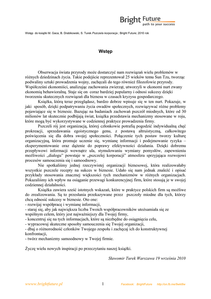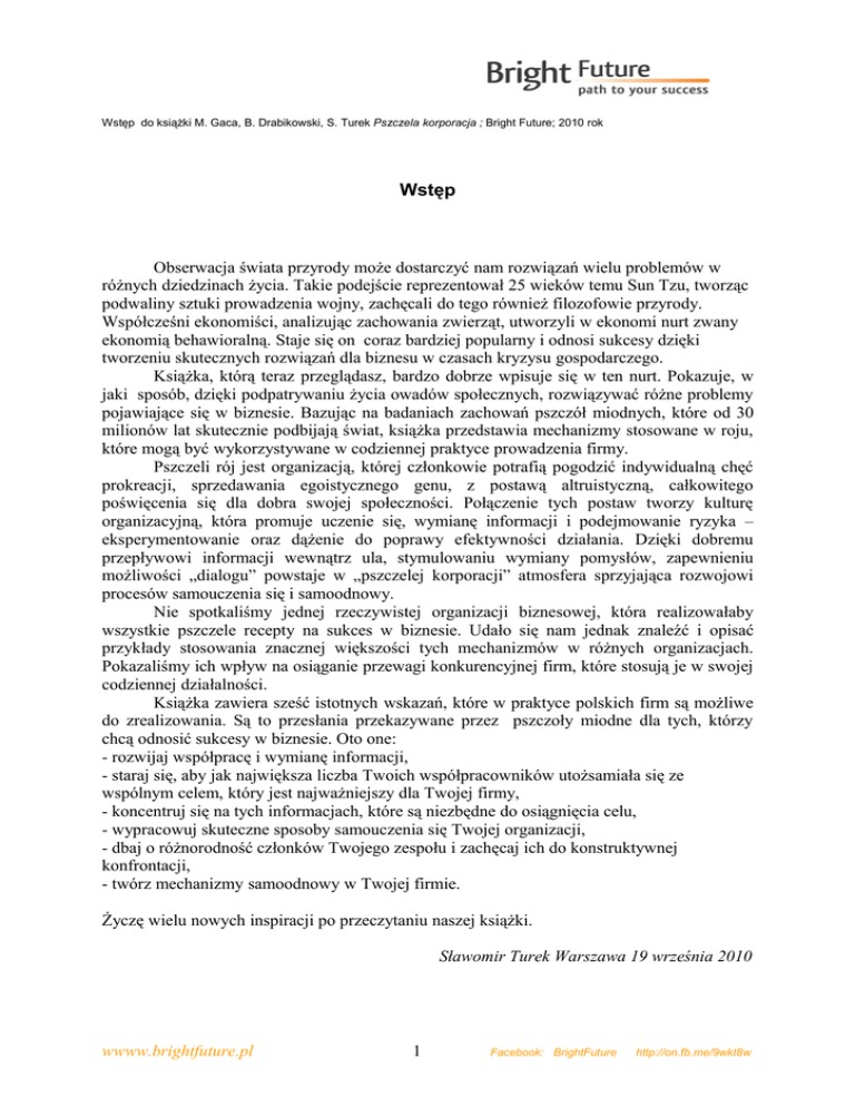 Wstęp do książki M. Gaca, B. Drabikowski, S. Turek Pszczela korporacja ; Bright Future; 2010 rok Wstęp Obserwacja świata przyrody może dostarczyć nam rozwiązań wielu problemów w różnych dziedzinach życia. Takie podejście reprezentował 25 wieków temu Sun Tzu, tworząc podwaliny sztuki prowadzenia wojny, zachęcali do tego również filozofowie przyrody. Współcześni ekonomiści, analizując zachowania zwierząt, utworzyli w ekonomi nurt zwany ekonomią behawioralną. Staje się on coraz bardziej popularny i odnosi sukcesy dzięki tworzeniu skutecznych rozwiązań dla biznesu w czasach kryzysu gospodarczego. Książka, którą teraz przeglądasz, bardzo dobrze wpisuje się w ten nurt. Pokazuje, w jaki sposób, dzięki podpatrywaniu życia owadów społecznych, rozwiązywać różne problemy pojawiające się w biznesie. Bazując na badaniach zachowań pszczół miodnych, które od 30 milionów lat skutecznie podbijają świat, książka przedstawia mechanizmy stosowane w roju, które mogą być wykorzystywane w codziennej praktyce prowadzenia firmy. Pszczeli rój jest organizacją, której członkowie potrafią pogodzić indywidualną chęć prokreacji, sprzedawania egoistycznego genu, z postawą altruistyczną, całkowitego poświęcenia się dla dobra swojej społeczności. Połączenie tych postaw tworzy kulturę organizacyjną, która promuje uczenie się, wymianę informacji i podejmowanie ryzyka – eksperymentowanie oraz dążenie do poprawy efektywności działania. Dzięki dobremu przepływowi informacji wewnątrz ula, stymulowaniu wymiany pomysłów, zapewnieniu możliwości „dialogu” powstaje w „pszczelej korporacji” atmosfera sprzyjająca rozwojowi procesów samouczenia się i samoodnowy. Nie spotkaliśmy jednej rzeczywistej organizacji biznesowej, która realizowałaby wszystkie pszczele recepty na sukces w biznesie. Udało się nam jednak znaleźć i opisać przykłady stosowania znacznej większości tych mechanizmów w różnych organizacjach. Pokazaliśmy ich wpływ na osiąganie przewagi konkurencyjnej firm, które stosują je w swojej codziennej działalności. Książka zawiera sześć istotnych wskazań, które w praktyce polskich firm są możliwe do zrealizowania. Są to przesłania przekazywane przez pszczoły miodne dla tych, którzy chcą odnosić sukcesy w biznesie. Oto one: - rozwijaj współpracę i wymianę informacji, - staraj się, aby jak największa liczba Twoich współpracowników utożsamiała się ze wspólnym celem, który jest najważniejszy dla Twojej firmy, - koncentruj się na tych informacjach, które są niezbędne do osiągnięcia celu, - wypracowuj skuteczne sposoby samouczenia się Twojej organizacji, - dbaj o różnorodność członków Twojego zespołu i zachęcaj ich do konstruktywnej konfrontacji, - twórz mechanizmy samoodnowy w Twojej firmie. Życzę wielu nowych inspiracji po przeczytaniu naszej książki. Sławomir Turek Warszawa 19 września 2010 wwww.brightfuture.pl 1 Facebook: BrightFuture http://on.fb.me/9wkt8w