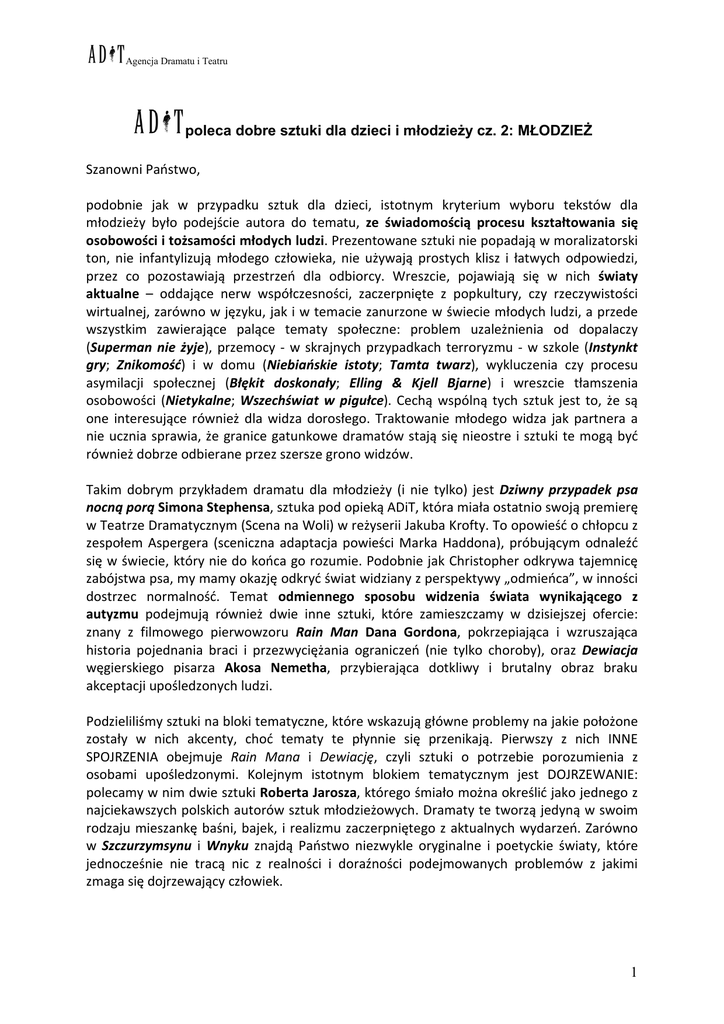 Agencja Dramatu i Teatru poleca dobre sztuki dla dzieci i młodzieŜy cz. 2: MŁODZIEś Szanowni Państwo, podobnie jak w przypadku sztuk dla dzieci, istotnym kryterium wyboru tekstów dla młodzieży było podejście autora do tematu, ze świadomością procesu kształtowania się osobowości i tożsamości młodych ludzi. Prezentowane sztuki nie popadają w moralizatorski ton, nie infantylizują młodego człowieka, nie używają prostych klisz i łatwych odpowiedzi, przez co pozostawiają przestrzeń dla odbiorcy. Wreszcie, pojawiają się w nich światy aktualne – oddające nerw współczesności, zaczerpnięte z popkultury, czy rzeczywistości wirtualnej, zarówno w języku, jak i w temacie zanurzone w świecie młodych ludzi, a przede wszystkim zawierające palące tematy społeczne: problem uzależnienia od dopalaczy (Superman nie żyje), przemocy - w skrajnych przypadkach terroryzmu - w szkole (Instynkt gry; Znikomość) i w domu (Niebiańskie istoty; Tamta twarz), wykluczenia czy procesu asymilacji społecznej (Błękit doskonały; Elling & Kjell Bjarne) i wreszcie tłamszenia osobowości (Nietykalne; Wszechświat w pigułce). Cechą wspólną tych sztuk jest to, że są one interesujące również dla widza dorosłego. Traktowanie młodego widza jak partnera a nie ucznia sprawia, że granice gatunkowe dramatów stają się nieostre i sztuki te mogą być również dobrze odbierane przez szersze grono widzów. Takim dobrym przykładem dramatu dla młodzieży (i nie tylko) jest Dziwny przypadek psa nocną porą Simona Stephensa, sztuka pod opieką ADiT, która miała ostatnio swoją premierę w Teatrze Dramatycznym (Scena na Woli) w reżyserii Jakuba Krofty. To opowieść o chłopcu z zespołem Aspergera (sceniczna adaptacja powieści Marka Haddona), próbującym odnaleźć się w świecie, który nie do końca go rozumie. Podobnie jak Christopher odkrywa tajemnicę zabójstwa psa, my mamy okazję odkryć świat widziany z perspektywy „odmieńca”, w inności dostrzec normalność. Temat odmiennego sposobu widzenia świata wynikającego z autyzmu podejmują również dwie inne sztuki, które zamieszczamy w dzisiejszej ofercie: znany z filmowego pierwowzoru Rain Man Dana Gordona, pokrzepiająca i wzruszająca historia pojednania braci i przezwyciężania ograniczeń (nie tylko choroby), oraz Dewiacja węgierskiego pisarza Akosa Nemetha, przybierająca dotkliwy i brutalny obraz braku akceptacji upośledzonych ludzi. Podzieliliśmy sztuki na bloki tematyczne, które wskazują główne problemy na jakie położone zostały w nich akcenty, choć tematy te płynnie się przenikają. Pierwszy z nich INNE SPOJRZENIA obejmuje Rain Mana i Dewiację, czyli sztuki o potrzebie porozumienia z osobami upośledzonymi. Kolejnym istotnym blokiem tematycznym jest DOJRZEWANIE: polecamy w nim dwie sztuki Roberta Jarosza, którego śmiało można określić jako jednego z najciekawszych polskich autorów sztuk młodzieżowych. Dramaty te tworzą jedyną w swoim rodzaju mieszankę baśni, bajek, i realizmu zaczerpniętego z aktualnych wydarzeń. Zarówno w Szczurzymsynu i Wnyku znajdą Państwo niezwykle oryginalne i poetyckie światy, które jednocześnie nie tracą nic z realności i doraźności podejmowanych problemów z jakimi zmaga się dojrzewający człowiek. 1 Agencja Dramatu i Teatru Pozostałe, wspomniane już wcześniej sztuki, przyporządkowaliśmy do pozostałych bloków tematycznych: WYKLUCZENIA, UZALEŻNIENIA, W SZKOLE, oraz W RODZINIE. Zapraszamy do lektury! * - gwiazdka przy tytule oznacza, że sztuka miała już swoją polską premierę. INNE SPOJRZENIA DAN GORDON Rain Man przekład: Julita Grodek obsada: 2K, 4M gatunek: sztuka psychologiczno-obyczajowa Sztuka powstała w 2009 r. jest zręczną adaptacją scenariusza filmu z r. 1988 o tym samym tytule. Dan Gordon zachował jego dramatyzm i komizm, proponując głęboką psychologiczną analizę związku dwóch skrajnie różnych od siebie braci. Choć autyzm nie jest tematem tej sztuki, dowiadujemy się z niej bardzo wiele o świecie dotkniętych tą chorobą. Dla ludzi zdrowych są oni często nową szansą doświadczenia samych siebie i duchowego rozwoju. Charlie Babitt, podobnie jak jego zmarły ojciec, ma kłopoty z okazywaniem miłości. Charlie zamiast fortuny otrzymuje w spadku... cierpiącego na autyzm genialnego pod względem matematycznym brata, który przebywa w zakładzie. Porywa Raymonda. Zamierza z niego uczynić zakładnika i w ten sposób dostać swoją część spadku, którego jedynym beneficjentem jest Ray. Materialistyczna motywacja zamienia się wkrótce w prawdziwą opiekuńczość i braterską więź. Bracia Babitt tworzą fantastyczny duet. Wyruszają w pełną przygód podróż. Postawieni w trudnych sytuacjach uczą się nowych umiejętności. Charlie zaczyna widzieć swój egoizm. Związek z Rayem wpływa także na jego stosunek do Susan. Ostatecznie Charlie odwozi brata do zakładu, zamierza się jednak ubiegać o opiekę nad nim. Ray jest odzyskanym Rain Manem, który w dzieciństwie był dla niego jedynym źródłem miłości i przyjaźni. Teraz Charlie ma szansę, żeby obdarzyć tym samym Raymonda. Spotkanie Rain Mana to dla Charliego także szansa na pogodzenie się ze zmarłym ojcem, który nie wiedział, jak go kochać. Godząc się z ojcem, godzi się jednocześnie z sobą samym. ÁKOS NÉMETH Dewiacja/Deviancia przekład: Jolanta Jarmołowicz obsada: 4K, 2M (Bea – 20 lat, Żaneta – 18 lat, Mona – nastolatka, Pani Rak – matka Bei i Żanety; Pan Janek, Pan Stasiu – ok. 60-tki) gatunek: dramat czas: współczesność, jesień miejsce: sklep ogrodniczy i kwiaciarnia, mieszkanie, sklepik z dewocjonaliami, pomieszczenie w więzieniu, pomieszczenie w szpitalu, autobus Historia rodzinna, w której śledzimy cierpienia autystycznej dziewczynki Żanety w środowisku, w którym każdy toczy żałosną walkę o przetrwanie, choć na wygraną nikt nie ma szans. Bea mimo młodego wieku prowadzi j