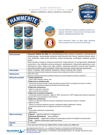 KARTA TECHNICZNA HAMMERITE FARBA NA METAL PROSTO NA RDZĘ młotkowa, półmatowa, matowa, połyskowa; różne kolory Formuła DUALTECH zapewnia podwójną ochronę malowanym elementom: tworzy barierę chroniącą przed wilgocią i zapobiega powstawaniu rdzy Farba Hammerite Prosto na Rdzę dzięki specjalnej formule zapewnia do 8 lat ochrony przed korozją INFORMACJE O PRODUKCIE Kolorystyka Hammerite PROSTO NA RDZĘ jest jednoskładnikową farbą schnącą na powietrzu, przeznaczoną do antykorozyjnego i dekoracyjnego malowania metali żelaznych (stal, żeliwo). Specjalnie dobrana kombinacja składników nadaje farbie optymalną, wysoką konsystencję, umożliwiając nakładanie grubych warstw. Dzięki specjalnej recepturze malowanie powierzchni metali żelaznych nie wymaga bardzo dokładnego oczyszczania z rdzy, nakładania warstw gruntujących i podkładowych. Odpowiednia pigmentacja i wyselekcjonowane żywice, będące bazą tego produktu, zapewniają optymalną ochronę przed wpływem warunków atmosferycznych i korozyjnych. Farbę można stosować również wewnątrz pomieszczeń. Połysk: 17 kolorów; Efekt młotkowy: 10 kolorów; Półmat: 5 kolorów; Mat: 2 kolory. Opakowania 0,25L; 0,7L; 2,5L Własności powłoki · Rodzaj wykończenia Zastosowanie Informacja o aktualnych kolorach znajduje się w bieżącym cenniku, katalogach lub ulotkach o produktach. Informacja o aktualnych pojemnościach opakowań znajduje się w cenniku, katalogach lub ulotkach o produktach. - połysk, efekt młotkowy, półmat, mat. · Odporność na działanie wody - wytrzymuje okresowy kontakt z wodą, pomalowane powierzchnie nie mogą być zanurzone w wodzie, - wytrzymuje standardową wilgotność powietrza atmosferycznego. · Odporność mechaniczna - odporna na zginanie i uderzenia, - dobra przyczepność do podłoża. · Odporność na działanie temperatur - wytrzymuje działanie temperatur: ciągłe do +800C, okresowe do +1500C (długotrwałe działanie temperatur 0 powyżej 50 C może powodować zmiany koloru). · Odporność mechaniczna - odporna na okresowe działanie (rozpryski, zachlapania) rozcieńczonymi kwasami i zasadami (stężenie do 10%), - odporna na okresowe działanie (rozpryski, zachlapania) olejów napędowych i benzyn, - pomalowane powierzchnie nie mogą być zanurzone w w/w cieczach. · Inne - bardzo dobre właściwości antykorozyjne, - dobre krycie. Skład nominalny Gęstość LZO · Pigment - pigmenty organiczne i nieorganiczne · Substancja błonotwórcza - żywica alkidowa · Rozpuszczalnik - węglowodory alifatyczne (zawierające poniżej 1% związków aromatycznych) · Inne - składniki antykorozyjne, płatki aluminiowe ok. 1,0 g/cm3 Limit zawartości LZO (kat.:A/i): 500g/l (2010). Produkt zawiera max 499g/l LZO Akzo Nobel Decorative Paints Sp. z o.o. z siedzibą w Warszawie, ul. Krakowiaków 48, 02-255 Warszawa, KRS 0000020951, Sąd Rejonowy dla M. ST. Warszawy XII Wydział Gospodarczy KRS, NIP 118-00-47-014, REGON 010413361, Kapitał zakładowy: 70 874 000,00 zł. Konto: ING Bank Śląski S.A. 93 1050 0086 1000 0090 3012 6230 http://www.akzonobel.com/ KARTA TECHNICZNA HAMMERITE FARBA NA METAL PROSTO NA RDZĘ młotkowa, półmatowa, matowa, połyskowa; różne kolory Schnięcie Dla pojedynczej warstwy, w temperaturze ok.+200C i wilgotności względnej ok. 50%, przy dobrej wentylacji: - do schnięcia powierzchniowego (suche w dotyku) – 2 godziny, - do nakładania następnej warstwy – 6 godzin. Obniżenie temperatury i/lub wzrost wilgotności może wydłużyć czas schnięcia. Ilość warstw Wydajność Rozcieńczalnik Okres ważności 2 grube warstwy 8-10 m2/l przy jednokrotnym malowaniu na gładkiej, równej i odpowiednio przygotowanej powierzchni podłoża. Nie stosuje się. Produkt gotowy do użycia. 5 lat od daty produkcji. Dane identyfikujące wyrób oraz data produkcji podawana jest na opakowaniu jednostkowym. Przygotowanie wyrobu Dokładnie wymieszać przed malowaniem. Dopuszcza się mieszanie farb w czasie prac malarskich w przypadku stwierdzenia rozwarstwienia farby. Nie dodawać obcych składników. Podłoża do malowania muszą być: - suche, - czyste i odtłuszczone (bez zabrudzeń – kurzu, piasku, plam, nalotów organicznych itp.), - wolne od wszelkiego wadliwego materiału (oleju, smaru, słabo przyczepnych powłok farb, zgorzeliny, luźnej rdzy itp.). Kolejność wykonywanych czynności zależy od rodzaju i stanu powierzchni podłoża. ▪ Usunięcie grubej warstwy rdzy: - usunąć mechanicznie za pomocą ścierania lub dłutowania bezpośrednio grubej warstwy rdzy, - usunąć powstały pył i odpadki. ▪ Usunięcie zgorzeliny, luźnej rdzy i nietrwałych powłok malarskich: - usunąć słabo przylegającą zgorzelinę walcowniczą (produkt termicznej obróbki metalu), luźną rdzę (produkt korozji metalu) oraz stare, uszkodzone, słabo przyczepne do podłoża powłoki malarskie za pomocą skrobania szpachelką budowlaną i/lub szczotką drucianą, szlifowania itp., - usunąć powstały pył i odpadki. ▪ Gładkie i błyszczące powierzchnie metalu (stal, żeliwo) oraz podłoża wcześniej malowane: - nadać szorstkość powierzchni za pomocą np. papieru ściernego, - usunąć powstały pył i kurz. ▪ Usunięcie zabrudzeń, odtłuszczenie: - zabrudzenia z powierzchni metalu usunąć za pomocą Rozpuszczalnika Hammerite, - zabrudzenia z podłoży malowanych (tj. powłoki farby) usunąć za pomocą wody z dodatkiem środka myjącego, poczekać do wyschnięcia. ▪ Stal ocynkowana, aluminium, chrom, mosiądz, miedź i stale nierdzewne: - zagruntować podkładem do metali nieżelaznych. Uwaga! STOSOWANIE PRODUKTU Przygotowanie podłoża Malowanie Odpowiednie przygotowanie powierzchni jest kluczowe dla uzyskania pełnych własności ochronnych powłoki. Na podłożach uprzednio malowanych wykonaj na małej powierzchni wymalowanie próbne. Jeżeli po wyschnięciu farby powstanie niepożądany efekt, należy stare powłoki całkowicie usunąć i na nowo 