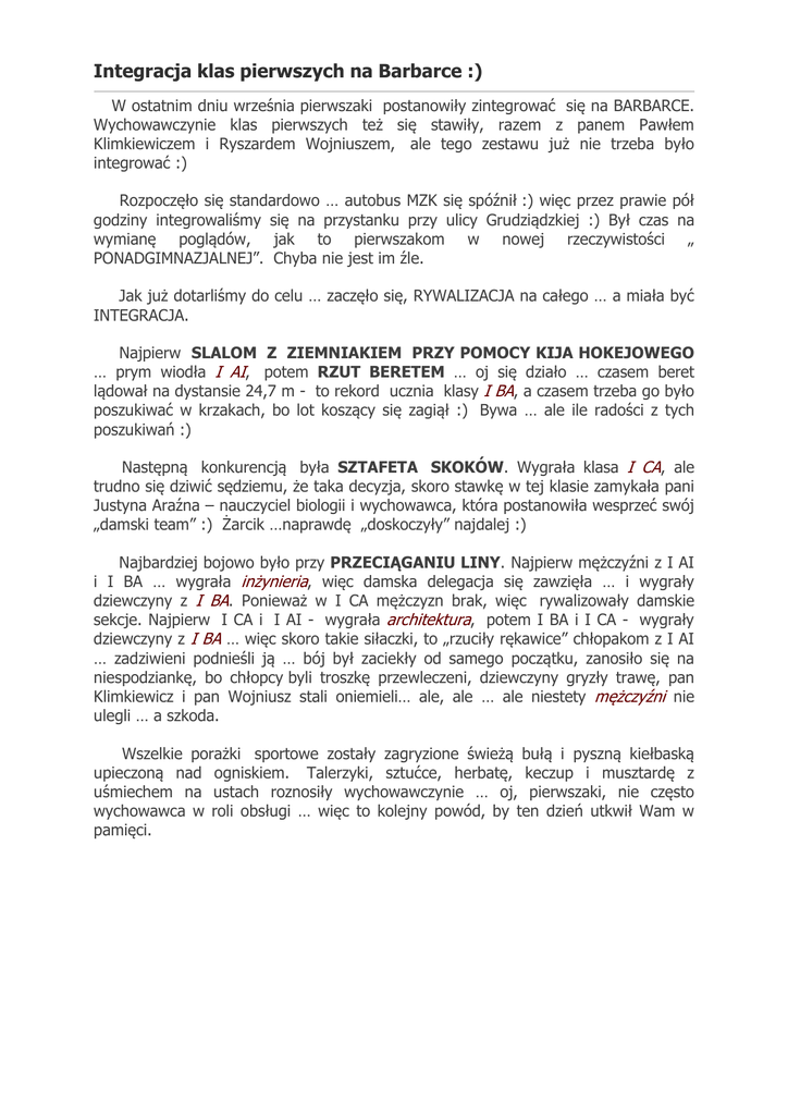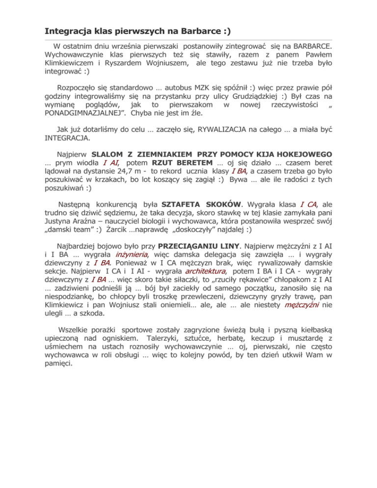 Integracja klas pierwszych na Barbarce :) W ostatnim dniu września pierwszaki postanowiły zintegrować się na BARBARCE. Wychowawczynie klas pierwszych też się stawiły, razem z panem Pawłem Klimkiewiczem i Ryszardem Wojniuszem, ale tego zestawu już nie trzeba było integrować :) Rozpoczęło się standardowo … autobus MZK się spóźnił :) więc przez prawie pół godziny integrowaliśmy się na przystanku przy ulicy Grudziądzkiej :) Był czas na wymianę poglądów, jak to pierwszakom w nowej rzeczywistości „ PONADGIMNAZJALNEJ”. Chyba nie jest im źle. Jak już dotarliśmy do celu … zaczęło się, RYWALIZACJA na całego … a miała być INTEGRACJA. Najpierw SLALOM Z ZIEMNIAKIEM PRZY POMOCY KIJA HOKEJOWEGO … prym wiodła I AI, potem RZUT BERETEM … oj się działo … czasem beret lądował na dystansie 24,7 m - to rekord ucznia klasy I BA, a czasem trzeba go było poszukiwać w krzakach, bo lot koszący się zagiął :) Bywa … ale ile radości z tych poszukiwań :) Następną konkurencją była SZTAFETA SKOKÓW. Wygrała klasa I CA, ale trudno się dziwić sędziemu, że taka decyzja, skoro stawkę w tej klasie zamykała pani Justyna Araźna – nauczyciel biologii i wychowawca, która postanowiła wesprzeć swój „damski team” :) Żarcik …naprawdę „doskoczyły” najdalej :) Najbardziej bojowo było przy PRZECIĄGANIU LINY. Najpierw mężczyźni z I AI i I BA … wygrała inżynieria, więc damska delegacja się zawzięła … i wygrały dziewczyny z I BA. Ponieważ w I CA mężczyzn brak, więc rywalizowały damskie sekcje. Najpierw I CA i I AI - wygrała architektura, potem I BA i I CA - wygrały dziewczyny z I BA … więc skoro takie siłaczki, to „rzuciły rękawice” chłopakom z I AI … zadziwieni podnieśli ją … bój był zaciekły od samego początku, zanosiło się na niespodziankę, bo chłopcy byli troszkę przewleczeni, dziewczyny gryzły trawę, pan Klimkiewicz i pan Wojniusz stali oniemieli… ale, ale … ale niestety mężczyźni nie ulegli … a szkoda. Wszelkie porażki sportowe zostały zagryzione świeżą bułą i pyszną kiełbaską upieczoną nad ogniskiem. Talerzyki, sztućce, herbatę, keczup i musztardę z uśmiechem na ustach roznosiły wychowawczynie … oj, pierwszaki, nie często wychowawca w roli obsługi … więc to kolejny powód, by ten dzień utkwił Wam w pamięci.