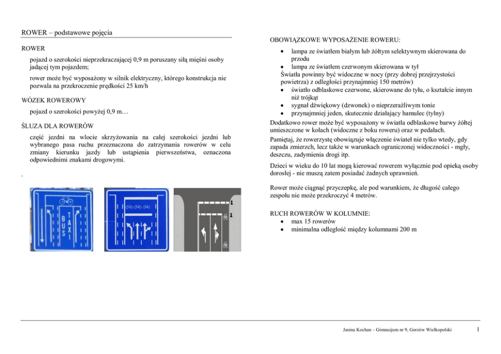 ROWER – podstawowe pojęcia ROWER pojazd o szerokości nieprzekraczającej 0,9 m poruszany siłą mięśni osoby jadącej tym pojazdem; rower może być wyposażony w silnik elektryczny, którego konstrukcja nie pozwala na przekroczenie prędkości 25 km/h WÓZEK ROWEROWY pojazd o szerokości powyżej 0,9 m… ŚLUZA DLA ROWERÓW część jezdni na wlocie skrzyżowania na całej szerokości jezdni lub wybranego pasa ruchu przeznaczona do zatrzymania rowerów w celu zmiany kierunku jazdy lub ustąpienia pierwszeństwa, oznaczona odpowiednimi znakami drogowymi. . OBOWIĄZKOWE WYPOSAŻENIE ROWERU: lampa ze światłem białym lub żółtym selektywnym skierowana do przodu lampa ze światłem czerwonym skierowana w tył Światła powinny być widoczne w nocy (przy dobrej przejrzystości powietrza) z odległości przynajmniej 150 metrów) światło odblaskowe czerwone, skierowane do tyłu, o kształcie innym niż trójkąt sygnał dźwiękowy (dzwonek) o nieprzeraźliwym tonie przynajmniej jeden, skutecznie działający hamulec (tylny) Dodatkowo rower może być wyposażony w światła odblaskowe barwy żółtej umieszczone w kołach (widoczne z boku roweru) oraz w pedałach. Pamiętaj, że rowerzystę obowiązuje włączenie świateł nie tylko wtedy, gdy zapada zmierzch, lecz także w warunkach ograniczonej widoczności - mgły, deszczu, zadymienia drogi itp. Dzieci w wieku do 10 lat mogą kierować rowerem wyłącznie pod opieką osoby dorosłej - nie muszą zatem posiadać żadnych uprawnień. Rower może ciągnąć przyczepkę, ale pod warunkiem, że długość całego zespołu nie może przekroczyć 4 metrów. RUCH ROWERÓW W KOLUMNIE: max 15 rowerów minimalna odległość między kolumnami 200 m Janina Kochan – Gimnazjum nr 9, Gorzów Wielkopolski 1