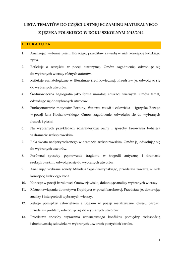 LISTA TEMATÓW DO CZĘŚCI USTNEJ EGZAMINU MATURALNEGO Z JĘZYKA POLSKIEGO W ROKU SZKOLNYM 2013/2014 LITERATURA 1. Analizując wybrane pieśni Horacego, przedstaw zawartą w nich koncepcję ludzkiego życia. 2. Refleksje o szczęściu w poezji starożytnej. Omów zagadnienie, odwołując się do wybranych wierszy różnych autorów. 3. Refleksje eschatologiczne w literaturze średniowiecznej. Przedstaw je, odwołując się do wybranych utworów. 4. Średniowieczna hagiografia jako forma moralnej edukacji wiernych. Omów temat, odwołując się do wybranych utworów. 5. Funkcjonowanie motywów Fortuny, theatrum mundi i człowieka – igrzyska Bożego w poezji Jana Kochanowskiego. Omów zagadnienie, odwołując się do wybranych fraszek i pieśni. 6. Na wybranych przykładach scharakteryzuj cechy i sposoby kreowania bohatera w dramacie szekspirowskim. 7. Rola świata nadprzyrodzonego w dramacie szekspirowskim. Omów ją, odwołując się do wybranych utworów. 8. Porównaj sposoby pojmowania tragizmu w tragedii antycznej i dramacie szekspirowskim, odwołując się do wybranych utworów. 9. Analizując wybrane sonety Mikołaja Sępa-Szarzyńskiego, przedstaw zawartą w nich koncepcję ludzkiego życia. 10. Koncept w poezji barokowej. Omów zjawisko, dokonując analizy wybranych wierszy. 11. Różne nawiązania do motywu Kupidyna w poezji barokowej. Przedstaw je, dokonując analizy i interpretacji wybranych wierszy. 12. Relacje pomiędzy człowiekiem a Bogiem w poezji metafizycznej okresu baroku. Przedstaw problem, odwołując się do wybranych utworów. 13. Przedstaw sposoby wyrażania wewnętrznego konfliktu pomiędzy cielesnością i duchowością człowieka w wybranych utworach poetyckich baroku. 1 14. Scharakteryzuj sposoby kreowania bohaterów, odwołując się do wybranych utworów dramatycznych Moliera. 15. Porównaj koncepcję świata i życia ludzkiego w wybranych pieśniach Jana Kochanowskiego i sonetach Mikołaja Sępa-Szarzyńskiego. 16. Poetyka satyry. Określ jej cechy, analizując wybrane utwory Ignacego Krasickiego i Adama Naruszewicza. 17. Poetyka poematu heroikomicznego. Określ jej cechy, analizując wybrane utwory Ignacego Krasickiego, należące do tego gatunku. 18. Moralistyka literatury oświeceniowej. Określ jej charakter, analizując wybrane utwory. 19. Odwołując się do wybranych sielanek renesansowych i oświeceniowych, przedstaw sposoby kreowania obrazu wsi i jej mieszkańców. 20. Na wybranych przykładach scharakteryzuj cechy i sposoby kreowania postaci kobiecych w powieści poetyckiej okresu romantyzmu. 21. Analizując wybrane dramaty romantyczne, przedstaw kształtowany w nich wzór bohatera. 22. Przedstaw istotę symbolicznego wykorzystania motywu nocy w literaturze romantycznej, odwołując się do wybranych utworów. 23. Dramat zniewolonego narodu wyrażony w polskiej literaturze romantycznej. Określ jego istotę i wymiar, analizując wybrane utwory. 24. Refleksje nad życiem ludzkim w poezji Cypriana Kamila Norwida. Przedstaw je, odwołując się do wybranych wierszy. 25. Cechy czarnego romantyzmu. Określ je na podstawie analizy wybranych utworów literackich. 26. Rozterki duchowe bohaterów szekspirowskich i romantycznych. Przedstaw je, odwołując się do wybranych dramatów. 27. Poczucie egzystencjalnej pustki i zagubienia w świecie. Scharakteryzuj ich przejawy, odwołując się do wybranych utworów literackich modernizmu. 28. Próby przezwyciężania poczucia bezsensu życia. Przedstaw zagadnienie, analizując wybrane wiersze Leopolda Staffa z okresu Młodej Polski. 29. Refleksje eschatologiczne w literaturze modernizmu. Przedstaw je, odwołując się do wybranych utworów. 2 30. Literackie portrety dekadenta. Przedstaw je, odwołując się do wybranych utworów okresu modernizmu. 31. Różne ujęcia tematu miłości w poezji młodopolskiej. Omów zagadnienie, odwołując się do wybranych wierszy. 32. Literackie portrety artystów. Przedstaw i porównaj je, odwołując się do wybranych utworów literatury doby romantyzmu, pozytywizmu i Młodej Polski. 33. Problemy panien na wydaniu. Scharakteryzuj je, analizując biografie wybranych bohaterek powieści XIX-wiecznej. 34. Kreacje kobiet w powieści XIX-wiecznej. Omów zagadnienie, odwołując się do wybranych utworów. 35. Literackie portrety kurtyzan. Przedstaw je, dokonując analizy wybranych powieści XIX-wiecznych. 36. Ukryta tożsamość bohaterów utworów literackich XIX wieku. Omów jej przyczyny i konsekwencje, odwołując się do wybranych przykładów. 37. Cechy naturalistycznego postrzegania świata. Określ je na podstawie analizy wybranych utworów literackich okresu pozytywizmu i modernizmu. 38. Rola przestrzeni w literaturze doby pozytywizmu i modernizmu. Omów temat, odwołując się do wybranych utworów. 39. Odwołując się do utworów wybranego poety, scharakteryzuj poezję katastrofistów lat 30. 40. Odwołując się do utworów wybranego poety, scharakteryzuj poezję Awangardy Krakowskiej. 41. Portret zbiorowy mieszczan w literaturze dwudziestolecia międzywojennego. Przedstaw go, odwołując się do wybranych utworów polskich pisarzy. 42. Awangardowe tendencje w literaturze dwudziestolecia międzywojennego. Omów je, odwołując się do wybranych utworów. 43. Praca jako kryterium oceny człowieka. Przedstaw zagadnienie, odwołując się do wybranych powieści okresu pozytywizmu i dwudziestolecia międzywojennego. 44. Artystyczne funkcje świata widzianego oczyma dziecka. Omów problem, analizując wybrane utwory współczesne. 3 45. Odwołując się do wybranych przykładów ze współczesnej beletrystyki i literatury faktu, przedstaw obrazy rewolucji oraz jej konsekwencje. 46. Doświadczenia ludzi żyjących w ustroju komunistycznym. Omów zagadnienie, odwołując się do wybranych przykładów ze współczesnej beletrystyki i literatury faktu. 47. Poezja jako narzędzie walki z systemem totalitarnym. Omów zjawisko, odwołując się do wybranych utworów powstałych