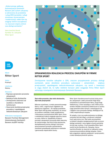 „Wykorzystując aplikację Automatyzacja Zamówień Basware jako system zakupowy w odniesieniu do produktów i usług MRO (produkty i usługi serwisowe, konserwacyjne i modernizacji), udało nam się osiągnąć istotne oszczędności i w znacznym stopniu skrócić czas obsługi zamówień.” Hans-Joachim Brand Dyrektor ds. Zakupów Ritter Sport Klient Ritter Sport Sektor Przemysł Lokalizacja Niemcy Wyzwania Poprawa sprawności procesów SPRAWNIEJSZA REALIZACJA PROCESU ZAKUPÓW W FIRMIE RITTER SPORT Zmniejszenie kosztów zakupów o 10%, znaczne przyspieszenie procesu obsługi zamówień, jasno określone procedury autoryzacji i zatwierdzeń, większa przejrzystość, zapobieganie niekontrolowanym zakupom, czy zwrot z inwestycji w ciągu dwóch lat, to tylko niektóre korzyści jakie osiągnęła firma Ritter Sport wdrażając rozwiązanie Automatyzacja Zamówień Basware. zakupowych Redukcja liczby dostawców Zmniejszenie zależności od zasobów o charakterze technicznym Stworzenie bardziej przejrzystej procedury i zapobieganie niekontrolowanym zakupom Wdrożone rozwiązanie Basware Purchase Management (Automatyzacja Zamówień) Basware anyERP interfejs Zbyt wiele procesów, zbyt wielu dostawców, zbyt mała przejrzystość Mleczno-orzechowa, o smaku pomarańczowego likieru, trufli, z organicznymi migdałami lub dietetyczna nugatowa – 43 rodzaje produktów Ritter Sport oferują wiele możliwości, by cieszyć się smakiem czekolady. Dzięki wyjątkowemu i kolorowemu asortymentowi Ritter Sport, firma o wieloletniej tradycji osiągnęła ogromny sukces na rynku. Mimo to, niejednolita struktura procedur zakupowych przynosiła efekt odwrotny do zamierzonego: zbyt duża liczba dostawców, skomplikowane procesy obsługi i brak jasno sprecyzowanych procedur potwierdzania zamówień powodowały opóźnienia w obsłudze i generowały niepotrzebne koszty. Ritter Sport charakteryzował się dużą liczbą procedur zakupowych. Jeden pracownik mógł złożyć zamówienie za pośrednictwem faksu, drugi drogą telefoniczną, a trzeci wysyłając e-mail. Wielu pracowników składało zamówienia telefonicznie w wyniku czego powstało wiele różnych i zmieniających się z biegiem czasu procesów obsługi, składających się z kilku niepotrzebnych etapów. W związku z tym czas wykorzystywany na obsługę zamówień był zbyt długi, a producent czekolady tracił swój cenny czas. Zbyt wielu pracowników w działach zakupów zaangażowanych było w proces obsługi zamówień. Jasny wgląd w koszty pośrednie nie był więc możliwy. Z tych powodów Ritter Sport zwrócił się do Dyrektora ds. Zakupów, HansaJoachima Branda, by stworzył on całkowicie nową, nowoczesną procedurę obsługi zakupów. Celem było osiągnięcie większej wydajności i przejrzystości, a także łatwiejszej kontroli systemu. KORZYŚCI Zmniejszenie kosztów zakupów o 10% Znaczne przyspieszenie procesu obsługi zamówień Obniżenie ilości nabywanych produktów MRO o 10% Liczba dostawców zredukowana o 40% Zwrot z inwestycji w ciągu dwóch lat Jasno określone procedury autoryzacji i zatwierdzeń Większa przejrzystość: zapobieganie niekontrolowanemu podejściu do dokonywania zakupów Możliwość składania zamówień z katalogu i z wolnej ręki Bardzo wysoki stopień akceptacji ze strony Działu Technicznego i ds. Zakupów Szybki proces wdrożenia, brak konieczności długotrwałych szkoleń Planowane rozszerzenie do systemu obejmującego proces od złożenia zamówienia do dokonania płatności (Purchase-to-Pay/ od Zamówienia do Płatności) RR Donnelley dostarcza systemy i usługi w zakresie zarządzania fakturami, zamówieniami i dokumentami biorącymi udział w procesach biznesowych. Pomagamy efektywnie zarządzać firmą świadcząc usługi wdrażania dokumentów elektronicznych oraz oprogramowania dla biznesu, włączając w to digitalizację, archiwizację oraz systemy obiegu dokumentów. RR Donnelley Polska należy do założonej ponad 148 lat temu grupy RR Donnelley, która zatrudnia ponad 58 000 pracowników w ponad 600 biurach na całym świecie. Uproszczenie procedury zakupowej Ritter Sport radykalnie (do jednej!) zmniejszył liczbę procedur zakupowych. Wszystkie działy, które kupują produkty i usługi MRO (produkty i usługi serwisowe, konserwacyjne i modernizacji), korzystają z tej samej procedury i tych samych standardów. Kilkoma kliknięciami myszki pracownicy z różnych działów mogą obecnie złożyć zamówienie bezpośrednio za pomocą katalogu dostawcy. Jeśli wymagane jest zatwierdzenie zakupu, osoba zatwierdzająca zostaje powiadomiona drogą e-mailową, dzięki temu stale możliwe jest sprawdzenie zapotrzebowania, nie powodując tym samym opóźnienia w obsłudze zamówienia. Możliwe jest także składanie zamówień w dowolnej formie tekstowej (z wolnej ręki); w razie konieczności działy mają też swobodę przesyłania dodatkowych żądań, które przekierowane zostają do Działu Zakupów w celu uzupełnienia zamówienia. Tę nową procedurę stworzono wdrażając rozwiązanie Automatyzacja Zamówień firmy Basware. Eksperci Ritter Sport dokonali przeglądu sześciu rozwiązań. O wyborze Basware zdecydowały dwa kluczowe czynniki. Po pierwsze, rozwiązanie wyróżniało się jako posiadające najlepszy stosunek kosztów do korzyści. Poza tym, duże wrażenie na Ritter Sport wywarło całościowe podejście firmy do koncepcji Purchase-to-Pay (od Zamówienia do Płatności). Oprócz rozwiązań dotyczących zakupów, Basware oferuje również automatyzację procesu przetwarzania faktur. System Basware umożliwia firmom stworzenie zintegrowanego procesu – od momentu złożenia zapotrzebowania, aż do uregulowania płatności przychodzących faktur. Następnym logicznym krokiem dla Ritter Sport jest zoptymalizowanie całego tego procesu. Firma Ritter Sport zintegrowała rozwiązania Automatyzacja Zamówień ze swoimi systemami SAP MM i SAP FI. Współdziałanie tych syst