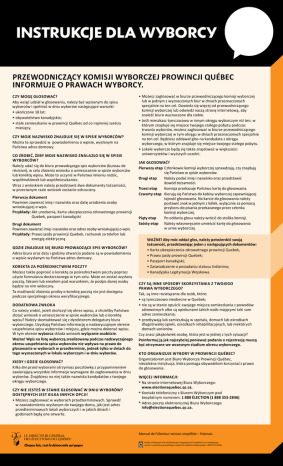 INSTRUKCJE DLA WYBORCY Przewodniczący Komisji Wyborczej prowincji Québec informuje o prawach Wyborcy. Czy mogĘ głosować? Aby wziąć udział w głosowaniu, należy być wpisanym do spisu wyborców i spełniać w dniu wyborów następujące warunki: • ukończone 18 lat; • obywatelstwo kanadyjskie; • stałe zamieszkanie w prowincji Québec od co najmniej sześciu miesięcy. Czy moje nazwisko znajduje się w spisie wyborców? Można to sprawdzić w powiadomieniu o wpisie, wysłanym na Państwa adres domowy. Co zrobić, żeby moje nazwisko znalazło się w spisie wyborców? Należy udać się do biura prowadzącego spis wyborców (bureau de révision), w celu złożenia wniosku o umieszczenie w spisie wyborców lub korektę wpisu. Może to uczynić w Państwa imieniu rodzic, współmałżonek lub współmieszkaniec. Wraz z wnioskiem należy przedstawić dwa dokumenty tożsamości, w przeciwnym razie wniosek zostanie odrzucony. Pierwszy dokument Powinien zawierać imię i nazwisko oraz datę urodzenia osoby wnioskującej o wpis. Przykłady: A kt urodzenia, Karta ubezpieczenia zdrowotnego prowincji Quebek, paszport kanadyjski Drugi dokument Powinien zawierać imię i nazwisko oraz adres osoby wnioskującej o wpis. Przykłady: P rawo jazdy prowincji Quebek, rachunek za telefon lub energię elektryczną Gdzie znajduje się biuro prowadzące spis wyborców? Adres biura oraz daty i godziny otwarcia podane są w powiadomieniu o wpisie wysłanym na Państwa adres domowy. KOREKTA ZA POŚREDNICTWEM POCZTY Możesz także poprosić o korektę za pośrednictwem poczty poprzez użycie formularza dostarczonego w tym celu. Może on zostać wysłany pocztą, faksem lub emailem pod warunkiem, że podpis danej osoby będzie na nim widoczny. Ta możliwość złożenia prośby o korektę pocztą nie jest dostępna podczas specjalnego okresu weryfikacyjnego. DODATKOWA ZWŁOKA Co należy zrobić, jeżeli skończył się okres wpisu, a chcieliby Państwo złożyć wniosek o umieszczenie w spisie wyborców lub o korektę wpisu? Należy skontaktować się z dyrektorem delegatury biura wyborczego. Uzyskają Państwo informację o nadzwyczajnym okresie uzupełniania spisu wyborców i miejscu, gdzie można dokonać wpisu. W tym okresie wyborca składa wniosek wyłącznie osobiście. Ważne! Wpis na listę wyborczą zrealizowany podczas nadzwyczajnego okresu uzupełniania spisu wyborców nie wpływa na prawo do głosowania w wyborach w przedterminie, jednak tylko w dniach do tego wyznaczonych w lokalu wyborczym i w dniu wyborów. KIEDY I GDZIE GŁOSOWAĆ? Kilka dni przed wyborami otrzymasz pocztówkę z przypomnieniem zawierającą wszystkie informacje wymagane do zagłosowania w dniu wyborów. Znajdziesz na niej także nazwiska kandydatów z twojego okręgu wyborczego. CZY NIE JESTEŚ W STANIE GŁOSOWAĆ W DNIU WYBORÓW? DOSTĘPNYCH JEST KILKA INNYCH OPCJI! • Możesz zagłosować w wyborach przedterminowych. Sprawdź w zawiadomieniu wysłanym do twojego domu, jaki jest adres przedterminowych lokali wyborczych i w jakich dniach i godzinach będą one otwarte. •M ożesz zagłosować w biurze przewodniczącego komisji wyborczej lub w jednym z wyznaczonych biur w dniach przeznaczonych specjalnie na ten cel. Dowiedz się więcej od przewodniczącego komisji wyborczej lub odwiedź naszą stronę internetową, aby znaleźć biuro wyznaczone dla ciebie. • J eśli mieszkasz tymczasowo w innym okręgu wyborczym niż ten, w którym znajduje się miejsce twojego stałego pobytu podczas trwania wyborów, możesz zagłosować w biurze przewodniczącego komisji wyborczej w tym okręgu w dniach przeznaczonych specjalnie na ten cel. Będziesz oddawał głos na kandydata z okręgu wyborczego, w którym znajduje się miejsce twojego stałego pobytu. • L okale wyborcze będą się także znajdować w większości uniwersytetów i wyższych uczelni. Jak głosować? Pierwszy etapCzłonkowie komisji wyborczej sprawdzają, czy znajdują się Państwo w spisie wyborców. Drugi etap Należy podać imię i nazwisko oraz przedstawić dowód tożsamości. Trzeci etap Komisja przekazuje Państwu kartę do głosowania. Czwarty etap Kierują się Państwo do kabiny wyborczej zapewniającej tajność głosowania. Na karcie do głosowania należy postawić znak w jednym z kółek, wyłącznie za pomocą przyboru do pisania przekazanego przez członka komisji wyborczej. Piąty etap Po oddaniu głosu należy wrócić do stolika komisji. Szósty etap Należy własnoręcznie umieścić kartę do głosowania w urnie wyborczej. Ważne! Aby móc oddać głos, należy potwierdzić swoją tożsamość, przedstawiając jeden z następujących dokumentów: • Karta ubezpieczenia zdrowotnego prowincji Quebek, • Prawo jazdy prowincji Quebek; • Paszport kanadyjski; • Zaświadczenie o posiadaniu statusu Indianina; • Kanadyjska Legitymacja Wojskowa. CZY SĄ INNE SPOSOBY SKORZYSTANIA Z TWOJEGO PRAWA WYBORCZEGO? Tak, są inne rozwiązania dla osób, które: • są tymczasowo nieobecne w Quebek; • nie są w stanie opuścić swojego miejsca zamieszkania z powodów zdrowotnych albo są opiekunami takich osób mającymi taki sam adres zamieszkania; • przebywają lub zamieszkują w szpitalu, domach lub ośrodkach długotrwałej opieki, ośrodkach rehabilitacyjnych, lub niektórych domach seniorów. Czy znasz jakąkolwiek osobę, która jest w jednej z tych sytuacji? Poinformuj ją jak najszybciej ponieważ podania o rejestrację muszą być otrzymane we wczesnym stadium okresu wyborczego. Kto organizuje wybory w prowincji Québec? Organizatorem jest Biuro Wyborcze Prowincji Québec, niezależna instytucja, która pomaga obywatelom korzystać z prawa do głosowania. Więcej informacji: •N a stronie internetowej Biura Wyborczego: www.electionsquebec.qc.ca. •K ontakt telefoniczny z Biurem Wyborczym pod bezpłatnym numerem: 1 888 ÉLECTION (1 888 353-2846) •A dres poczty elektronicznej Biura Wyborczego: [email protected]. Manuel de l’élec