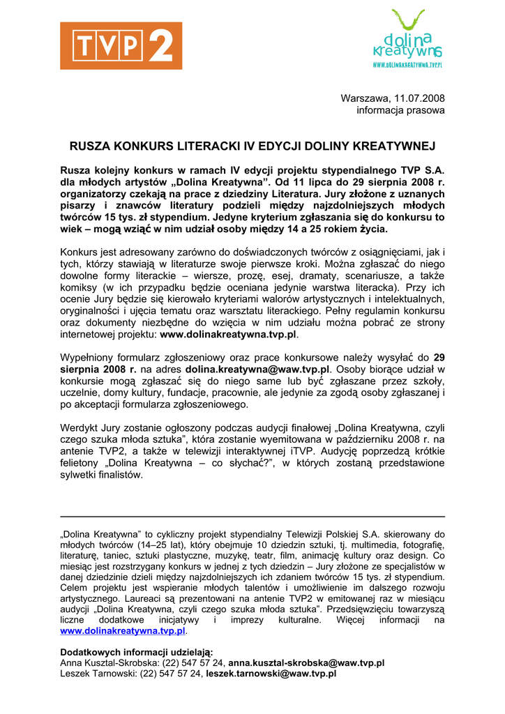 Warszawa, 11.07.2008 informacja prasowa RUSZA KONKURS LITERACKI IV EDYCJI DOLINY KREATYWNEJ Rusza kolejny konkurs w ramach IV edycji projektu stypendialnego TVP S.A. dla młodych artystów „Dolina Kreatywna”. Od 11 lipca do 29 sierpnia 2008 r. organizatorzy czekają na prace z dziedziny Literatura. Jury złożone z uznanych pisarzy i znawców literatury podzieli między najzdolniejszych młodych twórców 15 tys. zł stypendium. Jedyne kryterium zgłaszania się do konkursu to wiek – mogą wziąć w nim udział osoby między 14 a 25 rokiem życia. Konkurs jest adresowany zarówno do doświadczonych twórców z osiągnięciami, jak i tych, którzy stawiają w literaturze swoje pierwsze kroki. Można zgłaszać do niego dowolne formy literackie – wiersze, prozę, esej, dramaty, scenariusze, a także komiksy (w ich przypadku będzie oceniana jedynie warstwa literacka). Przy ich ocenie Jury będzie się kierowało kryteriami walorów artystycznych i intelektualnych, oryginalności i ujęcia tematu oraz warsztatu literackiego. Pełny regulamin konkursu oraz dokumenty niezbędne do wzięcia w nim udziału można pobrać ze strony internetowej projektu: www.dolinakreatywna.tvp.pl. Wypełniony formularz zgłoszeniowy oraz prace konkursowe należy wysyłać do 29 sierpnia 2008 r. na adres [email protected]. Osoby biorące udział w konkursie mogą zgłaszać się do niego same lub być zgłaszane przez szkoły, uczelnie, domy kultury, fundacje, pracownie, ale jedynie za zgodą osoby zgłaszanej i po akceptacji formularza zgłoszeniowego. Werdykt Jury zostanie ogłoszony podczas audycji finałowej „Dolina Kreatywna, czyli czego szuka młoda sztuka”, która zostanie wyemitowana w październiku 2008 r. na antenie TVP2, a także w telewizji interaktywnej iTVP. Audycję poprzedzą krótkie felietony „Dolina Kreatywna – co słychać?”, w których zostaną przedstawione sylwetki finalistów. „Dolina Kreatywna” to cykliczny projekt stypendialny Telewizji Polskiej S.A. skierowany do młodych twórców (14–25 lat), który obejmuje 10 dziedzin sztuki, tj. multimedia, fotografię, literaturę, taniec, sztuki plastyczne, muzykę, teatr, film, animację kultury oraz design. Co miesiąc jest rozstrzygany konkurs w jednej z tych dziedzin – Jury złożone ze specjalistów w danej dziedzinie dzieli między najzdolniejszych ich zdaniem twórców 15 tys. zł stypendium. Celem projektu jest wspieranie młodych talentów i umożliwienie im dalszego rozwoju artystycznego. Laureaci są prezentowani na antenie TVP2 w emitowanej raz w miesiącu audycji „Dolina Kreatywna, czyli czego szuka młoda sztuka”. Przedsięwzięciu towarzyszą liczne dodatkowe inicjatywy i imprezy kulturalne. Więcej informacji na www.dolinakreatywna.tvp.pl. Dodatkowych informacji udzielają: Anna Kusztal-Skrobska: (22) 547 57 24, [email protected] Leszek Tarnowski: (22) 547 57 24, [email protected]