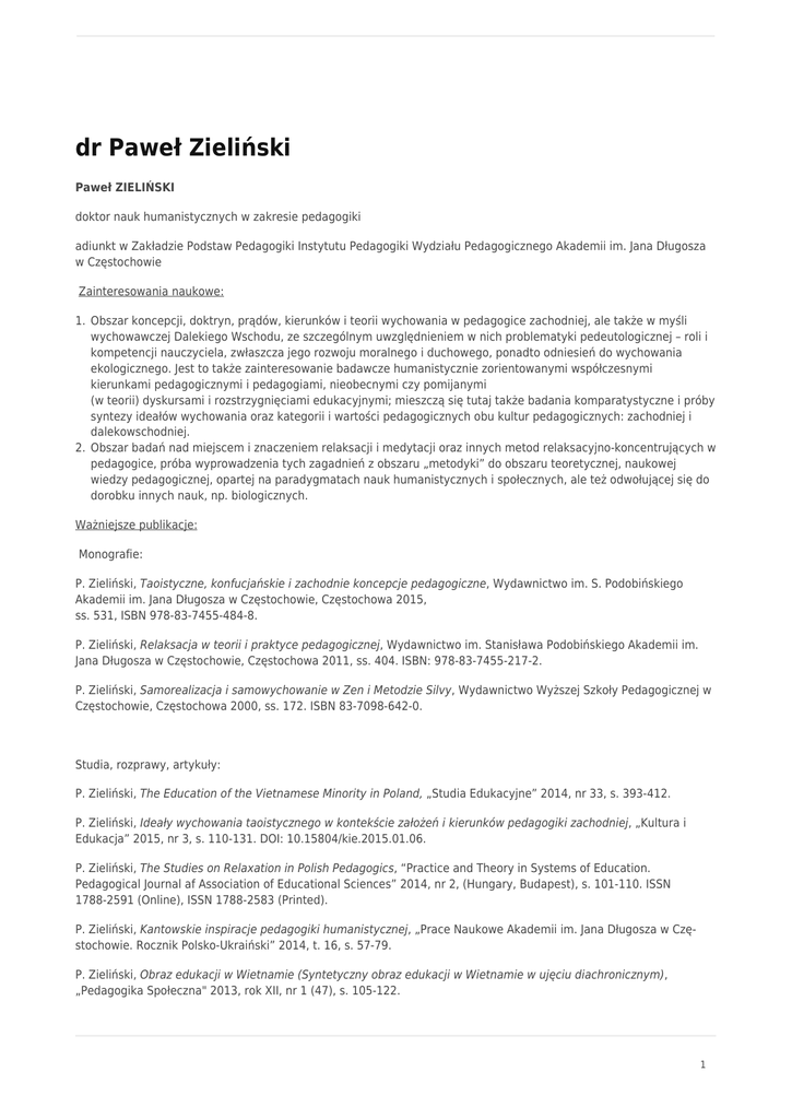 dr Paweł Zieliński Paweł ZIELIŃSKI doktor nauk humanistycznych w zakresie pedagogiki adiunkt w Zakładzie Podstaw Pedagogiki Instytutu Pedagogiki Wydziału Pedagogicznego Akademii im. Jana Długosza w Częstochowie Zainteresowania naukowe: 1. Obszar koncepcji, doktryn, prądów, kierunków i teorii wychowania w pedagogice zachodniej, ale także w myśli wychowawczej Dalekiego Wschodu, ze szczególnym uwzględnieniem w nich problematyki pedeutologicznej – roli i kompetencji nauczyciela, zwłaszcza jego rozwoju moralnego i duchowego, ponadto odniesień do wychowania ekologicznego. Jest to także zainteresowanie badawcze humanistycznie zorientowanymi współczesnymi kierunkami pedagogicznymi i pedagogiami, nieobecnymi czy pomijanymi (w teorii) dyskursami i rozstrzygnięciami edukacyjnymi; mieszczą się tutaj także badania komparatystyczne i próby syntezy ideałów wychowania oraz kategorii i wartości pedagogicznych obu kultur pedagogicznych: zachodniej i dalekowschodniej. 2. Obszar badań nad miejscem i znaczeniem relaksacji i medytacji oraz innych metod relaksacyjno-koncentrujących w pedagogice, próba wyprowadzenia tych zagadnień z obszaru „metodyki” do obszaru teoretycznej, naukowej wiedzy pedagogicznej, opartej na paradygmatach nauk humanistycznych i społecznych, ale też odwołującej się do dorobku innych nauk, np. biologicznych. Ważniejsze publikacje: Monografie: P. Zieliński, Taoistyczne, konfucjańskie i zachodnie koncepcje pedagogiczne, Wydawnictwo im. S. Podobińskiego Akademii im. Jana Długosza w Częstochowie, Częstochowa 2015, ss. 531, ISBN 978-83-7455-484-8. P. Zieliński, Relaksacja w teorii i praktyce pedagogicznej, Wydawnictwo im. Stanisława Podobińskiego Akademii im. Jana Długosza w Częstochowie, Częstochowa 2011, ss. 404. ISBN: 978-83-7455-217-2. P. Zieliński, Samorealizacja i samowychowanie w Zen i Metodzie Silvy, Wydawnictwo Wyższej Szkoły Pedagogicznej w Częstochowie, Częstochowa 2000, ss. 172. ISBN 83-7098-642-0. Studia, rozprawy, artykuły: P. Zieliński, The Education of the Vietnamese Minority in Poland, „Studia Edukacyjne” 2014, nr 33, s. 393-412. P. Zieliński, Ideały wychowania taoistycznego w kontekście założeń i kierunków pedagogiki zachodniej, „Kultura i Edukacja” 2015, nr 3, s. 110-131. DOI: 10.15804/kie.2015.01.06. P. Zieliński, The Studies on Relaxation in Polish Pedagogics, “Practice and Theory in Systems of Education. Pedagogical Journal af Association of Educational Sciences” 2014, nr 2, (Hungary, Budapest), s. 101-110. ISSN 1788-2591 (Online), ISSN 1788-2583 (Printed). P. Zieliński, Kantowskie inspiracje pedagogiki humanistycznej, „Prace Naukowe Akademii im. Jana Długosza w Częstochowie. Rocznik Polsko-Ukraiński” 2014, t. 16, s. 57-79. P. Zieliński, Obraz edukacji w Wietnamie (Syntetyczny obraz edukacji w Wietnamie w ujęciu diachronicznym), „Pedagogika Społeczna" 2013, rok XII, nr 1 (47), s. 105-122. 1 P. Zieliński, Współczesny charakter myśli pedagogicznej Mencjusza, drugiego wielkiego konfucjanisty, „Studia z Teorii Wychowania" 2014, t. V, nr 2(9), s. 99-124. P. Zieliński, Miejsce sofrologii we współczesnej edukacji, „Studia z Teorii Wychowania" 2013, t. IV, nr 1(6), s. 149-168. P. Zieliński, Wychowanie i systemy edukacyjne w kulturach Dalekiego Wschodu, w: Encyklopedia pedagogiczna XXI wieku, t. VII: V-Ż, pod red. T. Pilcha, Wydawnictwo Akademickie „Żak”, Warszawa 2008, s. 374-392. P. Zieliński, Zespół GAMMA – Raport, w: Encyklopedia pedagogiczna XXI wieku, t. VII: V-Ż, pod red. T. Pilcha, Wydawnictwo Akademickie „Żak”, Warszawa 2008, s. 891-899. P. Zieliński, Główne idee i przedstawiciele tradycyjnego mahajanistycznego i neokonfucjańskiego wychowania w Korei, „Prace Naukowe Akademii im. Jana Długosza w Częstochowie. Pedagogika” 2014, t. 23, s. 103-118. P. Zieliński, Ideały wychowania i wartości pedagogiczne w poglądach i działalności neokonfucjanistów japońskich, „Prace Naukowe Akademii im. Jana Długosza w Częstochowie. Pedagogika” 2015, t. 24, s. 61-76. P. Zieliński, Rola nauczyciela w świetle założeń edukacji postmodernistycznej, „Prace Naukowe Akademii im. Jana Długosza w Częstochowie. Pedagogika” 2012, t. 21, s. 57-77. P. Zieliński, Główne dylematy i problemy edukacji globalnej, „Prace Naukowe Akademii im. Jana Długosza w Częstochowie. Pedagogika” 2011, t. 20, s. 53-64. P. Zieliński P., Związki psychologii i pedagogiki humanistycznej z dalekowschodnimi ideałami wychowania, w: Podstawy edukacji. Epistemologia a praktyka edukacyjna, pod red. A. Gofrona, M. Piaseckiej, Wydawnictwo im. Stanisława Podobińskiego Akademii im. Jana Długosza w Częstochowie, Częstochowa 2008, s. 133-146. Prowadzone przedmioty: - innowacje i współczesne kierunki pedagogiczne - andragogika - seminarium magisterskie - seminarium licencjackie Kontakt mailowy: [email protected] Problematyka seminariów magisterskich i licencjackich: 1. Metody terapii pedagogicznej w pracy z dziećmi i młodzieżą: relaksacja, wizualizacja, afirmacja; muzykoterapia, drama, rysunek, formy teatralne i inne formy arteterapii; inne metody, np. hipnoterapia. Wykorzystanie relaksacji i innych metod w kształceniu ustawicznym, edukacji pozaformalnej i nieformalnej. 2. Stres szkolny i pracowniczy, w relacjach: wychowawca-wychowanek, uczeń-nauczyciel, rodzic-dziecko, pracodawca-pracownik, itd.; przyczyny, przebieg, profilaktyka i terapia. 3. Nauczyciel i pedagog w sytuacjach trudnych, przemoc i agresja w wychowaniu (objawy u dzieci, fizyczne, psychiczne i społeczne, terapia, zjawisko mobbingu, indoktrynacja, wypalenie zawodowe itp.). 4. Samorozwój i samowychowanie ucznia i nauczyciela, rozwój osobowości. 5. Problemy adaptacyjne dzieci w przedszkolu i szkole oraz innych placówkach opiekuńczo-wychowawczych (żłobkach, klubach dziecięcych, domach dziecka, świetlicach), a także 2 w rodzinach zastępczych i adopcyjnych. 6. Rola i wykorzystanie zabawy