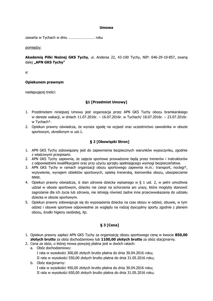 Umowa zawarta w Tychach w dniu ……………………… roku pomiędzy: Akademią Piłki Nożnej GKS Tychy, ul. Andersa 22, 43-100 Tychy, NIP: 646-29-10-857, zwaną dalej „APN GKS Tychy” a: Opiekunem prawnym następującej treści: §1 [Przedmiot Umowy] 1. Przedmiotem niniejszej Umowy jest organizacja przez APN GKS Tychy obozu bramkarskiego w okresie wakacji, w dniach 11.07.2016r. – 16.07.2016r. w Tychach/ 18.07.2016r. – 23.07.2016r. w Tychach*. 2. Opiekun prawny oświadcza, że wyraża zgodę na wyjazd oraz uczestnictwo zawodnika w obozie sportowym, określonym w ust.1. § 2 [Obowiązki Stron] 1. APN GKS Tychy zobowiązany jest do zapewnienia bezpiecznych warunków wypoczynku, zgodnie z właściwymi przepisami. 2. APN GKS Tychy zapewnia, że zajęcia sportowe prowadzone będą przez trenerów i instruktorów z odpowiednimi kwalifikacjami oraz przy użyciu sprzętu spełniającego wymogi bezpieczeństwa. 3. APN GKS Tychy w ramach organizacji obozu sportowego zapewnia m.in.: transport, noclegi*, wyżywienie, wynajem obiektów sportowych, opiekę trenerską, kierownika obozu, ubezpieczenie NNW. 4. Opiekun prawny oświadcza, iż stan zdrowia dziecka wpisanego w § 1 ust. 2, w pełni umożliwia udział w obozie sportowym, dziecko nie cierpi na schorzenia ani urazy, które mogłyby stanowić zagrożenie dla ich życia lub zdrowia, nie istnieją również żadne inne przeciwwskazania do udziału dziecka w obozie sportowym. 5. Opiekun prawny zobowiązuje się do wyposażenia dziecka na czas obozu w odzież, obuwie, w tym odzież i obuwie sportowe odpowiednie ze względu na rodzaj dyscypliny sportu zgodnie z planem obozu, środki higieny osobistej, itp. § 3 [Cena] 1. Opiekun prawny zapłaci APN GKS Tychy za organizację obozu sportowego cenę w kwocie 850,00 złotych brutto za obóz dochodzeniowy lub 1100,00 złotych brutto za obóz stacjonarny. 2. Cena za obóz, o której mowa powyżej płatna jest w dwóch ratach: a. Obóz dochodzeniowy: I rata w wysokości 300,00 złotych brutto płatna do dnia 30.04.2016 roku; II rata w wysokości 550,00 złotych brutto płatna do dnia 31.05.2016 roku; b. Obóz stacjonarny: I rata w wysokości 450,00 złotych brutto płatna do dnia 30.04.2016 roku; II rata w wysokości 650,00 złotych brutto płatna do dnia 31.05.2016 roku; 3. Opiekun prawny zobowiązuje się uiścić raty za obóz sportowy na podany poniżej rachunek bankowy. W tytule przelewu należy podać dane dziecka tj. Imię i nazwisko zawodnika, nazwa grupy, obóz bramkarski dochodzeniowy/stacjonarny. Akademia Piłki Nożnej GKS Tychy, ul. Andersa 22, 43-100 Tychy Nr rachunku bankowego: 56 1050 1399 1000 0024 1075 4044 4. Za dzień dokonania płatności przyjmuje się dzień wpływu należności na rachunek bankowy APN GKS Tychy. § 4 [Odpowiedzialność] 1. Opiekun prawny ponosi odpowiedzialność materialną wobec APN GKS Tychy za szkody wyrządzone z winy osób niepełnoletnich zgłoszonych przez niego i biorących udział w obozie sportowym – zobowiązując się do ich naprawienia bądź pokrycia w całości. 2. APN GKS Tychy nie ponosi odpowiedzialności za utratę przez uczestnika rzeczy osobistych w szczególności za telefony komórkowe, aparaty fotograficzne i pozostały wartościowy sprzęt i ich eksploatację przez innych uczestników obozu sportowego. 3. APN GKS Tychy nie odpowiada za niedogodności zaistniałe w trakcie trwania obozu, które powstały wskutek działania przyczyn od niego niezależnych, tj. warunki atmosferyczne, decyzje państwowe, strajki oraz inne siły wyższe a także wyłącza odpowiedzialność odszkodowawczą z tytułu nieszczęśliwych wypadków czy utraty zdrowia w zakresie przekraczającym kwoty gwarantowane polisą ubezpieczyciela. § 5 [Obowiązywanie Umowy] 1. Umowa zostaje zawarta na czas wykonywania określonych w niej świadczeń. 2. Umowa może być rozwiązana za porozumieniem Stron. 3. W przypadku rezygnacji Opiekuna prawnego z pobytu dziecka w obozie sportowym APN GKS Tychy przysługuje prawo do zatrzymania wpłaconych przez Opiekuna Prawnego kwot wskazanych w § 3, z zastrzeżeniem ust. 4 poniżej. Opiekun prawny oświadcza, że w pełni akceptuje to uzgodnienie. 4. W przypadku rezygnacji Opiekuna prawnego z pobytu dziecka na obozie sportowym z przyczyn zależnych od Opiekuna prawnego, ale należycie uzasadnionych i udokumentowanych (w przypadku choroby konieczne jest udokumentowanie zdarzenia zaświadczeniem lekarskim), uiszczona przez Opiekuna Prawnego cena za obóz podlega zwrotowi w części, w jakiej nie została uprzednio przez APN GKS Tychy wydatkowana na koszty rezerwacji noclegów dla dziecka, koszty ubezpieczenia dziecka, koszty wynagrodzeń, rezerwacji transportu, chyba, że rezygnacja złożona skutecznie zostanie na 60 dni przed obozem, wówczas należny jest zwrot całej wpłaconej kwoty. Opiekun prawny oświadcza, że w pełni akceptuje to uzgodnienie. 5. Rezygnacja, o której mowa w ust. 3 i 4 powyżej powinna być złożona przez Opiekuna prawnego na piśmie i doręczona APN GKS Tychy. 6. APN GKS Tychy zastrzega sobie prawo do rozwiązania umowy w trybie natychmiastowym w trakcie jej realizacji i usunięcie dziecka z obozu na koszt Opiekuna Prawnego, jeżeli dziecko nie przestrzega regulaminów obiektów i ośrodka z którego korzysta, utrudnia sprawne jego przeprowadzenie, działa ze szkodą dla innych uczestników lub stwarza zagrożenie dla życia i zdrowia własnego lub innych osób. Nie stosuje sie do poleceń opiekunów, nie bierze udziału w zajęciach. Wszelkie koszty, logistyczne, techniczne (naprawy) w takiej sytuacji ponosi Opiekun prawny. Opiekunowi prawemu nie przysługuje w takim wypadku zwrot ceny za obóz. § 6 [ Postanowienia końcowe] 1. W sprawach nieuregulowanych niniejszą Umową obowiązują przepisy Kodeksu Cywilnego. 2. Umowa została sporządzona w dwóch jednobrzmiących egzemplarzach, po jednym dla każdej ze Stron. 3. Opiekun prawny wyraża zgodę na wykorzystywanie przez APN GKS Tychy danych