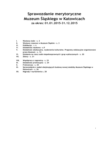 Sprawozdanie merytoryczne Muzeum Śląskiego w Katowicach za okres: 01.01.2015–31.12.2015 I. II. III. IV. V. VI. VII. VIII. IX. X. XI. XII. Wystawy stałe – s. 2 Wystawy czasowe w Muzeum Śląskim – s. 3 Publikacje – s. 6 Działalność naukowa – s.9 Działalność edukacyjna, wydarzenia kulturalne. Programy edukacyjne organizowane przez Muzeum – s. 14 Działania na rzecz osób niepełnosprawnych i grup wykluczonych – s. 20 Zbiory – s. 21 Współpraca z zagranicą – s. 23 Działalność promocyjna – s. 24 Frekwencja – s. 25 Sprawozdanie z zadań obejmujących budowę nowej siedziby Muzeum Śląskiego w Katowicach – s. 26 Nagrody i wyróżnienia s. 28 1 I. Wystawy stałe Inauguracja pięciu wystaw stałych w siedzibie przy ul. T. Dobrowolskiego 1 - 26.06.2015 Inauguracja Galerii śląskiej sztuki sakralnej - 20.12.2015. 1. Galeria sztuki polskiej 1800-1945 Galeria obejmuje najważniejsze zjawiska i kierunki w sztuce polskiej od klasycyzmu, realizmu, poprzez romantyzm, sztukę Młodej Polski, symbolizm, secesję, impresjonizm, aż po okres międzywojenny. 2. Galeria sztuki polskiej po 1945 roku Głównym założeniem ekspozycji jest przybliżenie aktualnych trendów i kierunków w sztuce oraz dzieł ukazujących najciekawszych twórców: przedstawicieli znaczących grup malarskich i interesujących indywidualności twórczych. Muzeum zgromadziło dzieła artystów wywodzących się ze znanych i cenionych szkół artystycznych: krakowskiej, warszawskiej, wrocławskiej oraz twórców działających na terenie Śląska. 3. Galeria plastyki nieprofesjonalnej Prezentacja zjawiska plastyki nieprofesjonalnej na Górnym Śląsku. Jedyna w Polsce stała ekspozycja plastyki samorodnej ukazująca fenomen tego różnorodnego i wielowątkowego zjawiska. 4. Laboratorium przestrzeni teatralnych. Przeszłość w teraźniejszości Wystawa stała Centrum Scenografii Polskiej ukazująca charakterystyczne zjawiska definiujące polską plastykę sceniczną w XX wieku. Obrazując ewolucję teatru od czasów antycznych do współczesności, prezentuje legendarne dzieła największych scenografów w powojennej historii polskiego teatru, m.in. Józefa Szajny, Jerzego Gurawskiego, Andrzeja Kreutz-Majewskiego, Zofii Wierchowicz, Jerzego Skarżyńskiego. 5. Światło historii. Górny Śląsk na przestrzeni dziejów Wystawa prezentowana w miejscu dawnej kopalni „Katowice”, przez blisko dwieście lat będącej świadkiem i uczestnikiem najważniejszych zdarzeń oraz procesów historycznych. Jest opowieścią o Górnym Śląsku od czasów najdawniejszych do roku 1989. Pokazuje, jak okoliczności i wydarzenia historyczne – te wielkie, jak i te pozornie mniej znaczące – kształtowały region i mieszkających tu ludzi, ich świadomość społeczną i narodową. 6. Galeria śląskiej sztuki sakralnej Cenny zbiór sztuki średniowiecznej i nowożytnej, głównie z zakresu rzeźby i malarstwa, po latach wojennych zawirowań i podzielenia kolekcji ponownie prezentowany w całości. Ekspozycja łączy zbiory Muzeum Śląskiego i Muzeum Archidiecezjalnego w Katowicach, przekazane Muzeum Śląskiemu w charakterze długoterminowego depozytu. 7. Przemysł śląski w produkcji zbrojeniowej XIX i XX wieku Ekspozycja pokazująca udział i rolę śląskiego przemysłu militarnego XIX i XX wieku w wytwarzaniu surowców, materiałów oraz gotowych egzemplarzy broni, uzbrojenia i oporządzenia wojskowego. Prezentowana w oryginalnym schronie przeciwlotniczym z 1939 roku znajdującym się w piwnicach Muzeum Śląskiego. 8. W drukarni Jana Eichhorna Wystawa regałów i kaszt z kompletem różnych krojów czcionek z I połowy XX wieku do składu ręcznego oraz maszyn z początku i II połowy XX wieku (linotyp, grafopress), a także sprzed I wojny światowej (tygiel, zszywarka, maszyna do pełnoformatowego druku płaskiego). 2 II. Wystawy czasowe w Muzeum Śląskim Wystawy otwarte w 2014 roku Siedziba przy al. W. Korfantego 3 1. „A jak sie wojna zaczła...”. Górnoślązacy na Wielkiej Wojnie 1914–1918, 17.09.2014–11.02.2015 Bohaterami wystawy przygotowanej z okazji setnej rocznicy wybuchu I wojny światowej byli nasi dziadowie i pradziadowie, których wraz z wybuchem wojny objął masowy pobór do wojska. Ekspozycja dotyczyła wydarzeń na frontach i wojennej codzienności. 2. Siła dokumentu. Stanisław Jakubowski. Fotografia, 25.09.2014–15.01.2015 Wystawa zdjęć Stanisława Jakubowskiego, pierwszego Polaka nagrodzonego złotym medalem w prestiżowym konkursie World Press Photo w kategorii fotoreportażu. Pokazywała realia życia Polaków w II połowie XX wieku za pomocą fotoreportażu. 3. Oczami śląskich fotografów. 2. edycja, 9.10.2014–11.01.2015 Wystawa fotografii przyrodniczej powstała we współpracy ze Związkiem Polskich Fotografów Przyrody Okręgu Śląskiego. W kadrach uwieczniono rzadkie zwierzęta i rośliny występujące w naszym kraju, ale też w regionie, m.in. przedstawicieli gatunków chronionych i zagrożonych wyginięciem. Głównym celem wystawy było ukazanie piękna i różnorodności biologicznej otaczającego nas środowiska. 4. Galeria Sztuki Pogranicza. Byt niebytu. malarstwo Władysława Wałęgi, 17.10.2014–8.02.2015 Wystawa w ramach cyklu Vivat Insita prezentującego zjawiska outsider art czy art brut. Ideą projektu jest ukazanie sylwetek artystów zepchniętych na margines życia artystycznego, w których twórczości można odnaleźć sztukę autentyczną, nieskażoną komercją, wypływającą z potrzeby serca. Obrazy Władysława Wałęgi odznaczają się onirycznym nastrojem. Artysta, używając symbolu, nazywa i dookreśla swoje lęki, a artykułując je, dokonuje samoleczenia. To sztuka będąca nie tylko sposobem wypowiedzi, ale też autoterapią. Poza siedzibą 5. Świąteczna jazda z Muzeum Śląskim, 16.12.2014–6.01.2015 Na objazdowej wystawie w zabytkowym tramwaju znalazły się: monumentalna szopka z kilkudziesięcioma polichromowanymi, drewnia