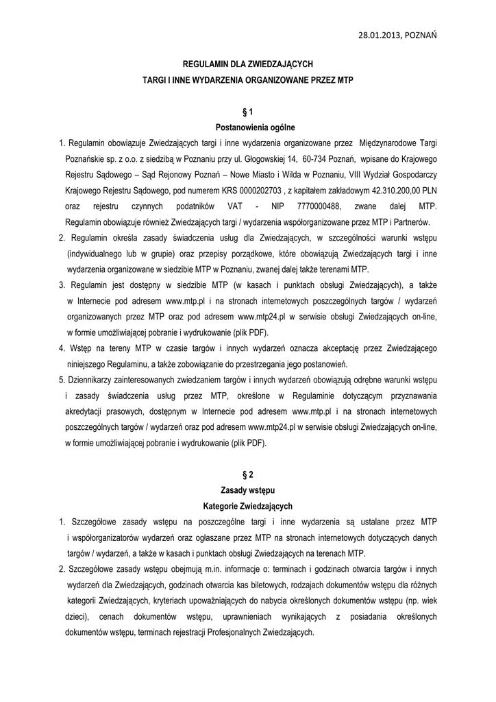 28.01.2013, POZNAŃ REGULAMIN DLA ZWIEDZAJĄCYCH TARGI I INNE WYDARZENIA ORGANIZOWANE PRZEZ MTP §1 Postanowienia ogólne 1. Regulamin obowiązuje Zwiedzających targi i inne wydarzenia organizowane przez Międzynarodowe Targi Poznańskie sp. z o.o. z siedzibą w Poznaniu przy ul. Głogowskiej 14, 60-734 Poznań, wpisane do Krajowego Rejestru Sądowego – Sąd Rejonowy Poznań – Nowe Miasto i Wilda w Poznaniu, VIII Wydział Gospodarczy Krajowego Rejestru Sądowego, pod numerem KRS 0000202703 , z kapitałem zakładowym 42.310.200,00 PLN oraz rejestru czynnych podatników VAT - NIP 7770000488, zwane dalej MTP. Regulamin obowiązuje również Zwiedzających targi / wydarzenia współorganizowane przez MTP i Partnerów. 2. Regulamin określa zasady świadczenia usług dla Zwiedzających, w szczególności warunki wstępu (indywidualnego lub w grupie) oraz przepisy porządkowe, które obowiązują Zwiedzających targi i inne wydarzenia organizowane w siedzibie MTP w Poznaniu, zwanej dalej także terenami MTP. 3. Regulamin jest dostępny w siedzibie MTP (w kasach i punktach obsługi Zwiedzających), a także w Internecie pod adresem www.mtp.pl i na stronach internetowych poszczególnych targów / wydarzeń organizowanych przez MTP oraz pod adresem www.mtp24.pl w serwisie obsługi Zwiedzających on-line, w formie umożliwiającej pobranie i wydrukowanie (plik PDF). 4. Wstęp na tereny MTP w czasie targów i innych wydarzeń oznacza akceptację przez Zwiedzającego niniejszego Regulaminu, a także zobowiązanie do przestrzegania jego postanowień. 5. Dziennikarzy zainteresowanych zwiedzaniem targów i innych wydarzeń obowiązują odrębne warunki wstępu i zasady świadczenia usług przez MTP, określone w Regulaminie dotyczącym przyznawania akredytacji prasowych, dostępnym w Internecie pod adresem www.mtp.pl i na stronach internetowych poszczególnych targów / wydarzeń oraz pod adresem www.mtp24.pl w serwisie obsługi Zwiedzających on-line, w formie umożliwiającej pobranie i wydrukowanie (plik PDF). §2 Zasady wstępu Kategorie Zwiedzających 1. Szczegółowe zasady wstępu na poszczególne targi i inne wydarzenia są ustalane przez MTP i współorganizatorów wydarzeń oraz ogłaszane przez MTP na stronach internetowych dotyczących danych targów / wydarzeń, a także w kasach i punktach obsługi Zwiedzających na terenach MTP. 2. Szczegółowe zasady wstępu obejmują m.in. informacje o: terminach i godzinach otwarcia targów i innych wydarzeń dla Zwiedzających, godzinach otwarcia kas biletowych, rodzajach dokumentów wstępu dla różnych kategorii Zwiedzających, kryteriach upoważniających do nabycia określonych dokumentów wstępu (np. wiek dzieci), cenach dokumentów wstępu, uprawnieniach wynikających dokumentów wstępu, terminach rejestracji Profesjonalnych Zwiedzających. z posiadania określonych 3. Wstęp na tereny MTP podlega regulacji, a czasami ograniczeniom, w zależności od charakteru targów / wydarzenia i jego rangi, a także kategorii Zwiedzających, na przykład poprzez: wyznaczenie odrębnych dni otwarcia targów dla Profesjonalnych Zwiedzających i odrębnych dni zwiedzania dla szerokiej publiczności, konieczność spełnienia warunku zgodności profilu działalności lub kształcenia z tematyką targów / wydarzenia w celu uzyskania promocyjnej oferty wstępu, konieczność wcześniejszego zaawizowania grup zwiedzających (grupy szkolnej, wycieczki). 4. Wstęp na tereny MTP jest możliwy tylko na podstawie dokumentu wstępu (odpłatnego lub bezpłatnego) i podlega kontroli przez MTP (czytniki kodów kreskowych na dokumentach wstępu, bramki wejściowe, kołowrotki, monitoring), z zastrzeżeniem przypadków wstępu wolnego (bez dokumentów wstępu), o którym mowa poniżej. 5. Jeżeli w związku z organizacją targów / wydarzeń adresowanych do szerokiej publiczności mają być realizowane cele edukacyjne, oświatowe, kulturalne, rekreacyjno-sportowe itp., wstęp na niektóre takie wydarzenia może być wolny (bez dokumentów wstępu) dla wszystkich Zwiedzających albo odbywać się na specjalnych warunkach (cena biletu niższa niż standardowa) dla określonych grup Zwiedzających, na przykład: a) rodzin z dziećmi – pod warunkiem zgłoszenia w kasie MTP obecności minimum 3 osób ze sobą spokrewnionych tj. dzieci z rodzicami lub opiekunami, b) studentów określonych kierunków i uczelni, których profil jest pokrewny z tematyką targów lub innych wydarzeń – pod warunkiem okazania w kasie MTP legitymacji studenckiej. 6. Do Profesjonalnych Zwiedzających jest adresowana promocyjna oferta dokumentów wstępu na targi i inne wydarzenia branżowe, z której można skorzystać pod warunkiem dokonania rejestracji, o której mowa w § 3 Regulaminu. 7. Do zorganizowanych grup Zwiedzających jest adresowana oferta ulgowych biletów wstępu na niektóre targi / wydarzenia, z której można skorzystać pod warunkiem uzyskania od MTP akceptacji zgłoszenia grupy, o czym mowa w § 4 Regulaminu. 8. Wstęp na targi i inne wydarzenia gości, tj. osób zaproszonych, odbywa się na podstawie otrzymanych przez nich zaproszeń. 9. Zwiedzający, którzy dokonali zakupu dokumentów wstępu, mają możliwość otrzymania faktury VAT w czasie trwania targów / wydarzenia. §3 Rejestracja Profesjonalnych Zwiedzających 1. Rejestracja jest warunkiem skorzystania przez Profesjonalnych Zwiedzających z promocyjnej oferty dokumentów wstępu, o której mowa w § 2 ust. 8 i określonej w szczegółowych zasadach wstępu, o których mowa w § 2 ust.1 – 3. 2. Do rejestracji jako Profesjonalni Zwiedzający są uprawnione osoby reprezentujące albo występujące w inny sposób w imieniu osób prawnych lub jednostek organizacyjnych, a także osoby fizyczne prowadzące 2 działalność gospodarczą, zarobkową lub zawodową. Do rejestracji nie są uprawione osoby występujące prywatnie, bez związku z działalnością gospodarczą, zarobkową lub zawodową. 3. Do rejestrac