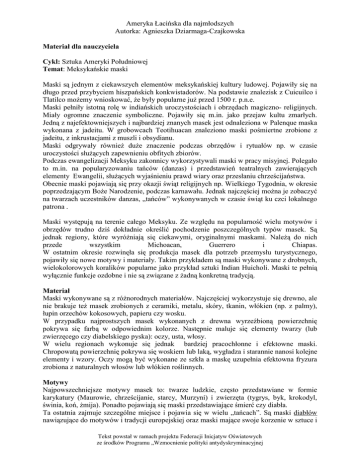 Ameryka Łacińska dla najmłodszych Autorka: Agnieszka Dziarmaga-Czajkowska Materiał dla nauczyciela Cykl: Sztuka Ameryki Południowej Temat: Meksykańskie maski Maski są jednym z ciekawszych elementów meksykańskiej kultury ludowej. Pojawiły się na długo przed przybyciem hiszpańskich konkwistadorów. Na podstawie znalezisk z Cuicuilco i Tlatilco moŜemy wnioskować, Ŝe były popularne juŜ przed 1500 r. p.n.e. Maski pełniły istotną rolę w indiańskich uroczystościach i obrzędach magiczno- religijnych. Miały ogromne znaczenie symboliczne. Pojawiły się m.in. jako przejaw kultu zmarłych. Jedną z najefektowniejszych i najbardziej znanych masek jest odnaleziona w Palenque maska wykonana z jadeitu. W grobowcach Teotihuacan znaleziono maski pośmiertne zrobione z jadeitu, z inkrustacjami z muszli i obsydianu. Maski odgrywały równieŜ duŜe znaczenie podczas obrzędów i rytuałów np. w czasie uroczystości słuŜących zapewnieniu obfitych zbiorów. Podczas ewangelizacji Meksyku zakonnicy wykorzystywali maski w pracy misyjnej. Polegało to m.in. na popularyzowaniu tańców (danzas) i przedstawień teatralnych zawierających elementy Ewangelii, słuŜących wyjaśnieniu prawd wiary oraz przesłaniu chrześcijaństwa. Obecnie maski pojawiają się przy okazji świąt religijnych np. Wielkiego Tygodnia, w okresie poprzedzającym BoŜe Narodzenie, podczas karnawału. Jednak najczęściej moŜna je zobaczyć na twarzach uczestników danzas, „tańców” wykonywanych w czasie świąt ku czci lokalnego patrona . Maski występują na terenie całego Meksyku. Ze względu na popularność wielu motywów i obrzędów trudno dziś dokładnie określić pochodzenie poszczególnych typów masek. Są jednak regiony, które wyróŜniają się ciekawymi, oryginalnymi maskami. NaleŜą do nich przede wszystkim Michoacan, Guerrero i Chiapas. W ostatnim okresie rozwinęła się produkcja masek dla potrzeb przemysłu turystycznego, pojawiły się nowe motywy i materiały. Takim przykładem są maski wykonywane z drobnych, wielokolorowych koralików popularne jako przykład sztuki Indian Huicholi. Maski te pełnią wyłącznie funkcje ozdobne i nie są związane z Ŝadną konkretną tradycją. Materiał Maski wykonywane są z róŜnorodnych materiałów. Najczęściej wykorzystuje się drewno, ale nie brakuje teŜ masek zrobionych z ceramiki, metalu, skóry, tkanin, włókien (np. z palmy), łupin orzechów kokosowych, papieru czy wosku. W przypadku najprostszych masek wykonanych z drewna wyrzeźbioną powierzchnię pokrywa się farbą w odpowiednim kolorze. Następnie maluje się elementy twarzy (lub zwierzęcego czy diabelskiego pyska): oczy, usta, włosy. W wielu regionach wykonuje się jednak bardziej pracochłonne i efektowne maski. Chropowatą powierzchnię pokrywa się woskiem lub laką, wygładza i starannie nanosi kolejne elementy i wzory. Oczy mogą być wykonane ze szkła a maskę uzupełnia efektowna fryzura zrobiona z naturalnych włosów lub włókien roślinnych. Motywy Najpowszechniejsze motywy masek to: twarze ludzkie, często przedstawiane w formie karykatury (Maurowie, chrześcijanie, starcy, Murzyni) i zwierzęta (tygrys, byk, krokodyl, świnia, koń, Ŝmija). Ponadto pojawiają się maski przedstawiające śmierć czy diabła. Ta ostatnia zajmuje szczególne miejsce i pojawia się w wielu „tańcach”. Są maski diabłów nawiązujące do motywów i tradycji europejskiej oraz maski mające swoje korzenie w sztuce i Tekst powstał w ramach projektu Federacji Inicjatyw Oświatowych ze środków Programu „Wzmocnienie polityki antydyskryminacyjnej Ameryka Łacińska dla najmłodszych Autorka: Agnieszka Dziarmaga-Czajkowska religii przedhiszpańskiej. Przykładem mogą być maski diabelskich twarzy z dodatkowymi elementami tj. węŜe, Ŝaby czy kilka par rogów. Danzas Danzas są bardzo charakterystycznym elementem meksykańskiej religijności. To rodzaj ”tańców”, wykonywanych podczas świąt religijnych, najczęściej przed kościołem lub kaplicą, ale teŜ na placu lub centralnej ulicy miasteczka czy osady. Danzas wykonywane są przez grupę męŜczyzn, rzadziej kobiet przebranych w specjalne stroje, a maski stanowią integralną część stroju tancerzy. Mają one znaczenie symboliczne. Odrywane są według tradycyjnego scenariusza, towarzyszy im na ogół prosta, rytmiczna muzyka. Część danzas ma pochodzenie prekolumbijskie i nawiązuje do indiańskich rytuałów. Inne rozwinęły się juŜ po przybyciu Hiszpanów, głównie pod wpływem działalności zakonów. Tańce, w których pojawiały się motywy walki Dobra ze Złem, ilustrujące najwaŜniejsze cnoty i grzechy czy teŜ waŜne wydarzenia biblijne były istotnym elementem ewangelizacji. Taniec Maurów i Chrześcijan (Danza de Moros y Christianos) to najpopularniejszy „taniec” w Meksyku. Przedstawia symboliczną walkę i zwycięstwo chrześcijaństwa nad pogaństwem (ilustracja maski w materiale ilustracyjnym). Taniec ten rozpowszechniony w XV-wiecznej Hiszpanii na terenie Meksyku został spopularyzowany przez misjonarzy. Taniec ma wiele regionalnych wariantów, jednak jego zasadniczą część stanowi bitwa (walka) między oddziałami Maurów i Chrześcijan. Są równieŜ danzas nawiązujące do legend czy teŜ wydarzeń historycznych. Jednym z przykładów jest Danza de Parachicos z Chiapas (zdjęcie maski w materiale ilustracyjnym). Zgodnie z legendą w XVIII w. do Chiapa de Corzo przybyła Dona Maria de Angulo. Towarzyszył jej chory syn. ZłoŜyła przysięgę, Ŝe jeśli jej syn wyzdrowieje cały swój majątek rozda ubogim. Tak teŜ się stało. Po tym jak chłopiec odzyskał zdrowie Dona Maria rozdała swoje bogactwa biednym dzieciom. Maski w tym tańcu są bardzo starannie wykonane. Przedstawiają męską twarz o jasnej cerze, z wyraźnie namalowanymi i podkreślonymi oczami, ustami, nosem. Dodatkowym elementem maski jest jasna fryzura, wykonana z naturalnych włókien. „Taniec” Paster