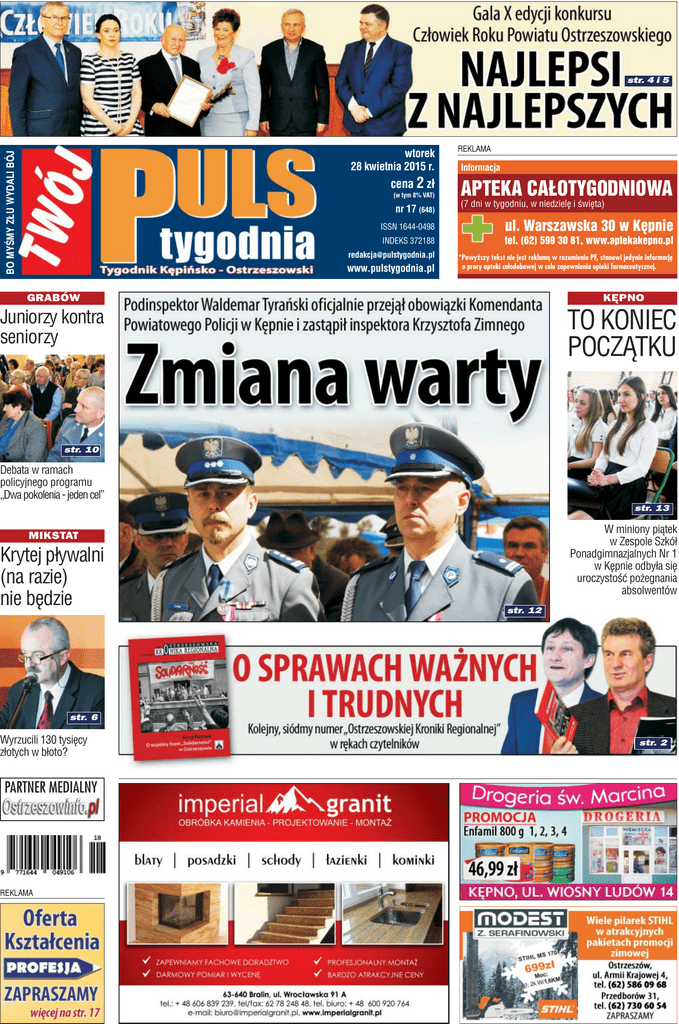 str. 4 i 5 BO MYŒMY Z£U WYDALI BÓJ wtorek 28 kwietnia 2015 r. cena 2 z³ (w tym 8% VAT) nr 17 (648) REKLAMA Informacja APTEKA CA£OTYGODNIOWA (7 dni w tygodniu, w niedzielê i œwiêta) ISSN 1644-0498 ul. Warszawska 30 w Kêpnie INDEKS 372188 tel. (62) 599 30 81, www.aptekakepno.pl [email protected] *Powy¿szy tekst nie jest reklam¹ w rozumieniu PF, stanowi jedynie informacjê o pracy apteki ca³odobowej w celu zapewnienia opieki farmaceutycznej. www.pulstygodnia.pl GRABÓW KÊPNO Juniorzy kontra seniorzy TO KONIEC POCZ¥TKU str. 10 Debata w ramach policyjnego programu „Dwa pokolenia - jeden cel” str. 13 W miniony pi¹tek w Zespole Szkó³ Ponadgimnazjalnych Nr 1 w Kêpnie odby³a siê Fot. OSP po¿egnania £êka Opatowska uroczystoœæ absolwentów MIKSTAT Krytej p³ywalni (na razie) nie bêdzie str. 12 str. 6 Wyrzucili 130 tysiêcy z³otych w b³oto? PARTNER MEDIALNY REKLAMA str. 2 2 CZAJKÓW DORUCHÓW GRABÓW KOBYLA GÓRA KRASZEWICE MIKSTAT OSTRZESZÓW Twój Puls Tygodnia wtorek - 28 kwietnia 2015 r. O SPRAWACH WA¯NYCH I TRUDNYCH OSTRZESZÓW Kolejny, siódmy numer „Ostrzeszowskiej Kroniki Regionalnej” w rêkach czytelników Do r¹k czytelników trafi³ kolejny, siódmy ju¿ numer „Ostrzeszowskiej Kroniki Regionalnej”. Wzrok przyci¹ga nie tylko jaskrawoczerwona ok³adka, ale przede wszystkim tekst autorstwa profesora Jerzego Pietrzaka, opisuj¹cy trudne pocz¹tki ostrzeszowskiej „Solidarnoœci”. - Ten tekst jest swego rodzaju demitologizacj¹ postaci powszechnie kojarzonej jako luminarza prze³omu antykomunistycznego w naszym regionie - podkreœla³ podczas spotkania promuj¹cego kronikê jej redaktor naczelny Wies³aw Przyby³a. Pierwszy numer „OKR” ujrza³ œwiat³o dzienne w 2001 roku, kolejne cztery w latach nastêpnych. PóŸniej by³a dziewiêcioletnia, wymuszona czynnikami ekonomicznymi przerwa. Kolejny jej numer - dziêki staraniom Stowarzyszenia Regionalny Oœrodek Dokumentacji WIE¯A 1916 -ukaza³ siê rok temu. W minion¹ niedzielê kronikarze oddali w rêce czytelników siódmy numer wydawnictwa. Ju¿ na pierwszy rzut oka Jerzy Pietrzak kronika, podobnie jak jej poprzedni numer, wyró¿nia siê na tle innych bogat¹ szat¹ graficzn¹. Du¿a w tym zas³uga jej wspó³twórcy Stanis³awa Kulawiaka, który odpowiedzialny by³ za projekt i sk³ad. Uwagê czytelnika przyci¹ga równie¿ jaskrawa ok³adka. Najwa¿niejsza jest jednak, na co zwraca uwagê redaktor naczelny, strona merytoryczna publikacji. - Generujemy wysoko wartoœciow¹ wiedzê, wysoko wartoœciowe zasoby na temat naszego regionu - podkreœla Przyby³a. - Zale¿y nam najbardziej na zachowaniu elitarnoœci w gromadzeniu, publikowaniu i przetwarzaniu ró¿nych materia- ³ów. Z za³o¿enia chcemy byæ o kilka piêter wy¿ej, ni¿ periodyki ulotne, tygodniowe, codzienne, które maj¹ swoj¹ inn¹ funkcjê do wype³nienia. Chcemy siê zatrzymaæ, chcemy poszukaæ wartoœciowych autorów, twórców. Chcemy pokazaæ to, co by³o i to, co bêdzie w naszym regionie najpiêkniejsze, najwartoœciowsze. Bior¹c publikacjê do rêki nie sposób nie zwróciæ uwagi na tekst pierwszego przewodnicz¹cego Komitetu Obywatelskiego „Solidarnoœæ” w by³ym ju¿ województwie kaliskim. To pierwszy tak szczegó³owy opis pocz¹tków ostrzeszowskiego ruchu zwi¹zkowego po Okr¹g³ym Stole. - Ten tekst jest swego rodzaju demitologizacj¹ postaci powszechnie kojarzonej jako luminarza prze³omu antykomunistycznego w naszym regionie - nie ukrywa Wies³aw Przyby³a. - Okazuje siê, ¿e wizerunek pana Kazimierza Obsadnego nie do koñca jest tak klarowny, czysty, jak mog³oby siê wydawaæ. Pan profesor Pietrzak dokonuje przeformu³owania roli Kazimierza Obsadnego w tamtych dniach. Pietrzak wraca do rozmów, które mia³y „usun¹æ rozdzia³ pomiêdzy „Solidarnoœci¹” ogólnopolsk¹ a ostrzeszowsk¹, aby w tych wyborach by³a jedna lista „Solidarnoœci”. REKLAMA MIEJSCE NA TWOJ¥ REKLAMÊ Zadzwoñ: tel. 62 732-05-50 Choroby tarczycy, osteoporoza, endokrynologia ogólna i ginekologiczna, niep³odnoœæ, menopauza, andropauza, zaburzenia potencji, nadmierne ow³osienie, oty³oœæ, badania hormonalne. Badania USG-tarczycy, jamy brzusznej, ginekologiczne ci¹¿y, piersi, j¹der, prostaty. Biopsje - (punkcje)piersi i tarczycy pod kontrol¹ USG z dokumentacj¹ zdjêciow¹. Ostrzeszów, ul. W³. Gomu³ki 44, rej. 502 517 325, 1 i 3-sobota miesi¹ca Kêpno, Szpital 2-sobota miesi¹ca O tym, jaki by³ efekt rozmów mo¿na dowiedzieæ siê siêgaj¹c po kronikê, autor tekstu nie chce zdradzaæ szczegó³ów. - O konflikcie, jaki powsta³ w Ostrzeszowie, dot¹d szerzej nie pisano - nie ukrywa Pietrzak. - W artykule przedstawiam problem w œwietle zebranych Ÿróde³ i w³asnych wspomnieñ. Zdajê sobie sprawê, ¿e nie wszystko zdo³a³em wyjaœniæ, ale przeszkod¹ s¹ niedostatki Ÿróde³ (m.in. nie zachowa³y siê akta Komitetu Obywatelskiego w Ostrzeszowie) i zawodnoœæ ludzkiej pamiêci. Autor spodziewa³ siê polemiki miêdzy bohaterami tamtych wydarzeñ. Nikt jednak w tej sprawie nie zabra³ g³osu, na spotkaniu zabrak³o te¿ samego Kazimierza Obsadnego, by³ za to Jerzy Bojszczak. - Koœciuszkowscy powstañcy, Czajkowska fryszerka z XVIII wieku, wiosna „Solidarnoœci”, niestrudzony rzeŸbiarz Mêki Pañskiej, XIX-wieczne szable, ¯ydzi - wspó³twórcy Ostrzeszowa, przedszkolaki z „Nazaretu”, poeta - akolita Stanis³awa Czernika - to materia³y, które znajdziemy w siódmym numerze Kroniki. S¹ te¿ wiersze ks. Roberta Chudego i grafiki Edwarda Haladyna. Autorami tekstów s¹ m.in. Ewa Chmielewska, Roman Dziergwa, Karol Górski, Maria i Maciej Latajkowie, Je- rzy KrzywaŸnia, Pawe³ Komorowski, Józef Janas, Tadeusz Pacanowski, Krzysztof Szymoniak, Marek Makie³a, £ukasz Œmiatacz czy Lech Wojciech Szajdak. OLA Nikt mnie nie zaprosi³ - Nikt mnie na to spotkanie nie zaprosi³. Owszem, Pietrzak dzwoni³ do mnie kilka razy, ale ¿adnej autoryzacji nie zrobi³ - mówi ju¿ po spotkaniu Kazimie