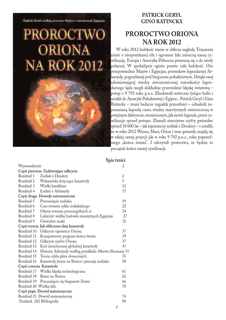 PATRICK GERYL GINO RATINCKX PROROCTWO ORIONA NA ROK 2012 W roku 2012 ludzkość stanie w obliczu zagłady. Trzęsienia ziemi o niespotykanej sile i ogromne fale zniszczą naszą cywilizację. Europa i Ameryka Północna przesuną się o do strefy polarnej. W apokalipsie zginie prawie cała ludzkość. Oto przepowiednie Majów i Egipcjan, potomków legendarnej Atlantydy, pogrzebanej pod biegunem południowym. Dzięki swej zdumiewającej wiedzy astronomicznej mieszkańcy legendarnego lądu mogli dokładnie przewidzieć klęskę światową – potop z 9 792 roku p.n.e. Zbudowali wówczas tysiące łodzi i uciekli do Ameryki Południowej i Egiptu... Patrick Geryl i Gino Ratinckx – znani badacze zagadek przeszłości – odnaleźli zapomnianą kapsułę czasu wiedzy starożytnych umieszczoną w potężnym labiryncie, wzniesionym, jak mówi legenda, przez cywilizacje sprzed potopu. Złamali starożytne szyfry gwiezdne sprzed 10 000 lat – jak tajemniczy zodiak z Dendery – i ustalili, że w roku 2012 Wenus, Mars, Orion i inne gwiazdy znajdą się w takiej samej pozycji jak w roku 9 792 p.n.e., roku poprzedniego „końca świata”. I odczytali proroctwo, że będzie to początek końca naszej cywilizacji. Spis treści Wprowadzenie 2 Część pierwsza Zadziwiające odkrycia Rozdział 1 Zodiak z Dendery 2 Rozdział 2 Wskazówki dotyczące katastrofy 5 Rozdział 3 Wielki kataklizm 12 Rozdział 4 Łodzie z Atlantydy 17 Część druga Dowody astronomiczne Rozdział 5 Przesunięcie zodiaku 19 Rozdział 6 Czas trwania cyklu zodiakalnego 22 Rozdział 7 Okresy trwania poszczególnych er 24 Rozdział 8 Labirynt: wielka budowla starożytnych Egipcjan 27 Rozdział 9 Gwiezdne znaki 32 Część trzecia Jak obliczono datę katastrofy Rozdział 10 Odkrycie tajemnicy Oriona 37 Rozdział 11 Komputerowy program końca świata 39 Rozdział 12 Odkrycie szyfru Oriona 37 Rozdział 13 Kod nieuchronnej globalnej katastrofy 47 Rozdział 14 Historia Atlantydy według przekładu Alberta Slosmana 51 Rozdział 15 Teoria cyklu plam słonecznych 55 Rozdział 16 Katastrofy, burze na Słońcu i precesja zodiaku 58 Część czwarta Katastrofa Rozdział 17 Wielka klęska technologiczna 61 Rozdział 18 Burze na Słońcu 62 Rozdział 19 Przesunięcie się biegunów Ziemi 66 Rozdział 20 Wielka fala 70 Część piąta Dowód matematyczny Rozdział 21 Dowód matematyczny 74 Dodatek 202 Bibliografia 89 1 Wprowadzenie Piszę tę książkę w gniewie, rozpaczy i bólu. Marzenie mojego życia zostało zniweczone za sprawą szeregu odkryć. Wszystkie one dotyczą nadciągającej katastrofy, największej, jaka kiedykolwiek spotkała ludzkość. Nigdy dotychczas Ziemia nie była tak gęsto zaludniona jak dziś, zatem rozmiary zagłady będą nieporównywalne z niczym. Kiedy to pojąłem, byłem w szoku, kompletnie załamany. Nie mogłem spać przez wiele nocy. Problem ten zdominował moje życie i skierował je na nowe tory. Dotychczas całe swoje życie miałem dokładnie zaplanowane. Od lat żyłem na głodowej diecie, opartej na owocach i jarzynach. Miało to mi pozwolić osiągnąć wspaniały wiek lat 120. Zainwestowałem w kilka funduszy emerytalnych, by po przejściu na emeryturę być bogatym człowiekiem. Mógłbym wtedy przez jakieś 60 lat cieszyć się życiem! I to w dodatku w dobrym zdrowiu.Testy na zwierzętach jasno wykazały, że to jest rzeczywiście możliwe: przy głodowej diecie długość ich życia zwiększała się o 30 do 100%. Opierając się na tych danych postanowiłem zrobić to samo. Perspektywa stania się zamożnym emerytem odbywającym podróże była bardzo kusząca. I oto nagle moje marzenie legło w gruzach. Zgodnie z książką Prorocza wiedza Majów Ziemia ma ulec zagładzie w dniach 21-22 grudnia 2012 roku.Tezy stawiane w tej książce wydały mi się prawidłowe, chociaż autor udostępnił nam tylko niewielką część wiedzy. Zgodnie z przepowiednią Majów tego dnia pole magnetyczne Słońca zmieni kierunek, co spowoduje, że Ziemia zacznie „wywracać się” a to będzie miało fatalne skutki dla rodzaju ludzkiego. Byłem głęboko zaszokowany. Czeka nas potworna katastrofa, większa niż wszystkie dotychczasowe. Czułem się jak sparaliżowany. Wściekałem się i przeklinałem z całego serca. Przecież miałem zacząć korzystać ze swoich funduszy emerytalnych dopiero od roku 2015! Dwadzieścia lat temu podpisałem klauzulę, że przed tym terminem nie podejmę żadnych pieniędzy. Zwiększało to wydatnie ogólną sumę i mógłbym żyć sobie luksusowo przez dziesiątki lat. Byłem święcie przekonany, że zrobiłem złoty interes. Tak było, zanim przeczytałem tę szczególną książkę. Od tej chwili wszystko co uważałem za pewne w życiu i wszystkie moje marzenia runęły. Postanowiłem zbadać dokładnie tę sprawę. Jeżeli taki kataklizm rzeczywiście ma się wydarzyć, musiałem mieć niezbite dowody. Chodzi przecież o przetrwanie rodzaju ludzkiego na Ziemi! Naturalnie natychmiast zabrałem się do badań i w rezultacie udało mi się ujawnić innym groźbę nadciągającej globalnej katastrofy. Przygotujcie się na to, że w mojej książce przeczytacie o najbardziej wstrząsających odkryciach naszej nowoczesnej cywilizacji. Katastrofa naturalna, która nastąpi, przekracza radość pojmowania każdego z nas. Emerytury stracą wszelką wartość - zatem zrezygnowałem z mojej. śaden rząd nie będzie w stanie przetrwać. Nikt w to nie uwierzy - a potem będzie już za późno. Dlatego musicie przygotować się i opracować swojąwłasną taktykę przetrwania. Będę dla was bazą danych. Przeżycie tak ogromnej katastrofy będzie niesłychanie trudne, jeżeli nie dokona się żadnych przygotowań. Zapasy żywności ulegną zniszczeniu, opieka lekarska przestanie istnieć, zawodowi ratownicy zginą. Musimy zatem niezwłocznie stworzyć grupy, które zaczną pracować nad tym zadaniem.Trzeba będzie zbudować „arki Noego”, by móc przetrzymać uderzenie ogromnych fa