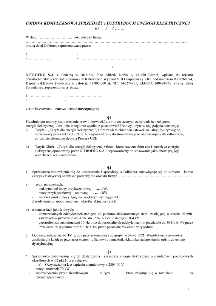 UMOWA KOMPLEKSOWA SPRZEDAśY i DYSTRYBUCJI ENERGII ELEKTRYCZNEJ nr / / ……. W dniu ……………………….. roku między firmą: …………………………………………………………………………………………………………………….. zwaną dalej Odbiorcą reprezentowaną przez: 1. ……………….. 2……………….. - ……………………………………………. - ……………………………………………. a NITROERG S.A. z siedzibą w Bieruniu, Plac Alfreda Nobla 1, 43-150 Bieruń, wpisaną do rejestru przedsiębiorstw przez Sąd Rejonowy w Katowicach Wydział VIII Gospodarczy KRS pod numerem 0000268394, Kapitał zakładowy (wpłacony w całości): 61 892 000 zł, NIP: 646274961, REGON: 240484673 zwaną dalej Sprzedawcą, reprezentowaną przez: 1 ………………… 2.………………… - …………………………. - …………………………. została zawarta umowa treści następującej: §1 Przedmiotem umowy jest określenie praw i obowiązków stron związanych ze sprzedaŜą i zakupem energii elektrycznej. JeŜeli nic innego nie wynika z postanowień Umowy, uŜyte w niej pojęcia oznaczają: a) Taryfa – „Taryfa dla energii elektrycznej”, która zawiera zbiór cen i stawek za usługi dystrybucyjne, opracowany przez NITROERG S.A. i wprowadzony do stosowania jako obowiązujący dla odbiorców, po zatwierdzeniu go decyzją Prezesa URE b) 1. a) Taryfa Obrót - „Taryfa dla energii elektrycznej Obrót”, która zawiera zbiór cen i stawek za energię elektryczną opracowany przez NITROERG S.A. i wprowadzony do stosowania jako obowiązujący w rozliczeniach z odbiorcami, §2 Sprzedawca zobowiązuje się do dostarczania i sprzedaŜy, a Odbiorca zobowiązuje się do odbioru i kupna energii elektrycznej na własne potrzeby dla obiektu firmy:……………………………………………………... przy parametrach: - maksymalnej mocy przyłączeniowej: ……kW, - mocy przyłączeniowej – umownej: . …... kW, - współczynniku mocy tgϕ0 nie większym niŜ tgϕ0= 0.4 , Zasady zmiany mocy umownej określa aktualna Taryfa. b) o standardach jakościowych: - dopuszczalnych odchyleniach napięcia od poziomu deklarowanego sieci zasilającej w czasie 15 min. zawartych w przedziale od -10% do +5% w sieci o napięciu 0,4 kV. - częstotliwości znamionowej 50 Hz oraz dopuszczalnych odchyleniach w przedziale od 50 Hz ± 1% przez 95% czasu w tygodniu oraz 50 Hz ± 4% przez pozostałe 5% czasu w tygodniu. 2. Odbiorca zalicza się do IV grupy przyłączeniowej i do grupy taryfowej C21. Współczynnik pewności zasilania dla kaŜdego przyłącza wynosi 1. Stanowi on mnoŜnik składnika stałego stawki opłaty za usługę dystrybucyjną. §3 1. Sprzedawca zobowiązuje się do dostarczania i sprzedaŜy energii elektrycznej o standardach jakościowych określonych w §2 pkt.1b z przyłączy: a) Oczyszczalnia I, o napięciu znamionowym 230/400 V - mocy umownej: 70 kW - zabezpieczeniu przed licznikowym ……. A typu ………., które znajduje się w rozdzielni ……….. na terenie Sprzedawcy 1 - 2. 3. 4. 1. 2. 3. 4. 5. b) ……………………….., o napięciu znamionowym 230/400 V mocy umownej: ………kW zabezpieczeniu przed licznikowym ……. A typu ………, które znajduje się w rozdzielni ……….. na terenie Sprzedawcy Wszelkie prace ruchowe i eksploatacyjne sieci mogą być prowadzone tylko po uzgodnieniu ze Sprzedawcą. W przypadkach awaryjnych oraz w przypadku konieczności wykonania prac konserwacyjnych Odbiorca zastrzega sobie prawo dostępu do własnych sieci i instalacji elektroenergetycznych przebiegających przez teren Sprzedawcy, związanych z zasilaniem odbiorów Odbiorcy. W przypadkach awaryjnych oraz w przypadku konieczności wykonania prac konserwacyjnych Sprzedawca zastrzega sobie prawo dostępu do własnych sieci i instalacji elektroenergetycznych przebiegających przez teren Odbiorcy. §4 Powiadomienie o terminie i czasie planowych przerw w dostawie energii elektrycznej nastąpi nie później niŜ na 5 dni kalendarzowych przed terminem przerwy lub w terminie krótszym za zgodą obu stron . Sprzedawca nie ponosi odpowiedzialności za niedostarczenie energii elektrycznej oraz za szkody spowodowane w wyniku przerw planowych. W przypadku wprowadzenia przez Radę Ministrów ograniczeń w dostarczaniu i poborze energii elektrycznej Odbiorca jest zobowiązany do dostosowania maksymalnego poboru mocy i dobowego poboru energii do planu ograniczeń stosownie do komunikatów radiowych lub indywidualnego zawiadomienia. Za szkody wynikłe z wprowadzenia w.w. ograniczeń w dostarczaniu i poborze energii elektrycznej Sprzedawca nie ponosi odpowiedzialności. Maksymalne ograniczenie w dostarczaniu i poborze energii elektrycznej o którym mowa w pkt.3 ustala się na poziomie ……… kW przy 20 stopniu zasilania. Odbiorca oświadcza, Ŝe określone wyŜej ograniczenia nie spowodują zagroŜenia bezpieczeństwa ludzi oraz uszkodzenia lub zniszczenia obiektów technologicznych. §5 Odbiorca zobowiązuje się do odbioru energii elektrycznej z sieci elektroenergetycznej Sprzedawcy według aktualnych warunków przyłączenia. 2. W przypadku nie spełnienia przez Odbiorcę wymagań określonych w warunkach przyłączenia, Sprzedawca nie ponosi odpowiedzialności za zapewnienie parametrów jakościowych sprzedawanej i przesyłanej energii elektrycznej. 3. Odbiorca ma obowiązek uzgodnić nastawę zabezpieczeń przekaźnikowych ze słuŜbami Sprzedawcy. 1. 1. 2. 3. §6 Miejscem dostarczenia i odbioru energii elektrycznej jest obiekt firmy: ……………………………………………………………………………………………. granicą eksploatacji urządzeń są: − końcówki wejściowe kabla z rozdzielni ………. do przyłącza kablowego na …………………………… − końcówki wejściowe kabla z rozdzielni ………. do przyłącza kablowego na …………………