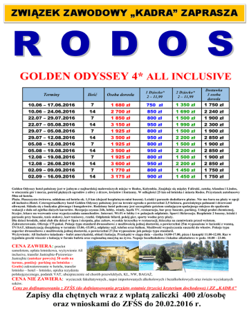R O D O S GOLDEN ODYSSEY 4* ALL INCLUSIVE Terminy Ilość Osoba dorosła 1 Dziecko* 2 – 11,99 2 Dziecko* 2 – 11,99 Dostawka 3 osoba dorosła 10.06 – 17.06.2016 7 1 680 zł 750 zł 1 350 zł 1 750 zł 10.06 – 24.06.2016 14 2 700 zł 850 zł 1 690 zł 2 240 zł 22.07 – 29.07.2016 7 1 850 zł 800 zł 1 500 zł 1 900 zł 22.07 – 05.08.2016 14 3 150 zł 950 zł 1 990 zł 2 300 zł 29.07 – 05.08.2016 7 1 925 zł 800 zł 1 500 zł 1 900 zł 29.07 – 12.08.2016 14 3 500 zł 950 zł 2 200 zł 2 850 zł 05.08 – 12.08.2016 7 1 925 zł 800 zł 1 500 zł 1 900 zł 05.08 – 19.08.2016 14 3 500 zł 950 zł 2 200 zł 2 850 zł 12.08 – 19.08.2016 7 1 925 zł 800 zł 1 500 zł 1 900 zł 12.08 – 26.08.2016 14 3 600 zł 950 zł 2 200 zł 2 850 zł 02.09 – 09.09.2016 7 1 770 zł 800 zł 1 450 zł 1 750 zł 02.09 – 16.09.2016 14 3 175 zł 900 zł 1 450 zł 1 750 zł Golden Odyssey hotel położony jest w jednym z najbardziej malowniczych miejsc w Rodos, Kolymbia. Znajduje się między Faliraki, zatoką Afandou i Lindos, w otoczeniu gór i morza, pośród pięknych ogrodów z oliwy z drzew, kwiatów i fontanny. W odległości 25 km od lotniska i miasta Rodos. Przystanek autobusowy 50m od hotelu. Plaża. Piaszczysto-żwirowa, oddalona od hotelu ok. 1,5 km (dojazd bezpłatnym mini busem). Leżaki i parasole dodatkowo płatne. Nie ma baru na plaży w opcji all inclusive.Hotel. Czterogwiazdkowy hotel Golden Odyssey położony jest na terenie ogrodu o powierzchni 2,5 hektara, porośniętego palmami i drzewami oliwnymi. Składa się z budynku głównego i bungalowów. Rodzinny hotel polecany jest szczególnie gościom szukającym spokojnego miejsca do spędzenia wakacji z dala od zgiełku dużych kurortów. Recepcja czynna 24h, lobby, windy, kącik TV, restauracja, bar przy basenie, parking. Usługi pralni chemicznej, fryzjer, lekarz na wezwanie oraz wypożyczalnia samochodów. Internet. Wi-Fi w lobby i w pokojach odpłatnie. Sport i Rekreacja. Bezpłatnie 2 baseny, leżaki i parasole przy basenie, tenis stołowy, kort tenisowy, rzutki. Odpłatnie bilard, pokój gier, sporty wodne przy plaży. Dla dzieci brodzik, mini club dla dzieci w lipcu i sierpniu, plac zabaw, wysokie krzesełka w restauracji, łóżeczka na zamówienie przed wylotem. Zakwaterowanie. Oferuje 175 pokoi. Pokoje typu standard dwuosobowe z możliwością jednej dostawki, o powierzchni 25m wyposażone w łazienki z wanną, TV/SAT, klimatyzację (bezpłatną w terminie 15.06.-15.09.), odpłatny sejf, telefon oraz balkon. Możliwość wypożyczenia suszarki do włosów. Pokoje typu superior dwuosobowe z możliwością jednej dostawki, o powierzchni 27,5m wyposażone jak pokoje typu standard. Wyżywienie: All Inclusive śniadanie - bufet amerykański, obiad i kolacja. Przekąski w ciągu dnia - ciastka 14.00-17.00, pizza i kanapki 11.00-12.00. Raz w tygodniu grecki wieczór z kolacją w formie bufetu oraz regionalną muzyką na żywo. Napoje bezalkoholowe i lokalne alkoholowe w godz. 10.00 - 23.00. CENA ZAWIERA: przelot samolotem, opłata lotniskowa, wyżywienie All inclusive, transfer Jastrzębie-PyrzowiceJastrzębie (autokar powyżej 30 osób na turnus, poniżej- parking na lotnisku – Gratis) zakwaterowanie w hotelu, transfer lotnisko – hotel – lotnisko, opieka rezydenta polskojęzycznego, podatek VAT, ubezpieczenie od chorób przewlekłych, KL, NW, BAGAŻ, CENA NIE ZAWIERA: wycieczek fakultatywnych., napoi importowanych alkoholowych i bezalkoholowych oraz świeżo wyciskanych soków. Ceny po dofinansowaniu z ZFŚS (do dofniansowania przyjęto ostatnie (trzecie) kryterium dochodowe) i ZZ „KADRA” Zapisy dla chętnych wraz z wpłatą zaliczki 400 zł/osobę oraz wnioskami do ZFŚS do 20.02.2016 r.