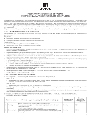PODSTAWOWE INFORMACJE DOTYCZĄCE UBEZPIECZENIA KAPITALNA PRZYSZŁOŚĆ (PI/KAP/1/2016) Niniejszy dokument został opracowany przez Aviva Towarzystwo Ubezpieczeń na Życie SA, zgodnie z wymogiem Art. 22 Ustawy z dnia 11 września 2015 roku o działalności ubezpieczeniowej i reasekuracyjnej. Stanowi materiał pomocniczy, opisujący główne zagadnienia dotyczące zasad funkcjonowania tego ubezpieczenia. Prosimy o zwrócenie szczególnej uwagi na fakt, że decyzja o zawarciu umowy ubezpieczenia na życie z ubezpieczeniowymi funduszami kapitałowymi (dalej UFK) powinna zostać podjęta po wcześniejszym zapoznaniu się z pełną dokumentacją ubezpieczeniową (zwłaszcza z ogólnymi warunkami ubezpieczenia). Znajdują się w niej m.in. szczegółowe informacje o przedmiocie ubezpieczenia, jego zakresie i wyłączeniach odpowiedzialności, a także o strategii inwestycyjnej poszczególnych UFK oraz opłatach. Pełny opis warunków Ubezpieczenia Kapitalna Przyszłość znajduje się w ogólnych warunkach Ubezpieczenia Inwestycyjnego Kapitalna Przyszłość. 1. CELE, CHARAKTER ORAZ GŁÓWNE CECHY UBEZPIECZENIA Ubezpieczenie na życie Kapitalna Przyszłość ma charakter inwestycyjny. Jest ofertą dla osób, które chciałyby regularnie odkładać pieniądze z myślą o realizacji przyszłych celów. Cel główny: • gromadzenie kapitału na przyszłość na rachunku podstawowym, • wypłata zgromadzonych środków w przypadku śmierci Ubezpieczonego. Cele dodatkowe: • inwestowanie dodatkowych kwot na rachunkach lokacyjnych, • zabezpieczenie w razie śmierci wskutek nieszczęśliwego wypadku. Główne cechy ubezpieczenia: • inwestowanie wpłacanych środków – alokacja składki regularnej wynosi 95% w okresie pierwszych 5 lat, a po upływie tego okresu 100%; opłata alokacyjna nie jest pobierana od składek lokacyjnych, • możliwość podwyższenia lub obniżenia składki w ramach obowiązujących limitów, zmiany częstotliwości jej płacenia lub jej czasowego zawieszenia, • możliwość wpłacania w dowolnym momencie dodatkowych kwot na rachunek lokacyjny, • dostęp do 13 ubezpieczeniowych funduszy kapitałowych (na dzień zawarcia umowy) oraz możliwość podejmowania decyzji o wyborze funduszy i ich zmianie (także przez Internet); ewentualne opłaty za taką zmianę są wskazane dalej, • dostępność bezpłatnej usługi Parasol Zysków, która umożliwia ograniczenie ryzyka zmniejszenia się wartości zgromadzonego kapitału tuż przed jego wypłatą w terminie zaplanowanym na początku programu, • możliwość wypłacenia części zgromadzonych pieniędzy bez zerwania umowy: • z rachunku podstawowego − od 3 roku trwania umowy i po opłaceniu składek należnych w 2 pierwszych latach jej trwania, • z rachunku lokacyjnego − w dowolnym momencie trwania umowy, • możliwość całkowitej wypłaty środków w dowolnym czasie, co w zależności od roku ubezpieczenia może wiązać się z koniecznością poniesienia opłaty za wykup (wysokość tej opłaty jest wskazana w punkcie 6), • możliwość zawieszenia składki regularnej począwszy od 2 roku (tj. pod warunkiem opłacenia wszystkich składek za 1 rok), • maksymalny wieku wstępu Ubezpieczonego – 60 lat. 2. WYKAZ ŚWIADCZEŃ PRZYSŁUGUJĄCYCH Z UMOWY • Umowa główna – świadczenie z tytułu śmierci jest zależne od wieku ubezpieczonego: Wiek < 55 lat: • świadczenie z tytułu śmierci stanowi większą z dwóch kwot: 103 proc. wartości rachunku podstawowego albo sumę składek regularnych zainwestowanych na tym rachunku, pomniejszoną o kwotę częściowych wypłat Wiek >= 55 lat: • świadczenie z tytułu śmierci wynosi 103 proc. wartości rachunku podstawowego W każdym z powyższych przypadków świadczenie jest powiększane o wartość rachunku lokacyjnego i pomniejszane o kwoty należności z tytułu umów dodatkowych. • Umowa dodatkowa śmierć wskutek nieszczęśliwego wypadku (o ile taka umowa dodatkowa zostanie zawarta) – świadczenie z tytułu śmierci wskutek nieszczęśliwego wypadku (umowa dostępna dla pełnoletniego Ubezpieczonego). 3. W YKAZ FUNDUSZY KAPITAŁOWYCH OFEROWANYCH W RAMACH UMOWY ORAZ INFORMACJA O RYZYKU INWESTYCYJNYM (PROFILU RYZYKA INWESTYCYJNEGO) Nazwa funduszu Informacja o ryzyku inwestycyjnym (profilu ryzyka inwestycyjnego) Zalecany okres inwestowania Opłata za zarządzanie i administrację (w skali roku) 1. Pieniężny Bardzo wysoki poziom bezpieczeństwa inwestycyjnego. Fundusz przeznaczony jest dla osób ceniących bezpieczeństwo i trwały wzrost swoich oszczędności. Dowolny 1,5% 2. Gwarancji Zysku Wysoki poziom bezpieczeństwa inwestycji. Fundusz jest przeznaczony dla osób szczególnie ceniących bezpieczeństwo, które oczekują pewnego zysku z inwestycji niezależnie od koniunktury na rynkach finansowych. Dowolny 1,25% 1 Nazwa funduszu 1 3. Gwarantowany 4. Dłużny Aktywnej Selekcji 5. Stabilnego Wzrostu 6. Informacja o ryzyku inwestycyjnym (profilu ryzyka inwestycyjnego) Wysoki poziom bezpieczeństwa (ryzyko inwestycyjne nie istnieje). Fundusz przeznaczony jest dla osób szczególnie ceniących bezpieczeństwo i trwały wzrost swoich oszczędności. Zalecany okres inwestowania Opłata za zarządzanie i administrację (w skali roku) Dowolny 2% Co najmniej 2 lata 0%1 Niski poziom ryzyka inwestycyjnego. Fundusz przeznaczony jest dla osób oczekujących długoterminowego wzrostu oszczędności na poziomie przekraczającym oprocentowanie lokat bankowych, przy nieco wyższym ryzyku inwestycyjnym. Co najmniej 2 lata 2,25% Stabilny Aktywnej Selekcji Średnie ryzyko inwestycyjne. Fundusz przeznaczony jest dla osób oczekujących długoterminowo stabilnego wzrostu oszczędności na poziomie przekraczającym oprocentowanie lokat bankowych, przy wyższym ryzyku inwestycyjnym, związanym z inwestowaniem części aktywów funduszu na rynku akcji. Co najmniej 3 lata 0%1 7. Zrównoważony Podwyższone ryzyko inwestycyjne. Fundusz przeznaczony jest dla osób a