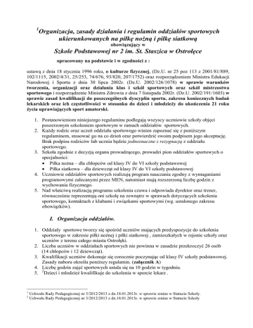 1 Organizacja, zasady działania i regulamin oddziałów sportowych ukierunkowanych na piłkę nożną i piłkę siatkową obowiązujący w Szkole Podstawowej nr 2 im. St. Staszica w Ostrołęce opracowany na podstawie i w zgodności z : ustawą z dnia 18 stycznia 1996 roku, o kulturze fizycznej, (Dz.U. nr 25 poz 113 z 2001/81/889, 102/1115, 2002/4/31, 25/253, 74/676, 93/820, 207/1752) oraz rozporządzeniem Ministra Edukacji Narodowej i Sportu z dnia 30 lipca 2002r. (Dz.U. 2002/126/1078) w sprawie warunków tworzenia, organizacji oraz działania klas i szkół sportowych oraz szkół mistrzostwa sportowego i rozporządzenie Ministra Zdrowia z dnia 7 listopada 2002r. (Dz.U. 2002/191/1603) w sprawie zasad kwalifikacji do poszczególnych dyscyplin sportu, zakresu koniecznych badań lekarskich oraz ich częstotliwości w stosunku do dzieci i młodzieży do ukończenia 21 roku życia uprawiających sport amatorski. 1. Postanowieniom niniejszego regulaminu podlegają wszyscy uczniowie szkoły objęci poszerzonym szkoleniem sportowym w ramach oddziałów sportowych. 2. Każdy rodzic oraz uczeń oddziału sportowego winien zapoznać się z poniższym regulaminem, stosować go na co dzień oraz potwierdzić swoim podpisem jego akceptację. Brak podpisu rodziców lub ucznia będzie jednoznaczne z rezygnacją z oddziału sportowego. 3. Szkoła zgodnie z decyzją organu prowadzącego, prowadzi pion oddziałów sportowych o specjalności: Piłka nożna – dla chłopców od klasy IV do VI szkoły podstawowej Piłka siatkowa – dla dziewcząt od klasy IV do VI szkoły podstawowej 4. Uczniowie oddziałów sportowych realizują program nauczania zgodny z wymaganiami programowymi zalecanymi przez MEN, natomiast mają rozszerzoną liczbę godzin z wychowania fizycznego. 5. Nad właściwą realizacją programu szkolenia czuwa i odpowiada dyrektor oraz trener, równocześnie reprezentują oni szkołę na zewnątrz w sprawach dotyczących szkolenia sportowego, kontaktach z klubami i związkami sportowymi (wg. ustalonego zakresu obowiązków). I. Organizacja oddziałów. 1. Oddziały sportowe tworzy się spośród uczniów mających predyspozycje do szkolenia sportowego w zakresie piłki nożnej i piłki siatkowej , zamieszkałych w rejonie szkoły oraz uczniów z terenu całego miasta Ostrołęki. 2. Liczba uczniów w oddziałach sportowych nie powinna w zasadzie przekroczyć 26 osób (14 chłopców i 12 dziewcząt). 3. Kwalifikacji uczniów dokonuje się corocznie poczynając od klasy IV szkoły podstawowej. Zasady naboru określa poniższy regulamin. (załącznik A) 4. Liczbę godzin zajęć sportowych ustala się na 10 godzin w tygodniu. 5. 2Dzieci i młodzież kwalifikuje do szkolenia w sporcie lekarz . 1 2 Uchwała Rady Pedagogicznej nr 3/2012/2013 z dn.18.01.2013r. w sprawie zmian w Statucie Szkoły. Uchwała Rady Pedagogicznej nr 3/2012/2013 z dn.18.01.2013r. w sprawie zmian w Statucie Szkoły 6. Warunkiem zakwalifikowania do uczestnictwa w zajęciach lub zawodach jest posiadanie ważnego zaświadczenia lekarskiego. 7. Za kontrolę posiadania badań lekarskich odpowiada wyznaczony trener. 8. W razie nie dostarczenia przez rodziców ważnych badan lekarskich, przez dłużej niż dwa miesiące, dyrektor szkoły na wniosek trenera może przenieść ucznia do oddziału niesportowego lub w razie braku miejsc do szkoły rejonowej. 9. Opiekę nad uczniami sprawuje wyznaczony przez dyrektora szkoły wychowawca, a zajęcia sportowe realizowane są przez wykwalifikowanych trenerów. 10. Szkolenie sportowe obejmuje zajęcia prowadzone na terenie szkoły wynikające z planu nauczania oraz: Mecze prowadzone w ramach ligi Mecze towarzyskie oraz turnieje Letnie i zimowe obozy sportowe (lub zamiennie zajęcia w szkole podczas wakacji). Wyżej wymienione formy zajęć są obowiązkowe dla wszystkich uczniów, kwalifikacji oraz zwolnienia dokonuje wyznaczony trener, mają one znaczący wpływ na ocenę przydatności ucznia do dalszego szkolenia. 11. Obozy szkoleniowe organizowane są przede wszystkim w okresie wolnym od nauki, pełną odpłatność za ich organizację pokrywają rodzice. II. Prawa i obowiązki uczniów oraz rodziców 1. Szkoła zapewnia uczniom oddziałów sportowych: Odpłatne korzystanie ze stołówki szkolnej Możliwość korzystania z pryszniców po zajęciach i zawodach sportowych Odpowiednią bazę treningową Podstawowy sprzęt sportowy 2. Rodzice powinni w szczególności: Udzielić pisemnej zgody na uczestniczenie dziecka w zajęciach sportowych Włączyć się materialnie i organizacyjnie w pomoc przy organizacji meczów i wyjazdów ligowych Decydować o miejscu i czasie organizacji obozów szkoleniowych Umożliwić dziecku przeprowadzanie okresowych badań lekarskich 3. Uczniowie mogą i powinni: Przestrzegać wewnętrzne regulaminy szkolne Być reprezentantami szkoły w zawodach sportowych w Polsce oraz podczas wyjazdów zagranicznych Uczniowie znajdujący się w bardzo trudnej sytuacji materialnej, na wniosek rodziców korzystać mogą z pomocy szkoły lub klubu (jeżeli takie środki przewidziane zostaną w budżecie szkoły) 4. Uczeń nieprzestrzegający postanowień regulaminu zostaje przeniesiony do szkoły rejonowej lub do oddziału niesportowego, szczególnie w razie: Notorycznego naruszania postanowień regulaminów szkolnych – jeżeli jego zachowanie ocenione zostanie na nieodpowiednie Stwierdzenie palenia papierosów, picia alkoholu lub stosowania innych niedozwolonych używek Osiąganie słabych wyników sportowych lub dydaktycznych Częstego (30% zajęć w semestrze) opuszczenia treningów oraz meczów bez usprawiedliwienia Stwierdzenia zachowania zagrażającego innym uczniom a) decyzje o przeniesieniu ucznia podejmuje dyrektor szkoły po opinii trenera i wychowawcy b) rodzice winni być powiadomieni o fakcie wykluczenia ucznia z oddziału sportowego na miesiąc przed terminem c) stwierdzenie ciężkiego naruszenia postanowień regulaminu powoduje skreślenie ucznia w każdy