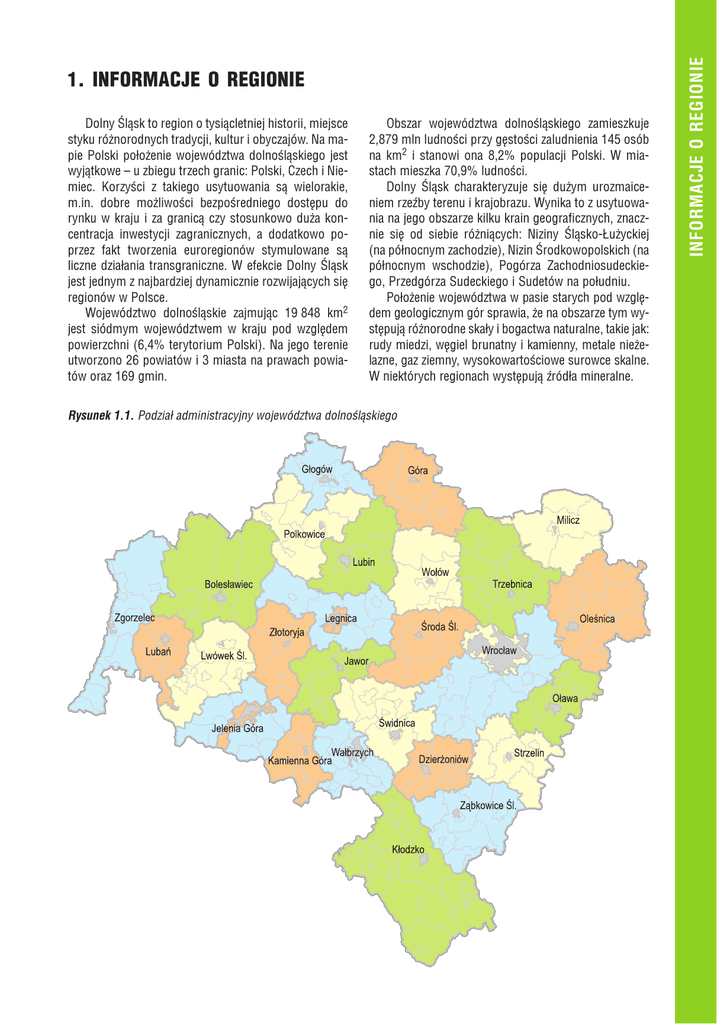 Dolny Œl¹sk to region o tysi¹cletniej historii, miejsce styku ró¿norodnych tradycji, kultur i obyczajów. Na mapie Polski po³o¿enie województwa dolnoœl¹skiego jest wyj¹tkowe – u zbiegu trzech granic: Polski, Czech i Niemiec. Korzyœci z takiego usytuowania s¹ wielorakie, m.in. dobre mo¿liwoœci bezpoœredniego dostêpu do rynku w kraju i za granic¹ czy stosunkowo du¿a koncentracja inwestycji zagranicznych, a dodatkowo poprzez fakt tworzenia euroregionów stymulowane s¹ liczne dzia³ania transgraniczne. W efekcie Dolny Œl¹sk jest jednym z najbardziej dynamicznie rozwijaj¹cych siê regionów w Polsce. Województwo dolnoœl¹skie zajmuj¹c 19 848 km2 jest siódmym województwem w kraju pod wzglêdem powierzchni (6,4% terytorium Polski). Na jego terenie utworzono 26 powiatów i 3 miasta na prawach powiatów oraz 169 gmin. Obszar województwa dolnoœl¹skiego zamieszkuje 2,879 mln ludnoœci przy gêstoœci zaludnienia 145 osób na km2 i stanowi ona 8,2% populacji Polski. W miastach mieszka 70,9% ludnoœci. Dolny Œl¹sk charakteryzuje siê du¿ym urozmaiceniem rzeŸby terenu i krajobrazu. Wynika to z usytuowania na jego obszarze kilku krain geograficznych, znacznie siê od siebie ró¿ni¹cych: Niziny Œl¹sko-£u¿yckiej (na pó³nocnym zachodzie), Nizin Œrodkowopolskich (na pó³nocnym wschodzie), Pogórza Zachodniosudeckiego, Przedgórza Sudeckiego i Sudetów na po³udniu. Po³o¿enie województwa w pasie starych pod wzglêdem geologicznym gór sprawia, ¿e na obszarze tym wystêpuj¹ ró¿norodne ska³y i bogactwa naturalne, takie jak: rudy miedzi, wêgiel brunatny i kamienny, metale nie¿elazne, gaz ziemny, wysokowartoœciowe surowce skalne. W niektórych regionach wystêpuj¹ Ÿród³a mineralne. Rysunek 1.1. Podzia³ administracyjny województwa dolnoœl¹skiego INFORMACJE O REGIONIE 1. INFORMACJE O REGIONIE Fot. 1.1. Œnie¿ka (fot. Marek Potocki) Sieæ komunikacyjna Dolnego Œl¹ska jest doœæ dobrze rozwiniêta. Gêstoœæ dróg (92,2 km na 100 km2) jest zdecydowanie wy¿sza od œredniej krajowej. Podobnie przedstawia siê sytuacja z liniami kolejowymi, których gêstoœæ wynosi 9,3 km na 100 km2 (w Polsce 6,6 km). Najwa¿niejszym szlakiem tranzytowym jest autostrada A4, bêd¹ca czêœci¹ europejskiego korytarza, ³¹cz¹cego Niemcy z Ukrain¹. Wroc³aw jest wa¿nym wêz³em kolejowym, który ³¹czy siê z miêdzynarodowymi szlakami w kierunku Warszawy i dalej Moskwy, a tak¿e Berlina i Drezna oraz Pragi. Wa¿n¹ i coraz wiêksz¹ rolê odgrywa miêdzynarodowy port lotniczy. Ruch wodny Odr¹ straci³ wprawdzie ostatnio na znaczeniu, ale istniej¹ plany przywrócenia nale¿nej rangi drodze wodnej jako jednemu z najtañszych sposobów transportu. Rzeka Odra stanowi element europejskiego korytarza transportowego. W strukturze gospodarki Dolnego Œl¹ska istotn¹ rolê odgrywa przemys³ wydobywczy. G³ówne jego ga³êzie to wydobycie: rud miedzi i srebra w Legnicko-G³ogowskim Okrêgu Miedziowym, wêgla brunatnego w Worku Turoszowskim, ró¿nego rodzaju kamieni drogowych i budowlanych, glin ogniotrwa³ych (ze z³o¿a Rusko–Jaroszów) oraz gazu ziemnego. Dolny Œl¹sk zajmuje pierwsze miejsce w Polsce pod wzglêdem wielkoœci zasobów oraz wydobycia kamieni drogowych i budowlanych (50% ogó³u zasobów w Polsce). W masywie Strzegom–Sobótka znajduj¹ siê najwiêksze w Polsce udokumentowane z³o¿a granitów. W ostatnich latach na Dolnym Œl¹sku nast¹pi³ rozwój inwestycji. Najwiêksze œrodki zainwestowano w sektorach: bankowoœci, ubezpieczeñ, przemyœle motoryzacyjnym, produkcji ¿ywnoœci, przemyœle maszynowym, elektronicznym, chemicznym, metali nie¿elaznych, stacjach paliw, sieci supermarketów i hipermarketów oraz hotelach i restauracjach. Wszystkie te uwarunkowania geograficzne, klimatyczne oraz spo³eczno-gospodarcze maj¹ swoje odzwierciedlenie w jakoœci œrodowiska przyrodniczego i kierunkach jego zmian. INFORMACJE O REGIONIE Prawie ca³y obszar województwa le¿y w dorzeczu Odry, która przep³ywa przez jego œrodkow¹ czêœæ. G³ówne dop³ywy Odry na Dolnym Œl¹sku to: Nysa K³odzka, O³awa, Bystrzyca, Kaczawa, Barycz, Bóbr i Nysa £u¿ycka. Lewobrze¿ne dop³ywy Odry, z wyj¹tkiem Œlêzy i O³awy, maj¹ charakter rzek górskich, które powoduj¹ okresowe, gwa³towne wezbrania. Z kolei rzeki prawostronne to spokojniejsze rzeki nizinne. Województwo nale¿y do ubogich w zbiorniki wodne. Poza nielicznymi jeziorami naturalnymi istnieje kilka zbiorników sztucznych, zbudowanych m.in. w celu przeciwdzia³ania powodziom (np. zbiornik S³up na Nysie Szalonej, czy te¿ zbiornik Pilchowice na Bobrze) oraz liczne stawy rybne (najwiêcej w okolicach Milicza). Krajobraz Dolnego Œl¹ska jest niezwykle urozmaicony. Bogactwo form przestrzennych uzupe³nia wyj¹tkowo cenna szata roœlinna i rzadkie gatunki zwierz¹t. W Sudetach wystêpuj¹ gatunki endemiczne oraz gatunki reliktowe typowe dla pó³nocnej Europy. Klimat Dolnego Œl¹ska charakteryzuje du¿a zmiennoœæ i nieregularnoœæ przebiegu parametrów meteorologicznych wynikaj¹ca z ró¿norodnoœci rzeŸby terenu. Pó³nocna czêœæ regionu znajduje siê na pograniczu charakterystycznych dla strefy umiarkowanej klimatów: oceanicznego i kontynentalnego, a po³udnie jest pod wp³ywem strefowego klimatu górskiego. Ni¿owa czêœæ województwa nale¿y do najcieplejszych obszarów w Polsce. W Sudetach, zale¿nie od wysokoœci, klimat jest znacznie ostrzejszy.