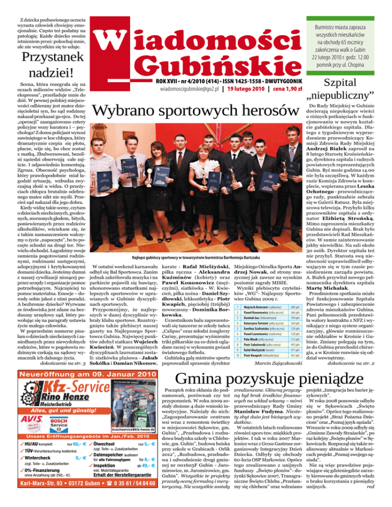 Z dziecka pozbawionego uczucia wyrasta człowiek chwiejny emocjonalnie. Często też podatny na patologię. Każde dziecko swoim istnieniem prosi: pokochaj mnie, ale nie wszystkim się to udaje. iadomości W Przystanek __Gubińskie nadziei! y Scena, która rozegrała się na oczach milionów widzów „Teleekspressu”, prześladuje mnie do dziś. W pewnej polskiej miejscowości odbierany jest matce dziesięcioletni syn, bo sąd rodzinny nakazał przekazać go ojcu. Do tej „operacji” zaangażowano cztery policyjne wozy kuratora i – psychologa! Z domu policjant wynosi zawiniętego w koc chłopca, który dramatycznie czepia się płotu, płacze, wije się, bo chce zostać z matką. Zbulwersowani, bezsilni sąsiedzi obserwują całe zajście. I odpowiednio komentują. Zgroza. Obecność psychologa, który prawdopodobnie miał łagodzić sytuację, wzbudza zwyczajną złość u widza. O przeżyciach chłopca brutalnie odebranego matce nikt nie myśli. Przecież sąd nakazał dla jego dobra. Kiedy widzę takie sceny, czytam o dzieciach niechcianych, gwałconych, morzonych głodem, bitych, poniewieranych przez rodziców alkoholików, wściekam się, że z takim namaszczeniem walczymy o życie „napoczęte”, bo to poczęte schodzi na drugi tor. Niewielu obchodzi. Łagodzimy swoje sumienia pogotowiami rodzinnymi, rodzinami zastępczymi, adopcyjnymi i krytykowanymi domami dziecka. Jesteśmy dumni g z naszej cywilizacji niosącej poprzez urzędy i organizacje pomoc potrzebującym. Najczęściej to pomoc materialna. Emocje – dorosły sobie jakoś z nimi poradzi. A bezbronne dziecko? Wyrwane ze środowiska jest zdane na bezduszny urzędowy sąd, który powołując się na paragrafy ustawia życie małego człowieka. W poprzednim numerze pisałam o dzieciach niechcianych i zaniedbanych przez niewydolnych rodziców, które w pogotowiu rodzinnym czekają na sądowy wyznacznik ich dalszego życia. dokończenie na str. 3 . . . ROK XVII nr 4/2010 (414) ISSN 1425-1558 DWUTYGODNIK [email protected] | 19 lutego 2010 | cena 1,90 zł Wybrano sportowych herosów Najlepsi gubińscy sportowcy w towarzystwie burmistrza Bartłomieja Bartczaka W ostatni weekend karnawału odbył się Bal Sportowca. Zanim jednak zakrólowała muzyka i na parkiecie pojawili się bawiący, uhonorowano statuetkami najlepszych sportowców w uprawianych w Gubinie dyscyplinach sportowych. Przypomnijmy, że najlepszych w danej dyscyplinie wybrały klubu sportowe. Rozstrzygnięto także plebiscyt naszej gazety na Najlepszego Sportowca Gubina. Najwięcej punktów zdobył siatkarz Wojciech Kwiecień. W poszczególnych dyscyplinach laureatami zostali: siatkówka plażowa - Jakub Sokółka i Damian Nikonow, karate - Rafał Mielżyński, piłka ręczna - Aleksandra Kuźminów (kobiety) oraz Paweł Kononowicz (mężczyźni), siatkówka - W. Kwiecień, piłka nożna - Daniel Szydłowski, lekkoatletyka - Piotr Kwapich, pięciobój (trójbój) nowoczesny - Dominika Borkowska. Uczestnikom balu zaprezentowali się tancerze ze szkoły tańca „Calipso” oraz młodzi żonglerzy Cariny, prezentując wyśmienite triki piłkarskie na co dzień oglądane raczej w wykonaniu gwiazd światowego futbolu. Gubińską galę mistrzów sportu poprowadził sprawnie dyrektor Miejskiego Ośrodka Sportu Andrzej Nowak, od strony muzycznej jak zawsze na wysokim poziomie zagrały MISIE. Wyniki plebiscytu czytelników „WG”- Najlepszy Sportowiec Gubina 2009 r. 1 2 3 4 5 6 7 8 9 10 Wojciech Kwiecień (siatkówka) Paweł Kononowicz (piłka ręczna) Domink Guc (lekkoatletyka) Katarzyna Świstuń (piłka ręczna) Ewelina Szafrańska (piłka ręczna) Paweł Lorentowicz (siatkówka) Pola Wosik (piłka ręczna) Piotr Sobolewski (piłka nożna) Rafał Mielżyński (karate) Piotr Kwapich (lekkoatletyka) 689 pkt 666 pkt 594 pkt 564 pkt 529 pkt 528 pkt 512 pkt 492 pkt 471 pkt 461 pkt Marcin Zajączkowski Burmistrz miasta zaprasza wszystkich mieszkańców na obchody 65 rocznicy zakończenia walk o Gubin 22 lutego 2010 r. godz. 12.00 pomnik przy ul. Chopina Szpital „niepubliczny” Do Rady Miejskiej w Gubinie docierają niepokojące wieści o różnych potknięciach w funkcjonowaniu w nowym kształcie gubińskiego szpitala. Dlatego z tygodniowym wyprzedzeniem przewodniczący Komisji Zdrowia Rady Miejskiej Andrzej Białek zaprosił na 8 lutego Starostę Krośnieńskiego, dyrektora szpitala i radnych powiatowych reprezentujących Gubin. Być może godzina 14.00 nie była szczęśliwą. W każdym razie Komisja Zdrowia w komplecie, wspierana przez Leszka Ochotnego - przewodniczącego rady, punktualnie zebrała się w Galerii Ratusz. Była miejscowa telewizja. Przybyło kilku pracowników szpitala z ordynator Elżbietą Strońską. Mimo zaproszenia mieszkańcy Gubina nie dopisali. Brak było przedstawicieli Rad Mieszkańców. W sumie zainteresowanie jakby niewielkie. Na sali około 30 osób. Dyrektor szpitala też nie przybył. Starosta swą nieobecność usprawiedliwił odbywającym się w tym czasie posiedzeniem zarządu powiatu. A. Białek przywitał nowego pełnomocnika dyrektora szpitala Martę Michalak. Przedmiotem spotkania miało być funkcjonowanie Szpitala Powiatowego i zabezpieczenie zdrowia mieszkańców Gubina. Pani pełnomocnik przedstawiła walory kontraktu z NFZ i wynikający z niego system organizacyjny, głównie rozmieszczenie oddziałów w Krośnie i Gubinie. Zmiany polegają na tym, że do Gubina przechodzi chirurgia, a w Krośnie rozwinie się oddział wewnętrzny. dokończenie na str. 2 Gmina pozyskuje pieniądze Początek roku skłania do podsumowań, porównań czy też przypomnień. W roku 2009 zostały złożone 4 duże wnioski inwestycyjne. Należały do nich: „Zagospodarowanie centrum wsi wraz z remontem świetlicy w miejscowości Sękowice, gm. Gubin”, „Przebudowa i rozbudowa budynku szkoły w Chlebowie, gm. Gubin”, budowa boiska przy szkole w Grabicach - Orlik 2012”, „Rozbudowa, przebudowa i odwodnienie drogi gminnej nr 001605F Gubi