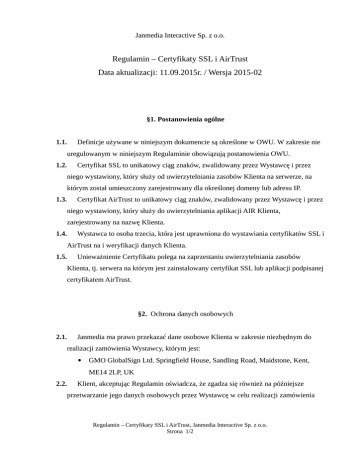 Janmedia Interactive Sp. z o.o. Regulamin – Certyfikaty SSL i AirTrust Data aktualizacji: 11.09.2015r. / Wersja 2015-02 §1. Postanowienia ogólne 1.1. Definicje używane w niniejszym dokumencie są określone w OWU. W zakresie nie uregulowanym w niniejszym Regulaminie obowiązują postanowienia OWU. 1.2. Certyfikat SSL to unikatowy ciąg znaków, zwalidowany przez Wystawcę i przez niego wystawiony, który służy od uwierzytelniania zasobów Klienta na serwerze, na którym został umieszczony zarejestrowany dla określonej domeny lub adresu IP. 1.3. Certyfikat AirTrust to unikatowy ciąg znaków, zwalidowany przez Wystawcę i przez niego wystawiony, który służy do uwierzytelniania aplikacji AIR Klienta, zarejestrowany na nazwę Klienta. 1.4. Wystawca to osoba trzecia, która jest uprawniona do wystawiania certyfikatów SSL i AirTrust na i weryfikacji danych Klienta. 1.5. Unieważnienie Certyfikatu polega na zaprzestaniu uwierzytelniania zasobów Klienta, tj. serwera na którym jest zainstalowany certyfikat SSL lub aplikacji podpisanej certyfikatem AirTrust. §2. Ochrona danych osobowych 2.1. Janmedia ma prawo przekazać dane osobowe Klienta w zakresie niezbędnym do realizacji zamówienia Wystawcy, którym jest: GMO GlobalSign Ltd. Springfield House, Sandling Road, Maidstone, Kent, ME14 2LP, UK 2.2. Klient, akceptując Regulamin oświadcza, że zgadza się również na późniejsze przetwarzanie jego danych osobowych przez Wystawcę w celu realizacji zamówienia Regulamin – Certyfikaty SSL i AirTrust, Janmedia Interactive Sp. z o.o. Strona 1/2 §3. Zamówienie Certyfikatu 3.1. Zamówienie Certyfikatu odbywa się poprzez wypełnienie formularza na stronie internetowej Janmedia. 3.2. Janmedia zobowiązuje się wystąpić do Wystawcy o wystawienie certyfikatu zamówionego przez Klienta, pod warunkiem otrzymania wpłaty tytułem realizacji zamówienia. 3.3. Klient będący Konsumentem oświadcza, że żąda wystąpienia przez Janmedia do Wystawcy o wystawienie Certyfikatu przed upływem 14 dni od daty prawidłowo złożonego zamówienia i tym samym świadomie rezygnuje z konsumenckiego prawa odstąpienia od Umowy w ciągu 14 dni bez podawania przyczyny. 3.4. Certyfikat jest wystawiany przez Wystawcę po przeprowadzeniu procesu weryfikacji danych przekazanych przez Klienta w formularzu zamówienia. Janmedia nie gwarantuje pomyślnego zakończenia procesu weryfikacji przeprowadzanej przez Wystawcę. 3.5. W trakcje weryfikacji danych przez Wystawcę, może on zażądać od Klienta przedstawienia dokumentów potwierdzających dane Klienta. 3.6. W przypadku zakończenia procesu weryfikacji danych przez Wystawcę niepowodzeniem, wpłata za zamówiony Certyfikat zostaje zwrócona Klientowi w terminie do 14 dni po zakończeniu procesu weryfikacji. 3.7. Po pozytywnym zakończeniu procesu weryfikacji przez Wystawcę, zamówiony przez Klienta Certyfikat zostanie wysłany na adres e-mail wskazany przez Klienta. 3.8. Okres abonamentowy rozpoczyna się od momentu wystawienia Certyfikaty przez Wystawcę. Regulamin – Certyfikaty SSL i AirTrust, Janmedia Interactive Sp. z o.o. Strona 2/2