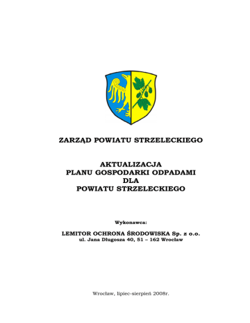 ZARZĄD POWIATU STRZELECKIEGO AKTUALIZACJA PLANU GOSPODARKI ODPADAMI DLA POWIATU STRZELECKIEGO Wykonawca: LEMITOR OCHRONA ŚRODOWISKA Sp. z o.o. ul. Jana Długosza 40, 51 – 162 Wrocław Wrocław, lipiec-sierpień 2008r. Aktualizacja Planu Gospodarki Odpadami dla Powiatu Strzelce Opolskie 2 __________________________________________________________________________________________ __________________________________________________________________________________________ LEMITOR Ochrona Środowiska Sp. z o.o., ul. Jana Długosza 40, 51 - 162 Wrocław Aktualizacja Planu Gospodarki Odpadami dla Powiatu Strzelce Opolskie 3 __________________________________________________________________________________________ Spis treści: 1. WSTĘP............................................................................................ 5 2. METODYKA OPRACOWANIA............................................................ 6 3. CHARAKTERYSTYKA POWIATU ...................................................... 8 3.1. Ogólna charakterystyka. PołoŜenie administracyjne .......................8 3.2. PołoŜenie geograficzne i ukształtowanie terenu ..............................8 3.3. Budowa geologiczna. Hydrogeologia i hydrologia ............................9 3.4. Społeczność lokalna ....................................................................12 3.5. Warunki glebowe i rolnictwo ........................................................13 3.6. Przemysł......................................................................................14 3.7. Transport i komunikacja .............................................................15 3.8. Przyroda, obszary podlegające ochronie, zabytki ..........................17 3.9. Turystyka i rekreacja ...................................................................18 3.10. Strategia rozwoju Powiatu............................................................19 4. CHARAKTERYSTYKA I ANALIZA AKTUALNEGO STANU GOSPODARKI ODPADAMI W POWIECIE................................................................22 4.1. Odpady komunalne .....................................................................22 4.1.1. Źródła powstawania odpadów .................................................23 4.1.2. Ilość wytwarzanych odpadów komunalnych z wyodrębnieniem ilości odpadów biodegradowalnych ..........................................23 4.1.3. Instalacje do odzysku i unieszkodliwienia odpadów komunalnych..........................................................................26 4.1.4. Składowiska eksploatowane ....................................................27 4.1.5. Składowiska nieeksploatowane, zamykane, rekultywowane .....30 4.1.6. „Dzikie wysypiska” odpadów ...................................................34 4.1.7. Aktualny system gospodarowania odpadami komunalnymi na terenie Powiatu Strzeleckiego ..................................................34 4.1.8. Zidentyfikowane problemy ......................................................35 4.2. Odpady niebezpieczne .................................................................36 4.2.1. Odpady zawierające PCB.........................................................41 4.2.2. Oleje odpadowe.......................................................................42 4.2.3. ZuŜyte baterie i akumulatory ..................................................44 4.2.4. Odpady medyczne i weterynaryjne ..........................................45 4.2.5. Pojazdy wycofane z eksploatacji ..............................................47 4.2.6. ZuŜyty sprzęt elektryczny i elektroniczny.................................50 4.2.7. Odpady zawierające azbest......................................................54 4.2.8. Przeterminowane pestycydy ....................................................57 4.2.9. Odpady zbędnych środków bojowych ......................................59 4.3. Odpady pozostałe – inne niŜ niebezpieczne i komunalne ..............60 4.3.1. ZuŜyte opony ..........................................................................60 4.3.2. Komunalne osady ściekowe.....................................................61 4.3.3. Odpady z budowy, remontów i demontaŜu obiektów budowlanych oraz infrastruktury drogowej .............................63 4.3.4. Odpady opakowaniowe............................................................64 __________________________________________________________________________________________ LEMITOR Ochrona Środowiska Sp. z o.o., ul. Jana Długosza 40, 51 - 162 Wrocław Aktualizacja Planu Gospodarki Odpadami dla Powiatu Strzelce Opolskie 4 __________________________________________________________________________________________ 4.3.5. Odpady z wybranych gałęzi przemysłu, których zagospodarowanie stwarza problemy .......................................65 4.3.6. Odpady z wypadków i powaŜnych awarii .................................70 4.3.7. Instalacje do zagospodarowania odpadów innych niŜ niebezpieczne i komunalne .....................................................71 4.3.8. Składowiska odpadów przemysłowych.....................................74 4.4. Wykaz podmiotów prowadzących działalność w zakresie zbierania i transportu odpadów ...............................................................................77 5. PROGNOZA ZMIAN W ZAKRESIE GOSPODARKI ODPADAMI. ...........79 5.1. 5.2. 5.3. 5.4. Odpady komunalne .....................................................................79 Odpady niebezpieczne .................................................................84 Odpady inne niŜ komunalne i niebezpieczne ................................87 Wyzwania i problemy ...................................................................90 6. ZAŁOśONE CELE I PRZYJĘTY SYSTEM GOSPODARKI ODPADAMI W PERSPEKTYWIE KRÓTKO- I DŁUGOTERMINOWEJ .........................91 6.1. Odpady komunalne .....................................................................93 