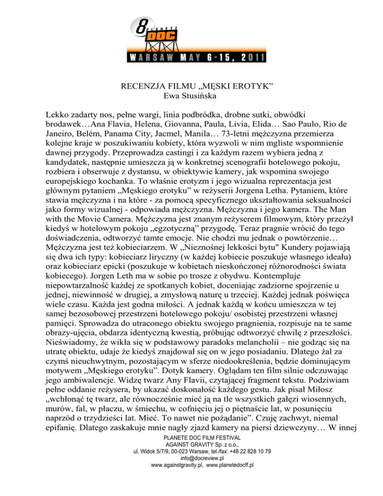 RECENZJA FILMU „MĘSKI EROTYK” Ewa Stusińska Lekko zadarty nos, pełne wargi, linia podbródka, drobne sutki, obwódki brodawek…Ana Flavia, Helena, Giovanna, Paula, Livia, Elida… Sao Paulo, Rio de Janeiro, Belém, Panama City, Jacmel, Manila… 73-letni męŜczyzna przemierza kolejne kraje w poszukiwaniu kobiety, która wyzwoli w nim mgliste wspomnienie dawnej przygody. Przeprowadza castingi i za kaŜdym razem wybiera jedną z kandydatek, następnie umieszcza ją w konkretnej scenografii hotelowego pokoju, rozbiera i obserwuje z dystansu, w obiektywie kamery, jak wspomina swojego europejskiego kochanka. To właśnie erotyzm i jego wizualna reprezentacja jest głównym pytaniem „Męskiego erotyku” w reŜyserii Jorgena Letha. Pytaniem, które stawia męŜczyzna i na które - za pomocą specyficznego ukształtowania seksualności jako formy wizualnej - odpowiada męŜczyzna. MęŜczyzna i jego kamera. The Man with the Movie Camera. MęŜczyzna jest znanym reŜyserem filmowym, który przeŜył kiedyś w hotelowym pokoju „egzotyczną” przygodę. Teraz pragnie wrócić do tego doświadczenia, odtworzyć tamte emocje. Nie chodzi mu jednak o powtórzenie… MęŜczyzna jest teŜ kobieciarzem. W „Nieznośnej lekkości bytu" Kundery pojawiają się dwa ich typy: kobieciarz liryczny (w kaŜdej kobiecie poszukuje własnego ideału) oraz kobieciarz epicki (poszukuje w kobietach nieskończonej róŜnorodności świata kobiecego). Jorgen Leth ma w sobie po trosze z obydwu. Kontempluje niepowtarzalność kaŜdej ze spotkanych kobiet, doceniając zadziorne spojrzenie u jednej, niewinność w drugiej, a zmysłową naturę u trzeciej. KaŜdej jednak poświęca wiele czasu. KaŜda jest godna miłości. A jednak kaŜdą w końcu umieszcza w tej samej bezosobowej przestrzeni hotelowego pokoju/ osobistej przestrzeni własnej pamięci. Sprowadza do utraconego obiektu swojego pragnienia, rozpisuje na te same obrazy-ujęcia, obdarza identyczną kwestią, próbując odtworzyć chwilę z przeszłości. Nieświadomy, Ŝe wikła się w podstawowy paradoks melancholii – nie godząc się na utratę obiektu, udaje Ŝe kiedyś znajdował się on w jego posiadaniu. Dlatego Ŝal za czymś nieuchwytnym, pozostającym w sferze niedookreślenia, będzie dominującym motywem „Męskiego erotyku”. Dotyk kamery. Oglądam ten film silnie odczuwając jego ambiwalencje. Widzę twarz Any Flavii, czytającej fragment tekstu. Podziwiam pełne oddanie reŜysera, by ukazać doskonałość kaŜdego gestu. Jak pisał Miłosz „wchłonąć tę twarz, ale równocześnie mieć ją na tle wszystkich gałęzi wiosennych, murów, fal, w płaczu, w śmiechu, w cofnięciu jej o piętnaście lat, w posunięciu naprzód o trzydzieści lat. Mieć. To nawet nie poŜądanie”. Czuję zachwyt, niemal epifanię. Dlatego zaskakuje mnie nagły zjazd kamery na piersi dziewczyny… W innej PLANETE DOC FILM FESTIVAL AGAINST GRAVITY Sp. z o.o., ul. Widok 5/7/9, 00-023 Warsaw, tel./fax: +48 22 828 10 79 [email protected] www.againstgravity.pl, www.planetedocff.pl scenie ustawiona na wysokości pasa kamera rejestruje poufałą rozmowę dwóch męŜczyzn. Słyszę wypowiedź o sposobie przekonania kobiet do wzięcia udziału w ”niepornograficznym” filmie. Rechot. Obserwuję obsceniczne gesty. Bunga bunga? Mierzi mnie, odrzuca ta męska perspektywa. To juŜ nie erotyzm, ale pornografia: pokawałkowane naiwne kobiece ciała wydane na pastwę lubieŜnego starca. Ich anonimowość, nagość, powtarzalność. A jednocześnie widzę, jak Leth sam się obnaŜa, umieszczając swoje starcze ciało w obiektywie kamery. Jak pragnie zgłębić tajemnicę erotyzmu, podejmując ryzyko zarówno w wymiarze ludzkim, gdy wchodzi w rolę kochanka (czy widzi, Ŝe kobieta pod nim udaje?), jak i artystycznym, gdy próbuje przekroczyć granice poznania. Jego kamera cały czas szuka właściwej odległości. Będąc za daleko ryzykuje nadmiernym krytycyzmem ze strony widza, za blisko – pornograficznym odbiorem. Niczym pieszczota – o której pisał Zygmunt Bauman – „w kaŜdym momencie ryzykuje ruch zbyt szorstki, uścisk tak mocny, Ŝe bolesny; to znów – oddalenie cielesne, poślizg dłoni zbyt pobieŜny i zdawkowy, by doznanie pieszczoty wywołać”. Jak przedstawić erotyzm? Oglądam ten film pełen sprzeczności, balansujący pomiędzy męskim obiektywem kamery a kobiecym ciałem, intencją reŜysera a recepcją widza, krytycyzmem a pornografią, gwałtem a obojętnością. „Dlaczego wzrok nie ma siły absolutnej?”. PLANETE DOC FILM FESTIVAL AGAINST GRAVITY Sp. z o.o., ul. Widok 5/7/9, 00-023 Warsaw, tel./fax: +48 22 828 10 79 [email protected] www.againstgravity.pl, www.planetedocff.pl