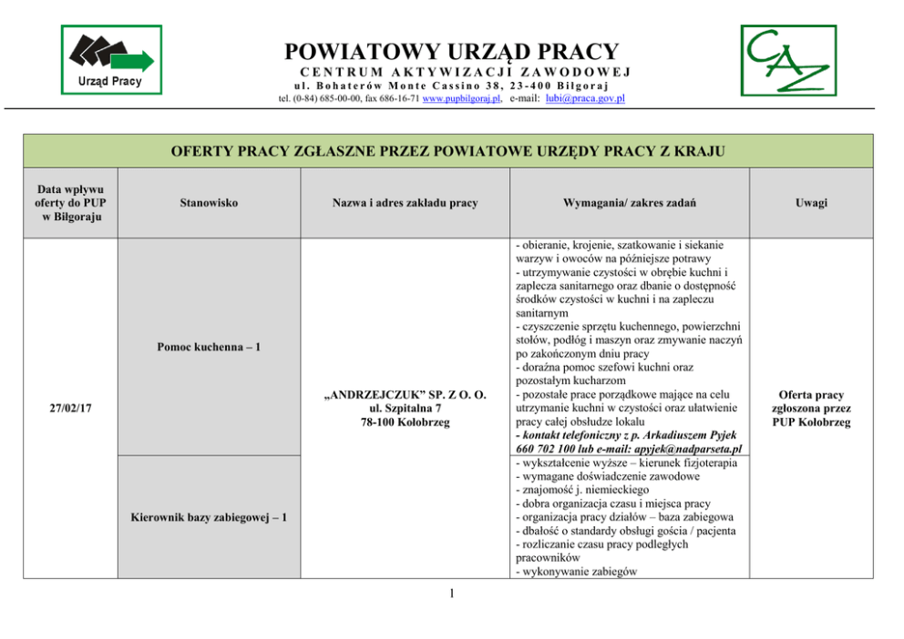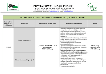 POWIATOWY URZĄD PRACY CENTRUM AKTYWIZACJI ZAWODOWEJ ul. Bohaterów Monte Cassino 38, 23-400 Biłgoraj tel. (0-84) 685-00-00, fax 686-16-71 www.pupbilgoraj.pl, e-mail: [email protected] OFERTY PRACY ZGŁASZNE PRZEZ POWIATOWE URZĘDY PRACY Z KRAJU Data wpływu oferty do PUP w Biłgoraju Stanowisko Nazwa i adres zakładu pracy Wymagania/ zakres zadań Uwagi „ANDRZEJCZUK” SP. Z O. O. ul. Szpitalna 7 78-100 Kołobrzeg - obieranie, krojenie, szatkowanie i siekanie warzyw i owoców na późniejsze potrawy - utrzymywanie czystości w obrębie kuchni i zaplecza sanitarnego oraz dbanie o dostępność środków czystości w kuchni i na zapleczu sanitarnym - czyszczenie sprzętu kuchennego, powierzchni stołów, podłóg i maszyn oraz zmywanie naczyń po zakończonym dniu pracy - doraźna pomoc szefowi kuchni oraz pozostałym kucharzom - pozostałe prace porządkowe mające na celu utrzymanie kuchni w czystości oraz ułatwienie pracy całej obsłudze lokalu - kontakt telefoniczny z p. Arkadiuszem Pyjek 660 702 100 lub e-mail: [email protected] - wykształcenie wyższe – kierunek fizjoterapia - wymagane doświadczenie zawodowe - znajomość j. niemieckiego - dobra organizacja czasu i miejsca pracy - organizacja pracy działów – baza zabiegowa - dbałość o standardy obsługi gościa / pacjenta - rozliczanie czasu pracy podległych pracowników - wykonywanie zabiegów Oferta pracy zgłoszona przez PUP Kołobrzeg Pomoc kuchenna – 1 27/02/17 Kierownik bazy zabiegowej – 1 1 - komunikacja / opieka nad gościem / pacjentem - kontakt telefoniczny z p. Arkadiuszem Pyjek 660 702 100 lub e-mail: [email protected] - wykształcenie średnie - mile widziane doświadczenie zawodowe - znajomość j. niemieckiego - obsługa recepcji w tym gości niemieckojęzycznych - obsługa programów komputerowych - kontakt telefoniczny z p. Arkadiuszem Pyjek 660 702 100 lub e-mail: [email protected] - mile widziane doświadczenie zawodowe - podstawowa znajomość j. niemieckiego - utrzymywanie w nienagannej kondycji i czystości pokoje wynajmowane klientom hotelu - sprzątanie pomieszczeń ogólnodostępnych zaplecza oraz ciągów komunikacyjnych w hotelach zgodnie z wymogami i standardami hotelu - kontakt telefoniczny z p. Arkadiuszem Pyjek 660 702 100 lub e-mail: [email protected] Recepcjonista – 1 Pokojowa – 1 27/02/17 Fizjoterapeuta – 1 Niepubliczny Zakład Opieki Zdrowotnej Spec – Med. ul. Na Wydmie 5a, 76-270 Ustka tel. 601 777 311 24/02/17 Pracownik budowlany – 2 FRANKI Polska Sp. z o. o. ul. Jasnogórska 44 31-358 Kraków Tel. 500 056 227 e-mail: [email protected] 23/02/17 Terapeuta pracowni plastycznej 1 Środowiskowy Dom Samopomocy Zwierzyniec 22-470 Sochy 59 2 - wykształcenie wyższe min. licencjackie - umiejętności w zawodzie - mile widziane wykształcenie średnie zawodowe - prawo jazdy kat. B - mile widziane doświadczenie w kierowaniu/ operowaniu maszynami budowlanymi - posiadanie odpowiednich kursów i uprawnień - w przypadku braku uprawnień pracodawca zapewnia przeszkolenie - prace ogólnobudowlane i wsparcie przy robotach ziemnych - obsługa maszyn budowlanych (głównie ładowarka) -wykształcenie wyższe, -umiejętności plastyczne, -doświadczenie w zawodzie 6 m-cy polegające Oferta pracy zgłoszona przez PUP Słupsk Oferta pracy zgłoszona przez MUP Lublin Oferta pracy zgłoszona przez PUP Zamość tel. 84 687 30 82 e-mail: [email protected] 21/02/17 20/02/17 Arborysta-pilarz- 1 Puss&Piast Anna Piastowicz ul. Gdańska 12/2 59-100 Polkowice Te4l. 601 942 714 Pracownik gospodarczy - 1 Rezydencja Leśna Jabłówko Sp. z o.o. Jabłówko 45 83-212 Jabłówko e-mail: [email protected] Krawcowa - 4 17/02/17 Klejarz - 3 EMILIA MEBLE SP. Z O. O. ul. Polwicka 16 63-020 Łękno tel. 61 285 24 60 na realizacji usług dla osób z zaburzeniami psychicznymi -prowadzenie terapii terapeutycznych zajęciowej w pracowni plastycznej, -miejsce wykonywania pracy: województwo dolnośląskie, -wycinka, przycinka drzew, krzewów i podrostów pod linami wysokiego napięcia (SN), -wykształcenie zawodowe, -mile widziane prawo jazdy kat. B, -mile widziane uprawnienia arborystyczne, -wymagane umiejętności pilarskie i arborystyczne, -umiejętność obsługi ciągnika rolniczego, -umiejętność obsługi kosiarki rotacyjnej, -prace w rolnictwie, -konserwacja budynków i urządzeń, -wykaszanie w sezonie trawy kosiarką rotacyjną, -zarządzanie akwenem wodnym 4ha (gospodarka rybami), -drobne prace leśne, -mile widziane zainteresowanie małą hodowlą gołębi pocztowych, -pracodawca poszukuje najchętniej pary, która umiałaby się zająć obiektem (24ha) w sposób kwalifikowany, -możliwość prowadzenia agroturystyki, - wykształcenie zasadnicze zawodowe - doświadczenie 3-letnie w zawodzie - umiejętność pracy w zespole - wykształcenie zasadnicze zawodowe - doświadczenie 3-letnie w zawodzie operator sklejarek płyt stolarskich - umiejętność pracy w zespole - wykształcenie zasadnicze zawodowe - doświadczenie 3-letnie w zawodzie - umiejętność pracy w zespole Tapicer – 6 3 Oferta pracy zgłoszona przez PUP Polkowice Oferta pracy zgłoszona przez PUP Starograd Oferta pracy zgłoszona przez PUP Środa Wielkopolska Nabijacz – 2 - wykształcenie zasadnicze zawodowe - doświadczenie w zawodzie - umiejętność pracy w zespole Stolarz – 5 - wykształcenie zasadnicze zawodowe - doświadczenie 3-letnie w zawodzie - umiejętność pracy w zespole 17/02/17 Specjalistyczne usługi opiekuńcze dla osób z zaburzeniami psychicznymi - 1 OŚRODEK POMOCY SPOŁECZNEJ Harasiuki 112A 37-413 Harasiuki tel. (15) 879 13 64 14/02/17 Kierowca samochodu ciężarowego pow. 3,5 t (dział krajowy)- 5 Przedsiębiorstwo Komunikacji Samochodowej S.A. Żary ul. Okrzei 31-33 68-200 Żary Tel. (68) 470 81 15 Opiekunka osób starszych- 5 Sowa Pflege24 Sławomir Sobolewski Ul. Piaski 9 07-202 Kamieńczyk Tel. 735 998 777 e-mail: [email protected] www.sowapflege24.pl 13/02/17 4 -wymiar czasu pracy: 2 godziny dziennie 