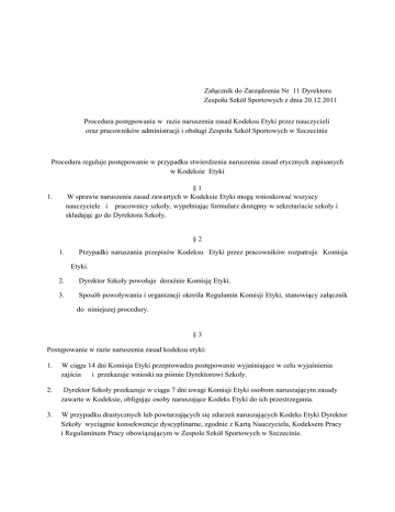 Załącznik do Zarządzenia Nr 11 Dyrektora Zespołu Szkół Sportowych z dnia 20.12.2011 Procedura postępowania w razie naruszenia zasad Kodeksu Etyki przez nauczycieli oraz pracowników administracji i obsługi Zespołu Szkół Sportowych w Szczecinie Procedura reguluje postępowanie w przypadku stwierdzenia naruszenia zasad etycznych zapisanych w Kodeksie Etyki §1 W sprawie naruszenia zasad zawartych w Kodeksie Etyki mogą wnioskować wszyscy nauczyciele i pracownicy szkoły, wypełniając formularz dostępny w sekretariacie szkoły i składając go do Dyrektora Szkoły. 1. §2 1. Przypadki naruszania przepisów Kodeksu Etyki przez pracowników rozpatruje Komisja Etyki. 2. Dyrektor Szkoły powołuje doraźnie Komisję Etyki. 3. Sposób powoływania i organizacji określa Regulamin Komisji Etyki, stanowiący załącznik do niniejszej procedury. §3 Postępowanie w razie naruszenia zasad kodeksu etyki: 1. W ciągu 14 dni Komisja Etyki przeprowadza postępowanie wyjaśniające w celu wyjaśnienia zajścia i przekazuje wnioski na piśmie Dyrektorowi Szkoły. 2. Dyrektor Szkoły przekazuje w ciągu 7 dni uwagi Komisji Etyki osobom naruszającym zasady zawarte w Kodeksie, obligując osoby naruszające Kodeks Etyki do ich przestrzegania. 3. W przypadku drastycznych lub powtarzających się zdarzeń naruszających Kodeks Etyki Dyrektor Szkoły wyciągnie konsekwencje dyscyplinarne, zgodnie z Kartą Nauczyciela, Kodeksem Pracy i Regulaminem Pracy obowiązującym w Zespole Szkół Sportowych w Szczecinie. Załącznik Nr 1 Procedury … REGULAMIN KOMISJI ETYKI §1 1. Dyrektor szkoły powołuje doraźnie Komisję Etyki w ciągu 7 dni od uzyskania informacji o naruszeniu przez pracowników Szkoły zasad Kodeksu Etyki. 2. Komisja składa się z 3 osób wyłonionych z nauczycieli i pracowników administracji i obsługi. 3. Przewodniczącego Komisji Etyki wyznacza Dyrektor spośród członków Komisji. 4. Członek Komisji Etyki podlega wyłączeniu, gdy postępowanie dotyczy jego lub bezpośredniego przełożonego. §2 1. Do zadań Komisji Etyki należy: 1) prowadzenie postępowania wyjaśniającego w przypadku powzięcia informacji o naruszeniu norm etycznych przez pracowników Szkoły; 2) przedstawianie Dyrektorowi wniosków o zastosowanie sankcji dyscyplinujących wobec naruszających normy etyczne pracowników Szkoły w celu przywrócenia zachowania zgodnego z normami. §3 1. Komisja Etyki obraduje na posiedzeniach, z których sporządzany jest protokół. 2. Dla prawomocności obrad niezbędny jest udział przynajmniej połowy członków Komisji Etyki. 3. Komisja rozstrzyga sprawy zwykłą większością głosów, a przy równej liczbie głosów „za” i „przeciw” decyduje głos Przewodniczącego Komisji Etyki. §4 1. Komisja Etyki wszczyna postępowanie wyjaśniające w sytuacjach nie budzących wątpliwości i możliwych do zweryfikowania informacji o naruszeniu norm etycznych przez pracownika Szkoły. 2. Przed powzięciem decyzji o przedstawieniu Dyrektorowi wniosku o zastosowaniu sankcji dyscyplinujących Komisja jest obowiązana umożliwić pracownikowi złożenie wyjaśnień. Załącznik Nr 2 Procedury … ………….................... imię i nazwisko ……………………………….. data ……………………………………. adres zamieszkania …………………………………… telefon Dyrektor Zespołu Szkół Sportowych w Szczecinie OPIS ZDARZENIA : …………………………………………………………………………………………………………. …………………………………………………………………………………………………………. …………………………………………………………………………………………………………… ……………………………………………………………………………………………………….… ………………………………………………………………………………………………………… …………………………………………………………………………………………………………… …………………………………………………………………………………………………………… …………………………………………………………………………………………………………… …………………………………………………………………………………………………………… …………………………………………………………………………………………………………… …………………………………………………………………………………………………………… …………………………………………………………………………………………………….......... ………………………………………… podpis osoby składającej Zarządzenie Nr 4 Dyrektora Zespołu Szkół Sportowych im. Sportowców Ziemi Szczecińskiej w Szczecinie z dnia 11 stycznia 2017 r. zmieniające zarządzenie Nr 11 Dyrektora Zespołu Szkół Sportowych im Sportowców Ziemi Szczecińskiej z dnia 20 grudnia 2011 r. w sprawie wprowadzenia procedury postępowania w razie naruszenia zasad Kodeksu Etyki przez nauczycieli oraz pracowników administracji i obsługi Zespołu Szkół Sportowych im. Sportowców Ziemi Szczecińskiej w Szczecinie Na podstawie : art. 69 ust. 1 pkt. 3 Ustawy z 27 sierpnia 2009r. o finansach publicznych (tekst jedn.: Dz. U. z 2016 r. poz.1870 z późn.zm.) oraz w związku z zarządzeniem Nr 21 Dyrektora Zespołu Szkół Sportowych im. Sportowców Ziemi Szczecińskiej w Szczecinie z dnia 07.12.2010 r w sprawie wprowadzenia Kodeksu Etyki Pracowników Zespołu Szkół Sportowych im. Sportowców Ziemi Szczecińskiej w Szczecinie zarządzam, co następuje: §1 W zarządzeniu Nr 11 Dyrektora Zespołu Szkół Sportowych im