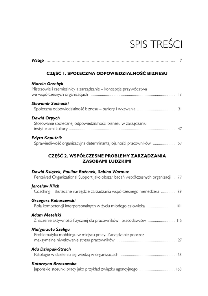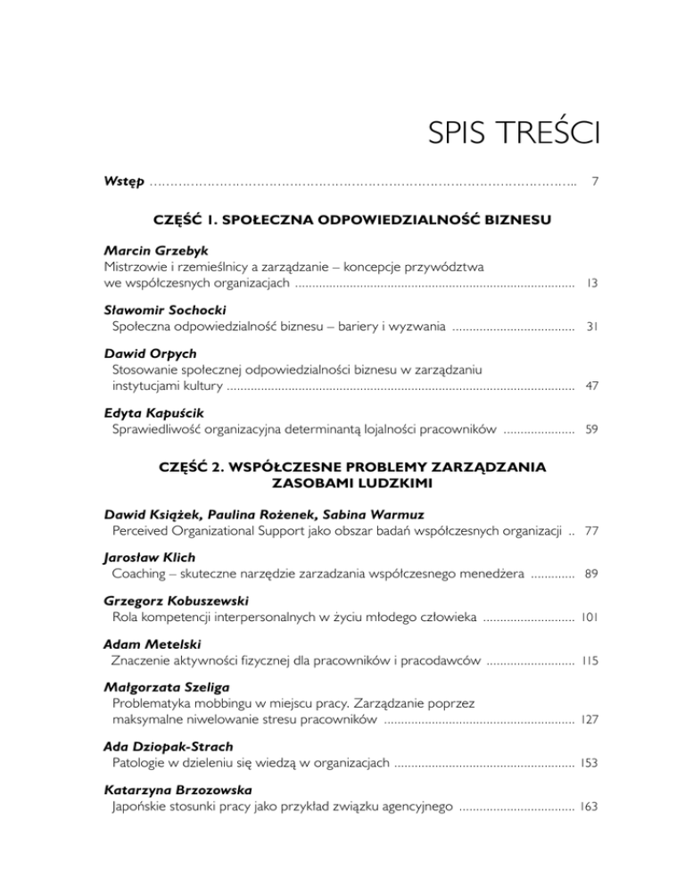 SPIS TREŚCI Wstęp …………………………………………………………………………………………... 7 CZĘŚĆ 1. SPOŁECZNA ODPOWIEDZIALNOŚĆ BIZNESU Marcin Grzebyk Mistrzowie i rzemieślnicy a zarządzanie – koncepcje przywództwa we współczesnych organizacjach ................................................................................... 13 Sławomir Sochocki Społeczna odpowiedzialność biznesu – bariery i wyzwania ..................................... 31 Dawid Orpych Stosowanie społecznej odpowiedzialności biznesu w zarządzaniu instytucjami kultury ...................................................................................................... 47 Edyta Kapuścik Sprawiedliwość organizacyjna determinantą lojalności pracowników ...................... 59 CZĘŚĆ 2. WSPÓŁCZESNE PROBLEMY ZARZĄDZANIA ZASOBAMI LUDZKIMI Dawid Książek, Paulina Rożenek, Sabina Warmuz Perceived Organizational Support jako obszar badań współczesnych organizacji ... 77 Jarosław Klich Coaching – skuteczne narzędzie zarzadzania współczesnego menedżera .............. 89 Grzegorz Kobuszewski Rola kompetencji interpersonalnych w życiu młodego człowieka ............................ 101 Adam Metelski Znaczenie aktywności fizycznej dla pracowników i pracodawców ........................... 115 Małgorzata Szeliga Problematyka mobbingu w miejscu pracy. Zarządzanie poprzez maksymalne niwelowanie stresu pracowników ......................................................... 127 Ada Dziopak-Strach Patologie w dzieleniu się wiedzą w organizacjach . .................................................... 153 Katarzyna Brzozowska Japońskie stosunki pracy jako przykład związku agencyjnego ................................... 163 SPIS TREŚCI Magdalena Kot-Radojewska Praca tymczasowa jako elastyczna forma zatrudnienia w konkurencyjnych warunkach działalności gospodarczej .......................................................................... 171 Jolanta Twardowska Zarządzanie wirtualną załogą – telepraca ................................................................... 187 CZĘŚĆ 3. BADANIA WŁASNE I CASE STUDIES Iwona Małgorzata Kutzner Kierunki ewolucji przedsiębiorstw w gospodarce opartej na wiedzy a propozycja modelu małego przedsiębiorstwa usług szkoleniowych ..................... 207 Beata Klaja-Gaweł Praktyki personalne w organizacji a poziom zaangażowania organizacyjnego, na przykładzie przedsiębiorstwa z branży kolejowej . ............................................... 227 Jolanta Bartkowiak-Stawska Analiza przypadku w badaniach naukowych, dydaktyce oraz zarządzaniu zasobami ludzkimi . .................................................................................. 239 Adam Piontek Analiza kryteriów doboru kandydatów do służby w Policji ....................................... 249 Edyta Wołyniec Nowa perspektywa zarządzania przedsiębiorstwem poprzez pryzmat przynależności do sieci współpracy ............................................................................ 265 Krystian Bień EDOA (Elektroniczny Dziennik Operowania i Administrowania) jak element oceny pracownika działów IT w dużej Instytucji Publicznej .................. 277 6