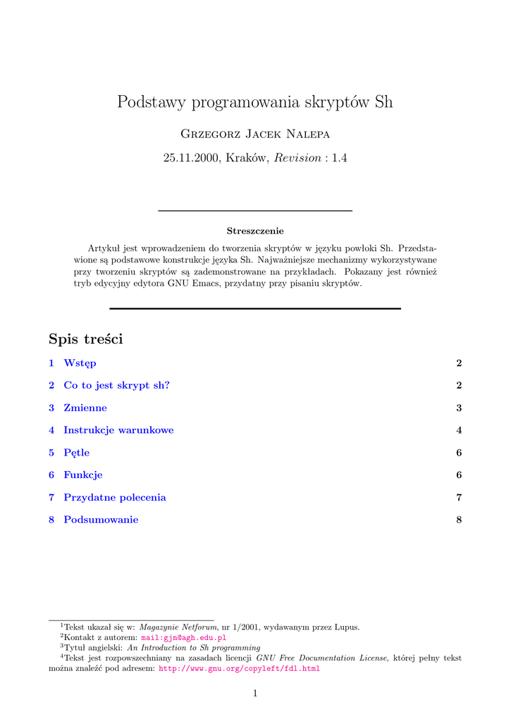 Podstawy programowania skryptów Sh Grzegorz Jacek Nalepa 25.11.2000, Kraków, Revision : 1.4 Streszczenie Artykuł jest wprowadzeniem do tworzenia skryptów w języku powłoki Sh. Przedstawione są podstawowe konstrukcje języka Sh. Najważniejsze mechanizmy wykorzystywane przy tworzeniu skryptów są zademonstrowane na przykładach. Pokazany jest również tryb edycyjny edytora GNU Emacs, przydatny przy pisaniu skryptów. Spis treści 1 Wstęp 2 2 Co to jest skrypt sh? 2 3 Zmienne 3 4 Instrukcje warunkowe 4 5 Pętle 6 6 Funkcje 6 7 Przydatne polecenia 7 8 Podsumowanie 8 1 Tekst ukazał się w: Magazynie Netforum, nr 1/2001, wydawanym przez Lupus. Kontakt z autorem: mail:[email protected] 3 Tytuł angielski: An Introduction to Sh programming 4 Tekst jest rozpowszechniany na zasadach licencji GNU Free Documentation License, której pełny tekst można znaleźć pod adresem: http://www.gnu.org/copyleft/fdl.html 2 1 Grzegorz Jacek Nalepa: 1. Podstawy programowania skryptów Sh Wstęp Prędzej czy później, praktycznie każdy administrator systemu uniksowego zaczyna potrzebować narzędzia programistycznego, które ułatwiłoby jego pracę. Jego wybór często pada na język skryptowy powłoki sh. Podstawowymi cechami takiego narzędzia programistycznego powinny być z jednej strony prostota i łatwość wykorzystania dla osoby, która nie musi być programistą, a z drugiej uniwersalność i duże możliwości. Języki skryptowe są naturalnym wyborem, gdyż nie wymagają dodatkowych narzędzi takich jak na przykład kompilator. Ponieważ są one interpretowane to kod źródłowy programu jest równocześnie kodem wykonywalnym. Pozwala to na stosunkowo łatwe i szybkie pisanie oraz testowanie programów. Aktualnie dostępnych jest wiele zaawansowanych języków skryptowych. Najbardziej znany i często uznawany za najpotężniejszy to zapewne Perl. Popularność zdobywa również nowoczesny, zorientowany obiektowo, Python. Rozpowszechniony jest Tcl wraz ze swoimi rozszerzeniami do tworzenia interfejsów graficznych, takich jak Tk. Język skryptowy powłoki sh nie jest „pełnowartościowym” językiem w takim sensie w jakim są nimi wyżej wymienione języki. Ma najprostsze typy danych i stosunkowo ograniczony zbiór instrukcji. Zapewnia za to rozbudowane mechanizmy komunikacji, które rekompensują brak dodatkowych bibliotek czy modułów. Zaletą sh jest więc w praktyce jego prostota i uniwersalność. Dlatego służy najczęściej do efektywnego i łatwego łączenia pracy standardowych narzędzi uniksowych. Tego typy języki określa się często po angielsku glue languages, czyli językami „sklejającymi” działanie innych narzędzi. 2. Co to jest skrypt sh? Skrypt w języku sh to plik tekstowy zawierający dowolne polecenia wykonywalne oraz wyrażenia języka sh. Tak więc w praktyce nawet prosta sekwencja poleceń, normalnie wydawanych w powłoce sh, zapisana w pliku staje się skryptem. Aby taki skrypt można było wykonywać bezpośrednio poprzez podanie nazwy należy nadać mu atrybut wykonywalności. Wykonywalny plik tekstowy zawierający polecenia jest uruchamiany najczęściej przy pomocy powłoki logowania użytkownika. Aby mieć pewność, że skrypt zostanie uruchomiony przy pomocy odpowiedniego interpretera trzeba to w nim zapisać. Pierwsza linia każdego skryptu powinna mieć postać: #!/pełna_ścieżka/nazwa_interpretera opcje Co w przypadku skryptów sh wygląda następująco: #!/bin/sh Od znaku hash (#) zaczyna się również komentarze w skryptach. Ponieważ skrypty są zwykłymi plikami tekstowymi, do ich pisania może być użyty dowolny edytor. Warto jednak zauważyć, że niektóre edytory mają rozbudowane tryby edycji skryptów sh. Na przykład GNU Emacs ma wbudowany tryb sh-mode, pozwalający na kolorowanie składni skryptu i udostępniający makra do tworzenia najczęściej wykorzystywanych konstrukcji. Przykład pracy z tym trybem jest pokazany na Rysunku 1. Również edytory Vim i mcedit mają tryby edycyjne sh. Do pisania złożonych skryptów potrzebna jest znajomość podstawowych elementów języka sh, takich jak zmienne, metody komunikacji z otoczeniem skryptu, instrukcje sterujące sh i funkcje. Wszystkie te elementy zostaną omówione poniżej. 2 CO TO JEST SKRYPT SH? 2 Grzegorz Jacek Nalepa: Podstawy programowania skryptów Sh Rysunek 1: Tryb sh GNU Emacsa Omawiane przykłady są uruchamiane w środowisku powłoki GNU Bash, będącej prawdopodobnie najlepszą i jedną z najpopularniejszych implementacji sh. Tym niemniej większość z nich powinna działać w innych powłokach zgodnych z sh. 3. Zmienne Podstawowym typem zmiennych używanych przez sh są napisy. Zmienne definiuje się przy pomocy operatora przypisania: zmienna=wartość Wartość zmiennej jest napisem. Nazwa zmiennej może zawierać wielkie i małe litery, z tym że tradycyjnie zmienne środowiskowe powłoki są pisane wielkimi literami. Pomiędzy nazwą, operatorem przypisania, a wartością, nie może być odstępów. Poprzedzając nazwę zmiennej słowem kluczowym export wymusza się jej dziedziczenie przez procesy potomne danej powłoki. Innymi słowy, jeżeli zmienna zostanie zdefiniowana w ten sposób, to będzie ona dostępna dla wszystkich programów uruchomionych z danej powłoki (lub skryptu). Przy definiowaniu i odwoływaniu się do zmiennych przydają się znaki cytowania czyli apostrofy i cudzysłowy. Pozwalają one na przypisywanie napisów składających się z kilku słów. Różnica między nimi polega na tym, że apostrofy wyłączają mechanizm podstawiania nazw zmiennych i znaków specjalnych powłoki, na przykład: $ echo "To jest shell:" "$SHELL" To jest shell: /bin/bash $ echo "To jest shell:" ’$SHELL’ 3 ZMIENNE 3 Grzegorz Jacek Nalepa: Podstawy programowania skryptów Sh To jest shell: $SHELL Przykład pokazuje również jak odwoływać się do wartości zmiennych – poprzez znak dolara. Użyte w przykładzie polecenie powłoki echo służy do wyp
