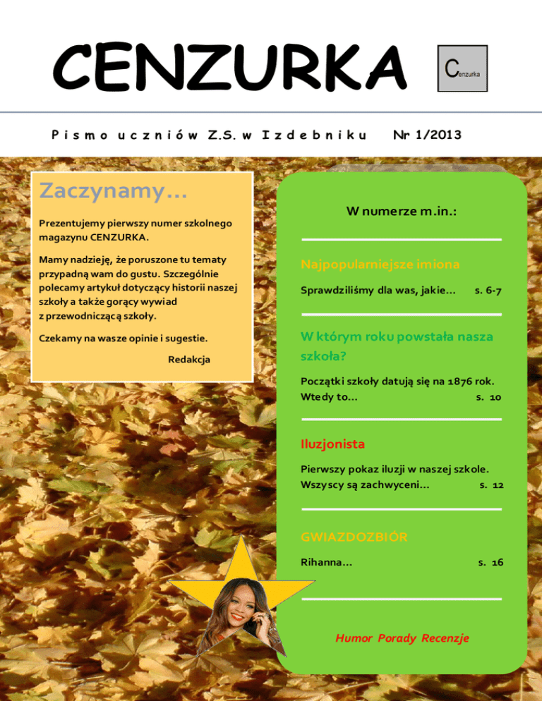 CENZURKA P i s m o u c z n i ó w Z.S. w I z d e b n i k u Nr 1/2013 Zaczynamy… W numerze m.in.: Prezentujemy pierwszy numer szkolnego magazynu CENZURKA. Mamy nadzieję, że poruszone tu tematy przypadną wam do gustu. Szczególnie polecamy artykuł dotyczący historii naszej szkoły a także gorący wywiad z przewodniczącą szkoły. Najpopularniejsze imiona Czekamy na wasze opinie i sugestie. W którym roku powstała nasza szkoła? Redakcja Sprawdziliśmy dla was, jakie… s. 6-7 Początki szkoły datują się na 1876 rok. Wtedy to… s. 10 Iluzjonista Pierwszy pokaz iluzji w naszej szkole. Wszyscy są zachwyceni… s. 12 GWIAZDOZBIÓR Rihanna… Humor Porady Recenzje 1 s. 16 CO W NUMERZE? AKTUALNOŚCI: Zdarzyło się… STYL ŻYCIA 4-5 Najpopularniejsze 6-7 imiona Podruże – Nowy Wiśnicz 8-9 Z historii szkoły 10-11 Co warto przeczytać? 14 Film 15 Gwiazdozbiór 16 Muzyka na topie 17 Sportowo 18 Kącik komputerowyArma 2 19 ROZRYWKA Strefa dziewczyny 20 Kuchnia Oli 12 Ciekawostki/Zagadka 13 2 Imienniczek: Klaudia i Szymon 22 Horoskop 23 Śmiecholandia 24 Zumba Strefa chłopaka 21 Honda MSX 125 WSTĘPNIAK Przedstawiamy pierwszy numer magazynu „Cenzurka”. Pismo redagują uczniowie naszej szkoły. Magazyn będzie się ukazywał kilka razy w roku szkolnym. Gazetka dostępna jest na stronie http://cenzurka.magix.net skąd można ją ściągnąć w formacie PDF i samodzielnie wydrukować. Zapraszamy wszystkich chętnych do współpracy w tworzeniu kolejnych numerów pisma. Czekamy na propozycje tematów, o których chcielibyście przeczytać w „Cenzurce”. Przesyłajcie także swoje artykuły, fotografie i inne prace, jakie chcielibyście opublikować na łamach czasopisma. Materiały prosimy przesyłać na adres [email protected]. Z ostatniej chwili… Tuż przed publikacją tego numeru, w „Cenzurce” doszło do rewolucyjnych zmian w składzie redakcji. Niektórzy autorzy artykułów opublikowanych w pierwszym numerze pisma, zrezygnowali z dalszego uczestnictwa w pracach redakcyjnych. W związku z tym, musieliśmy przeorganizować strukturę redakcji. Może to skutkować zmianami w tematyce kolejnych numerów – pewne działy znikną a pojawią się nowe. Mamy nadzieję, że to zamieszanie na samym początku wydawania „Cenzurki”, przyniesie w dalszym okresie dobre skutki. Co o tym myślisz? Prześlij nam swoje zdanie na ten temat. 3 ZDARZYŁO SIĘ… …w LISTOPADZIE 3 p.n.e. – Według obliczeń Klemensa z Aleksandrii to data narodzin Jezusa Chrystusa. 1190 – Został założony Zakon krzyżacki. 1705 – Król August II Mocny ustanowił Order Orła Białego. 1783 – Pierwszy swobodny lot balonem nad Paryżem.. 1911 – Maria Skłodowska-Curie została laureatką Nagrody Nobla w dziedzinie chemii. 1915 – Albert Einstein sformułował ogólną teorię względności. 1922 – odkryto grobowiec Tutanchamona. czytaj na stronie obok 1918 - Powstał Związek Harcerstwa Polskiego. 1927 – W Tule wyjechał na trasę pierwszy tramwaj elektryczny. 1928 – Wyprodukowano pierwszy film o przygodach Myszki Miki. 1952 – Doświadczalna stacja telewizyjna Instytutu Łączności zainaugurowała nadawanie programu telewizyjnego. Od stycznia 1953 program był nadawany regularnie. 1952 – Próbny wybuch pierwszej bomby wodorowej na atolu Eniwetok. 1956 – Podczas XVI Letnich Igrzysk Olimpijskich w Melbourne Elżbieta Krzesińska zdobyła jedyny złoty medal dla Polski, zwyciężając w finale konkursu skoku w dal. 1957 – Powstało Studio Eksperymentalne Polskiego Radia. 1960 – John Fitzgerald Kennedy wygrywa wybory w USA. 1966 – Polski zespół "Niebiesko-Czarni" został laureatem pierwszej nagrody na festiwalu "mocnego udzerzenia" w Paryżu. 1968 – Formacja The Doors rozpoczęła najbardziej "zadymiarską" w swojej historii trasę koncertową, bedącą ciągiem aresztowań i rozruchów. 1970 – Formacja The Doors wystąpiła po raz ostatni z Jimem Morrisonem. 1979 – Odbyła się premiera płyty The Wall zespołu Pink Floyd. 1984 – Premiera horroru „Koszmar z ulicy Wiązów”. 1988 – Pierwszy europejski Oscar, zwany "Felixem" przypadł Krzysztofowi Kieślowskiemu za "Krótki film o zabijaniu". 1989 – Miss Polonia Aneta Kręglicka zdobyła tytuł Miss World. 1989 – Jesień Ludów: rozpoczęło się burzenie muru berlińskiego. 1990 – Instytut Fizyki Jądrowej w Krakowie otrzymał, jako pierwszy w Polsce, numer IP (192.86.14.). 1990 – Zlikwidowano restrykcje w sprzedaży napojów alkoholowych – wódkę znów można było kupować przed godziną 13:00. 1996 – Ukazała się pierwsza część gry komputerowej Diablo. 1997 – Przyjęcie przez Radę Europy protokołu zakazującego klonowania ludzi. 2000 – Daniel Olbrychski zniszczył szablą kilka fotosów filmowych podczas ekspozycji pracy Naziści. 2000 – Na antenie TVP2 wyemitowano premierowy odcinek serialu M jak miłość. 2000 – Na jednym z forów internetowych pojawił się pierwszy post od Johna Titora, przybyłego z roku 2036 rzekomego podróżnika w czasie. 2000 – Na pokład Międzynarodowej Stacji Kosmicznej przybyła jej pierwsza stała załoga. 2005 - Emitowany w TVP1 Klan osiągnął jako pierwszy polski serial telewizyjny granicę 1000 odcinków. 2007 – Po wygranej 2–0 z reprezentacją Belgii, piłkarska reprezentacja Polski zapewniła sobie pierwszy w historii awans do mistrzostw Europy. 4 Gdy 91 lat temu Howard Carter wybijał łomem dziurę w płycie zamykającej wejście do tajemniczego, egipskiego grobowca, nie mógł przypuszczać, że właśnie tworzy jedną z najbardziej fantastycznych historii związanych ze starożytnym Egiptem. Jesienią 1917 roku rozpoczęto prace, uważane za prawdziwy początek poszukiwania grobowca Tutanchamona. Prace trwały przez pięć lat, podczas których nie osiągnięto znaczących sukcesów, mimo iż pochłonęły one ogromne kwoty a środki i cierpliwość dotychczasowego sponsora zaczynały się kurczyć. Howard Carter miał powody do roz