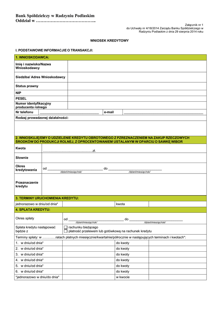 Bank Spółdzielczy w Radzyniu Podlaskim Oddział w ………………………………….. Załącznik nr 1 do Uchwały nr 4/18/2014 Zarządu Banku Spółdzielczego w Radzyniu Podlaskim z dnia 29 sierpnia 2014 roku WNIOSEK KREDYTOWY I. PODSTAWOWE INFORMACJIE O TRANSAKCJI: 1. WNIOSKODAWCA: Imię i nazwisko/Nazwa Wnioskodawcy Siedziba/ Adres Wnioskodawcy Status prawny NIP PESEL Numer identyfikacyjny producenta rolnego Nr telefonu ________________________________ e-mail ___________________________________________ Rodzaj prowadzonej działalności: 2. WNIOSKUJĘ/EMY O UDZIELENIE KREDYTU OBROTOWEGO Z PZREZNACZENIEM NA ZAKUP RZECZOWYCH ŚRODKÓW DO PRODUKCJI ROLNEJ, Z OPROCENTOWANIEM USTALANYM W OPARCIU O SAWKĘ WIBOR Kwota ………………………………………zł. Słownie Okres kredytowania od ______________________________ do _____________________________ /dzień/miesiąc/rok/ /dzień/miesiąc/rok/ Przeznaczenie kredytu 3. TERMINY URUCHOMIENIA KREDYTU: jednorazowo w dniu/od dnia* kwota 4. SPŁATA KREDYTU: Okres spłaty od ______________________________ do _____________________________ /dzień/miesiąc/rok/ Spłata kredytu następować będzie z /dzień/miesiąc/rok/ rachunku bieżącego płatność przelewem lub gotówkową na rachunek kredytu Terminy spłaty: w …………ratach płatnych miesięcznie/kwartalnie/półrocznie w następujących terminach i kwotach*: 1. w dniu/od dnia* do kwoty 2. w dniu/od dnia* do kwoty 3. w dniu/od dnia* do kwoty 4. w dniu/od dnia* do kwoty 5. w dniu/od dnia* do kwoty 6. w dniu/od dnia* do kwoty *jednorazowo w dniu/do dnia* w kwocie 5. SPŁATA ODSETEK: Termin spłaty miesięcznie/kwartalnie, począwszy od dnia _______________ 6. PROPONOWANE ZABEZPIECZENIE: Rodzaj zabezpieczenia Właściciel przedmiotu zabezpieczenia Wartość zabezpieczenia Oszacowanie wartości na podstawie: (polisa, wycena, faktura, inne) II. Oświadczenia 1) Oświadczam/y, że posiadamy/ nie posiadamy* zaległości wobec KRUS, Urzędu Gminy, Urzędu Miasta* objętych/ nie objętych ugodą*. 2) Oświadczam/y, że posiadamy/ nie posiadamy* zaległości wobec innych banków lub towarzystw leasingowych. 3) Oświadczam/y, że wobec nas toczą się/ nie toczą się* lub grożą/ nie grożą* nam postępowania sądowe, administracyjne i inne mogące mieć wpływ na prowadzoną działalność lub zdolność do spłaty zaciągniętych zobowiązań. 4) Oświadczam/y, że została/ nie została* ogłoszona upadłość lub został/ nie został* rozpoczęty proces likwidacji lub postępowania naprawczego lub zawieszenia działalności firmy*. 5) Oświadczamy, że w okresie ostatnich 12 m-cy zostały/ nie zostały* wystawione lub wygasły/ nie wygasły* tytuły egzekucyjne w kwocie przekraczającej 500 zł 6) Oświadczam, że pozostaję/ nie pozostaję* we wspólności majątkowej ze współmałżonkiem/ współmałżonką** 7) Oświadczam/y, że jesteśmy/ nie jesteśmy* członkami Banku Spółdzielczego w Radzyniu Podlaskim i posiadam/y ……. udział/y/ów. 8) Oświadczam/y, że następujące podmioty lub osoby powiązane ze mną organizacyjnie, personalnie są/ nie są* członkami Banku Spółdzielczego w Radzyniu Podlaskim lub osobami zajmującymi w Banku kierownicze stanowiska lub funkcje w Radzie Nadzorczej lub w Zarządzie Banku: ………………………………………………………………………………………………………………………………………… 9) Przyjmuję do wiadomości informację Banku Spółdzielczego w Radzyniu Podlaskim z siedzibą w Radzyniu Podlaskim, przy ul. Ostrowieckiej 35, 21-300 Radzyń Podlaski, że: 1) Bank Spółdzielczy w Radzyniu Podlaskim będzie administratorem moich danych osobowych w rozumieniu ustawy z dnia 29 sierpnia 1997r. o ochronie danych osobowych (tekst jednolity Dz. U. z 2002r. Nr 101, poz. 926, z późn. zm.), 2) dane te przetwarzane będą przez Bank Spółdzielczy w Radzyniu Podlaskim w celu rozpatrzenia niniejszego wniosku oraz zawarcia i realizacji umowy o udzielenie kredytu, a także w celach określonych w art. 23 ust. 1 pkt 5 ustawy o ochronie danych osobowych, 3) Bank Spółdzielczy w Radzyniu Podlaskim nie będzie udostępniać tych danych innym podmiotom, z wyjątkiem podmiotów i okoliczności ujawnienia danych przewidzianych w ustawie Prawo bankowe (tekst jednolity Dz. U. z 2012r., poz. 1376, z późn. zm.) oraz innych przepisach powszechnie obowiązujących. W szczególności Bank Spółdzielczy w Radzyniu Podlaskim będzie przekazywał dane do instytucji utworzonych na podstawie art. 105 ust. 4 ustawy Prawo bankowe, w tym do Biura Informacji Kredytowej S.A. z siedzibą w Warszawie przy ul. Modzelewskiego 77A – Biuro Obsługi Klienta przy ul. Postępu 17A, 02-676 Warszawa oraz do Systemu BANKOWY REJESTR, którego administratorem danych jest Związek Banków Polskich z siedzibą w Warszawie, przy ul. Kruczkowskiego 8, przetwarzających dane w celu oceny zdolności kredytowej i analizy ryzyka kredytowego, zgodnie z zasadami określonymi w art. 105 ust.4, ust. 4a i 4d oraz w art. 105a ustawy Prawo bankowe, 4) przysługuje mi prawo do wglądu do danych oraz ich poprawiania zgodnie z art. 32-35 ustawy o ochronie danych osobowych, 5) podanie danych jest dobrowolne. 10) Na podstawie art. 24 ust. 1 ustawy z dnia 9 kwietnia 2010 r. o udostępnianiu informacji gospodarczych i wymianie danych gospodarczych (Dz. U. z 2010r.Nr 81, poz. 530 z późn. zm.) upoważniam Bank Spółdzielczy w Radzyniu Podlaskim do wystąpienia bezpośrednio lub za pośrednictwem Biura Informacji Kredytowej S.A. z siedzibą w Warszawie przy ul. Modzelewskiego 77A - Biuro Obsługi Klienta przy ul. Postępu 17A, 02-676 Warszawa, do biur Informacji gospodarczej o ujawnienie informacji gospodarczych dotyczących moich zobowiązań. 11) Wyrażam zgodę/ nie wyrażam zgody* na gromadzenie, przetwarzanie i udostępnianie przez Bank Spółdzielczy w Radzyniu Podlaskim z siedzibą w Radzyniu Podlaskim przy ul. Ostrowieckiej 35, 21-300 