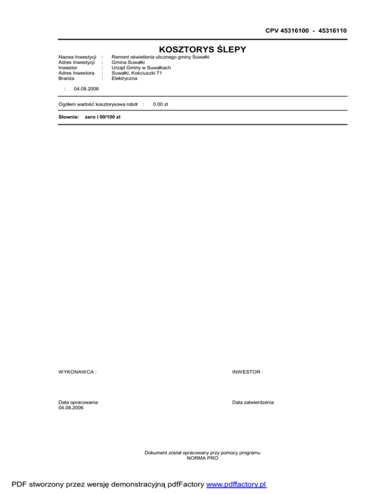 CPV 45316100 - 45316110 KOSZTORYS ŚLEPY Nazwa Inwestycji Adres Inwestycji Inwestor Adres Inwestora Branża : : : : : : Remont oświetlenia ulicznego gminy Suwałki Gmina Suwałki Urząd Gminy w Suwałkach Suwałki, Kościuszki 71 Elektryczna 04.08.2006 Ogółem wartość kosztorysowa robót Słownie: : 0.00 zł zero i 00/100 zł WYKONAWCA : INWESTOR : Data opracowania 04.08.2006 Data zatwierdzenia Dokument został opracowany przy pomocy programu NORMA PRO PDF stworzony przez wersję demonstracyjną pdfFactory www.pdffactory.pl kosztorys ślepy Lp. Podst 1 KNR 4-03 0610-01 KSIĄŻKA PRZEDMIARÓW Opis i wyliczenia j.m. Wymiana opraw rtęciowych oświetlenia zewnętrznego - 1 lampa w oprawie - kpl.opr 1 oprawa na wysięgniku aw 352 kpl.opr aw Poszcz 352.000 RAZEM 2 KNR 4-03 0610-01 Wymiana opraw rtęciowych oświetlenia zewnętrznego - 1 lampa w oprawie - kpl.opr 1 oprawa na wysięgniku aw 190 kpl.opr aw Wymiana opraw rtęciowych oświetlenia zewnętrznego - 1 lampa w oprawie - kpl.opr 1 oprawa na wysięgniku aw 7 kpl.opr aw Wymiana opraw rtęciowych oświetlenia zewnętrznego - 1 lampa w oprawie - kpl.opr 1 oprawa na wysięgniku aw 4 kpl.opr aw Wymiana opraw rtęciowych oświetlenia zewnętrznego - 1 lampa w oprawie - kpl.opr 1 oprawa na wysięgniku aw 2 kpl.opr aw 8 KNR 4-03 0615-02 9 KNR 4-03 0615-02 analogia 10 KNR 4-03 0808-02 11 KNR 4-03 0808-02 12 KNR 4-03 0808-02 13 KNR 4-03 1202-01 5 kpl.opr aw Wymiana przewodów w rurze na słupie lub w słupie przy wys.latarni 10 m jedna oprawa na wysięgniku 2995 m 5.000 m Wymiana jednoramiennych wysięgników oświetlenia zewnętrznego o masie szt. do 30 kg mocowanych na słupie 595 szt. 2995.000 595.000 RAZEM 595.000 5.000 RAZEM 5.000 595.000 RAZEM 595.000 5.000 RAZEM 5.000 595.000 RAZEM 595.000 Demontaż jednoramiennych wysięgników oświetlenia zewnętrznego o masie szt. do 30 kg mocowanych na słupie 5 szt. Wymiana bezpiecznika na słupach przy użyciu podnośnika szt. 595 szt. Demontaż bezpiecznika na słupach przy użyciu podnośnika szt. 5 szt. Zerowanie wysięgnika szt. 595 szt. Sprawdzenie i pomiar kompletnego 1-fazowego obwodu elektrycznego niskiego napięcia 595 pomiar . pomiar . Pierwszy pomiar skutecznosci zerowania pomiar . pomiar . 595 595.000 Utylizacja żródeł światła pomiar . 600 pomiar . -2- Norma PRO Wersja 4.01, Marzec 2003 r. Licencja: 37337 dla Jarek Rejlich PDF stworzony przez wersję demonstracyjną pdfFactory www.pdffactory.pl 595.000 595.000 RAZEM 15 KNR 4-03 1205-05 analogia 5.000 2995.000 RAZEM RAZEM 14 KNR 4-03 1205-05 2.000 Demontaż opraw rtęciowych oświetlenia zewnętrznego - 1 lampa w oprawie kpl.opr - 1 oprawa na wysięgniku aw RAZEM 7 KNR 4-03 0613-03 4.000 2.000 RAZEM 6 KNR 4-03 0610-01 Analogia 7.000 4.000 RAZEM 5 KNR 4-03 0610-01 190.000 7.000 RAZEM 4 KNR 4-03 0610-01 352.000 190.000 RAZEM 3 KNR 4-03 0610-01 Razem 600.000 595.000 kosztorys ślepy Lp. KSIĄŻKA PRZEDMIARÓW Podst 16 KNR 4-03 1205-05 analogia Opis i wyliczenia j.m. Wykonanie dokumentacji pomiar . 600 pomiar . wwykonanie pomiarów pomiar . 600 pomiar . Poszcz RAZEM 600.000 RAZEM 17 KNR 4-03 1205-05 analogia Norma PRO Wersja 4.01, Marzec 2003 r. Licencja: 37337 dla Jarek Rejlich PDF stworzony przez wersję demonstracyjną pdfFactory www.pdffactory.pl 600.000 600.000 RAZEM -3- Razem 600.000 600.000 kosztorys ślepy L Podstawa p. 1 KNR 4-03 0610-01 1* 2* 3* 4* 5* 6* 2 KNR 4-03 0610-01 1* 2* 3* 4* 5* 6* 3 KNR 4-03 0610-01 1* 2* 3* 4* 5* Opis jm Wymiana opraw rtęciowych oświetlenia zewnętrznego - 1 lampa w oprawie - 1 oprawa na wysięgniku obmiar = 352kpl.opraw -- M -oprawy ST50 1szt/kpl.opraw lampy sodowe SONTplus-Pia 50W 1szt/kpl.opraw materiały pomocnicze 4% -- S -samochód dostawczy 0.9 t 0.13m-g/kpl.opraw samochód specjalny liniowy z platformą i balkonem 1.07m-g/kpl.opraw Razem koszty bezpośrednie: Ceny jednostkowe Wymiana opraw rtęciowych oświetlenia zewnętrznego - 1 lampa w oprawie - 1 oprawa na wysięgniku obmiar = 190kpl.opraw R M S r-g 756.8000 0.000 szt 352.0000 0.000 0.00 szt 352.0000 0.000 0.00 % 4.0000 0.000 0.00 m-g 45.7600 0.000 0.00 m-g 376.6400 0.000 0.00 -- M -oprawy ST50' 1szt/kpl.opraw lampy sodowe SONTplus-Pia 70W 1szt/kpl.opraw materiały pomocnicze 4% -- S -samochód dostawczy 0.9 t' 0.13m-g/kpl.opraw samochód specjalny liniowy z platformą i balkonem' 1.07m-g/kpl.opraw Razem koszty bezpośrednie: Ceny jednostkowe Wymiana opraw rtęciowych oświetlenia zewnętrznego - 1 lampa w oprawie - 1 oprawa na wysięgniku obmiar = 7kpl.opraw 0.00 0.000 0.000 0.00 0.000 0.000 kpl.o praw -- R -robocizna' 2.15r-g/kpl.opraw r-g 408.5000 0.000 szt 190.0000 0.000 0.00 szt 190.0000 0.000 0.00 % 4.0000 0.000 0.00 m-g 24.7000 0.000 0.00 m-g 203.3000 0.000 0.00 0.000 0.000 0.00 0.000 0.000 kpl.o praw -- R -robocizna' 2.15r-g/kpl.opraw -- S -samochód dostawczy 0.9 t'' 0.13m-g/kpl.opraw Koszt jedn. kpl.o praw -- R -robocizna' 2.15r-g/kpl.opraw -- M -oprawy ST100/150' 1szt/kpl.opraw lampy sodowe SONTplus_Pia 150 1szt/kpl.opraw materiały pomocnicze 4% Nakłady r-g 15.0500 0.000 szt 7.0000 0.000 0.00 szt 7.0000 0.000 0.00 % 4.0000 0.000 0.00 m-g 0.9100 0.000 -4- Norma PRO Wersja 4.01, Marzec 2003 r. Licencja: 37337 dla Jarek Rejlich PDF stworzony przez wersję demonstracyjną pdfFactory www.pdffactory.pl 0.00 kosztorys ślepy L p. 6* Podstawa 4 KNR 4-03 0610-01 1* 2* 3* 4* 5* 6* 5 KNR 4-03 0610-01 1* 2* 3* 4* 5* 6* 6 KNR 4-03 0610-01 Analogia 1* 2* 3* Opis jm samochód specjalny liniowy z platformą i bal- m-g konem'' 1.07m-g/kpl.opraw Razem koszty bezpośrednie: Ceny jednostkowe Wymiana opraw rtęciowych oświetlenia zekpl.o wnętrznego - 1 lampa w oprawie - 1 oprawa praw na wysięgniku obmiar = 4kpl.opraw -- R -robocizna' 2.15r-g/kpl.opraw -- M -oprawy ST100/100 1szt/kpl.opraw lampy sodowe SONTplus_Pia 150' 1szt/kpl.opraw materiały pomocnicze 4% -- S -samochód dostawczy 0.9 t'' 0.13m-g/kpl.opraw samochód specjalny liniowy z platformą i balkonem'' 1.07m-g/kpl.opraw Razem koszty bezpośrednie: Ceny jednostkowe Wymiana opraw