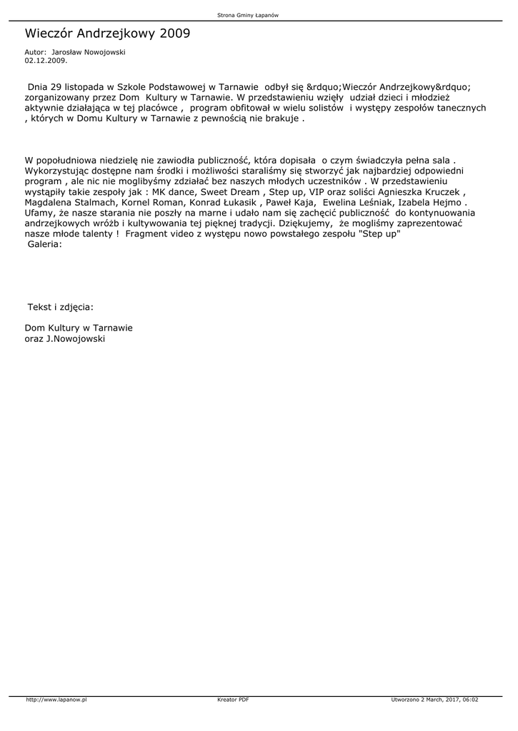 Strona Gminy Łapanów Wieczór Andrzejkowy 2009 Autor: Jarosław Nowojowski 02.12.2009. Dnia 29 listopada w Szkole Podstawowej w Tarnawie odbył się ”Wieczór Andrzejkowy” zorganizowany przez Dom Kultury w Tarnawie. W przedstawieniu wzięły udział dzieci i młodzież aktywnie działająca w tej placówce , program obfitował w wielu solistów i występy zespołów tanecznych , których w Domu Kultury w Tarnawie z pewnością nie brakuje . W popołudniowa niedzielę nie zawiodła publiczność, która dopisała o czym świadczyła pełna sala . Wykorzystując dostępne nam środki i możliwości staraliśmy się stworzyć jak najbardziej odpowiedni program , ale nic nie moglibyśmy zdziałać bez naszych młodych uczestników . W przedstawieniu wystąpiły takie zespoły jak : MK dance, Sweet Dream , Step up, VIP oraz soliści Agnieszka Kruczek , Magdalena Stalmach, Kornel Roman, Konrad Łukasik , Paweł Kaja, Ewelina Leśniak, Izabela Hejmo . Ufamy, że nasze starania nie poszły na marne i udało nam się zachęcić publiczność do kontynuowania andrzejkowych wróżb i kultywowania tej pięknej tradycji. Dziękujemy, że mogliśmy zaprezentować nasze młode talenty ! Fragment video z występu nowo powstałego zespołu "Step up" Galeria: Tekst i zdjęcia: Dom Kultury w Tarnawie oraz J.Nowojowski http://www.lapanow.pl Kreator PDF Utworzono 2 March, 2017, 06:02